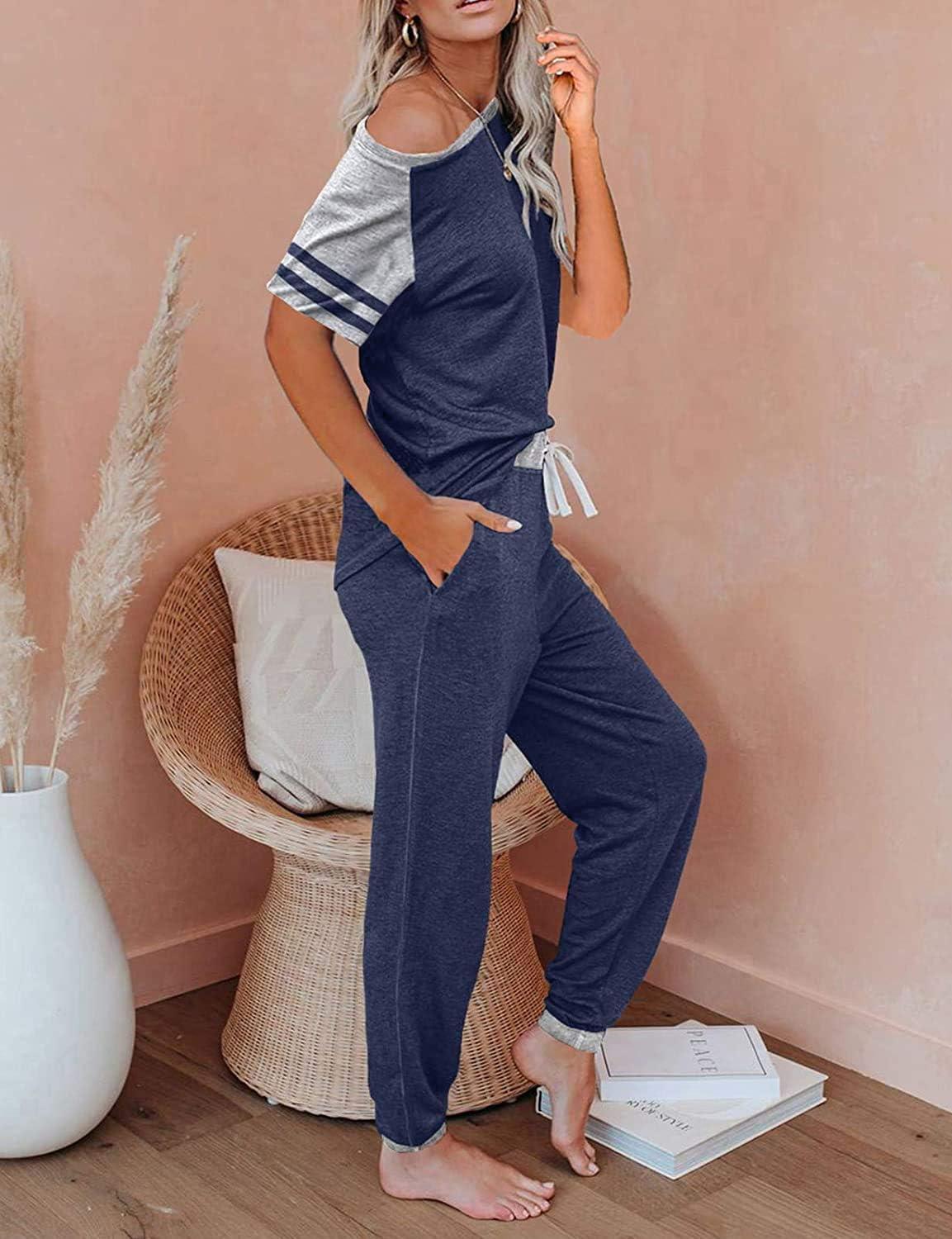 PRETTYGARDEN Women Summer Two Piece Outfits Striped Short Sleeve Pullover and Long Pants Tracksuit Travel Pajama Lounge Set(Z-dark Blue)