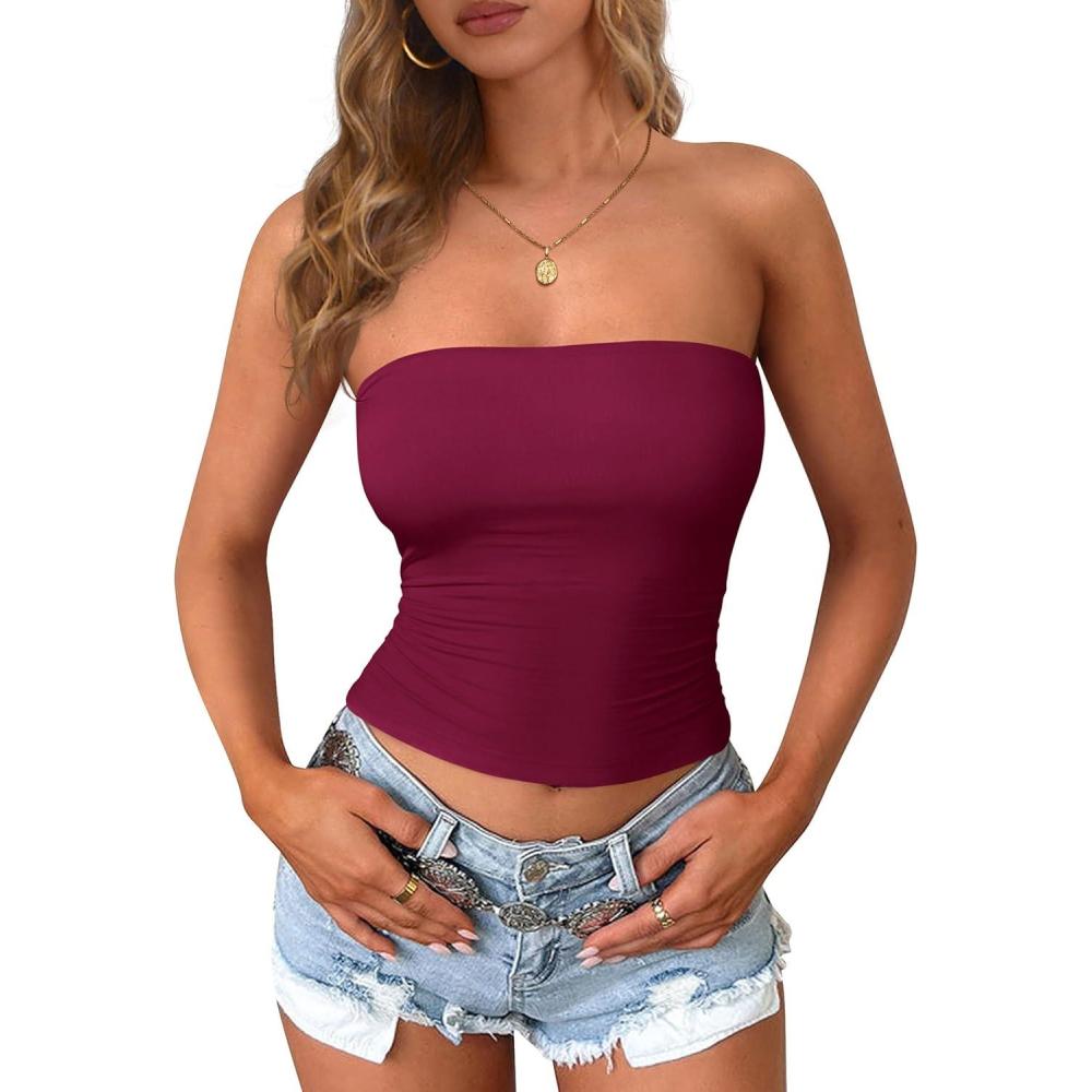 PRETTYGARDEN Women Tube Tops Strapless Going Out Crop Top 2026 Spring Fashion Y2K Summer Bandeau Shirt Beach Vacation Clothes(Wine Red)