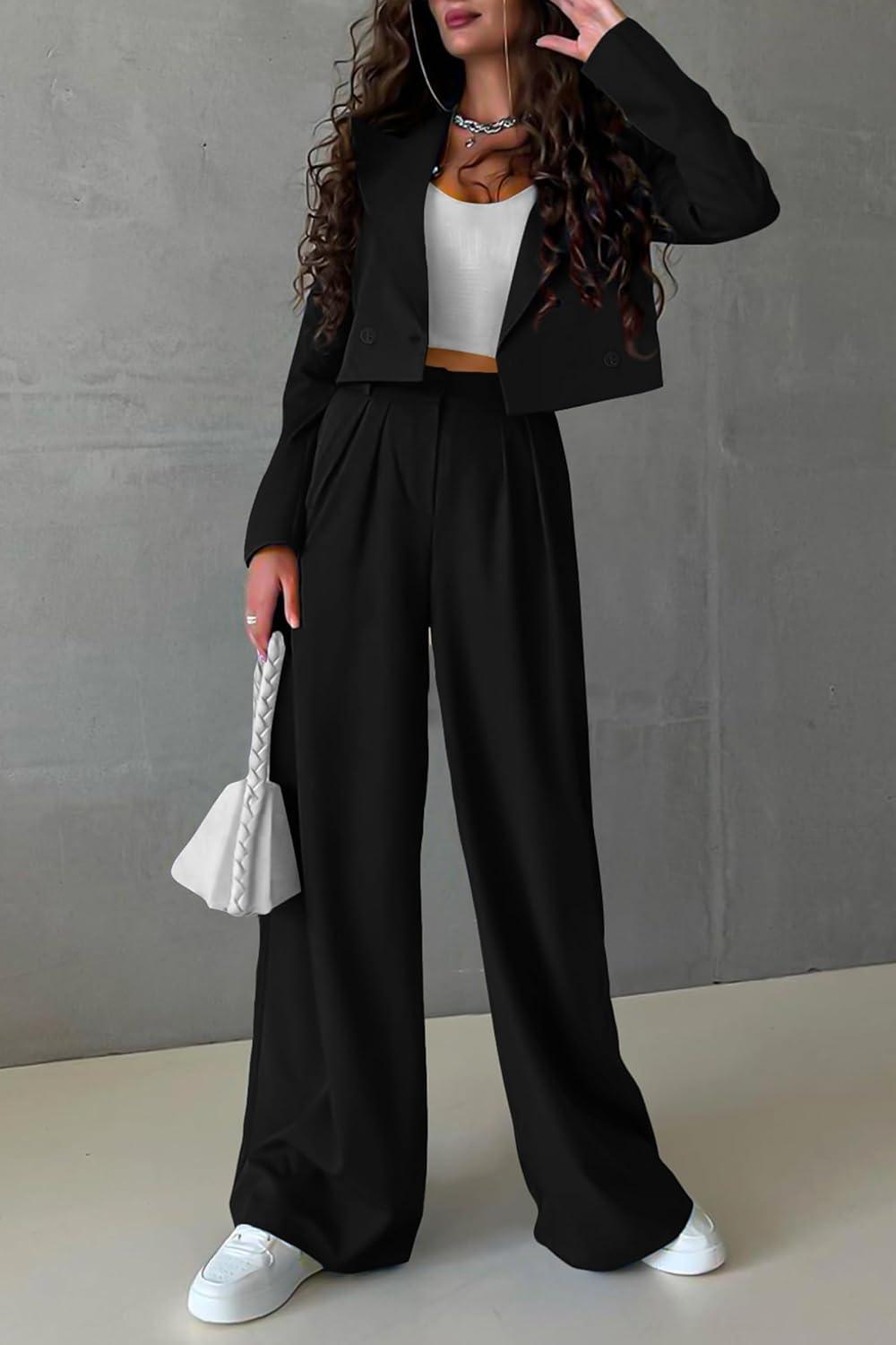 PRETTYGARDEN Women's 2 Piece Casual Outfits Cropped Blazer Jackets High Waisted Wide Leg Work Pants Suit Set(Black)