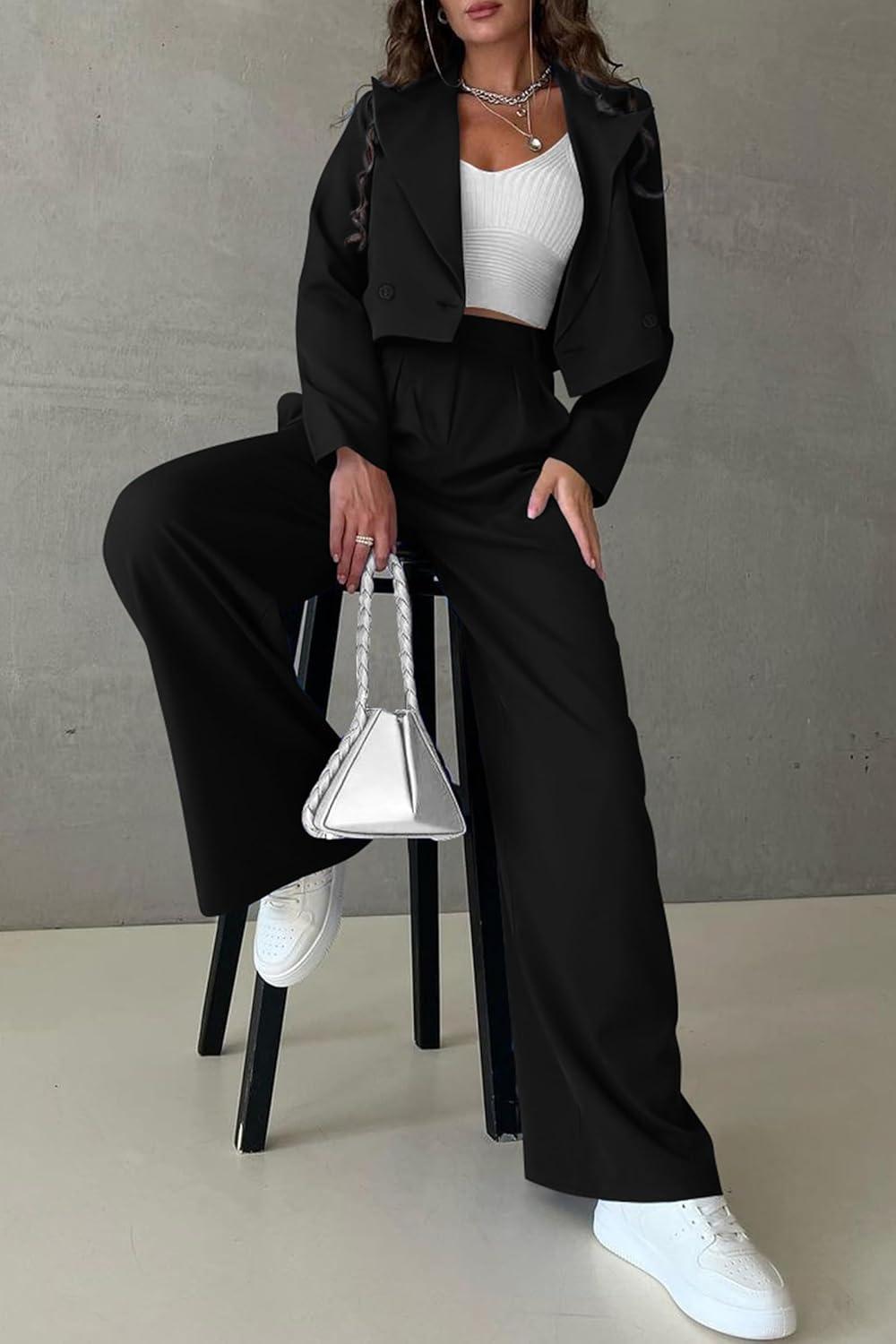 PRETTYGARDEN Women’s 2 Piece Casual Outfits Cropped Blazer Jackets High Waisted Wide Leg Work Pants Suit Set(Black)