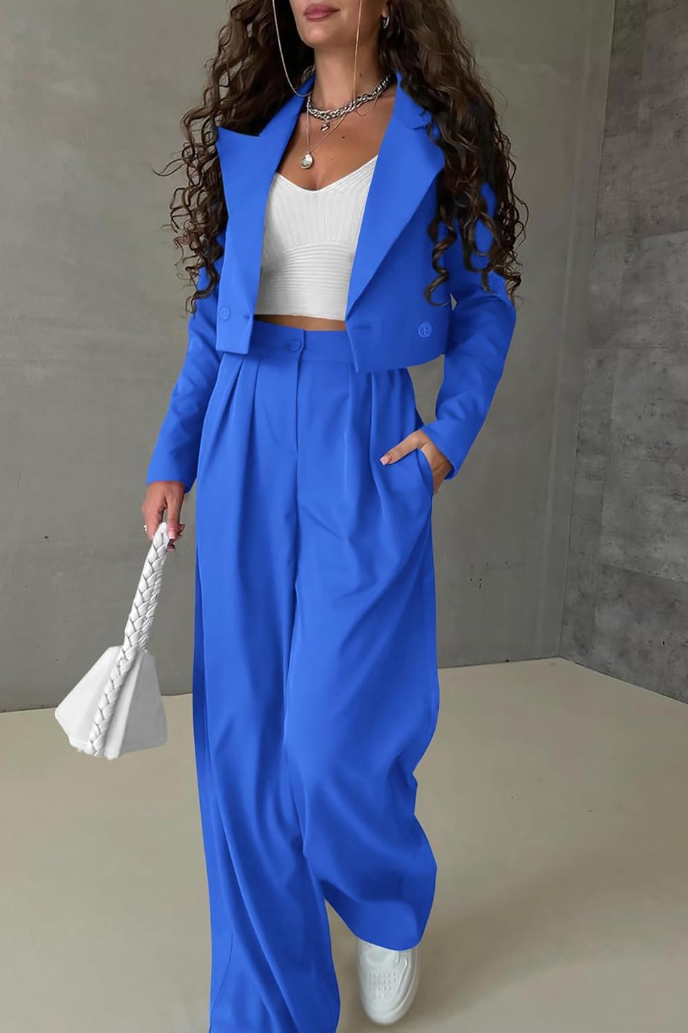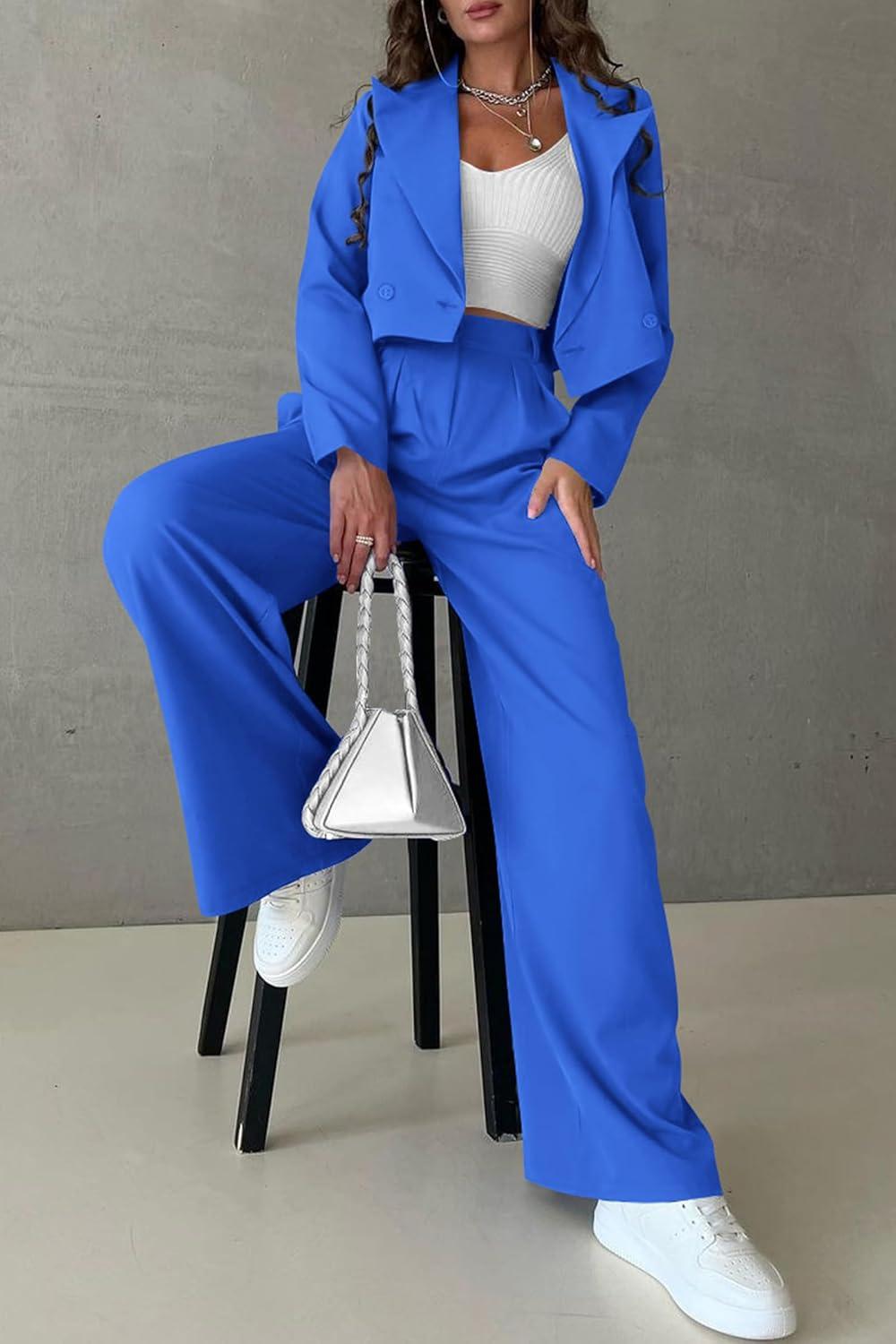 PRETTYGARDEN Women’s 2 Piece Casual Outfits Cropped Blazer Jackets High Waisted Wide Leg Work Pants Suit Set(Blue)