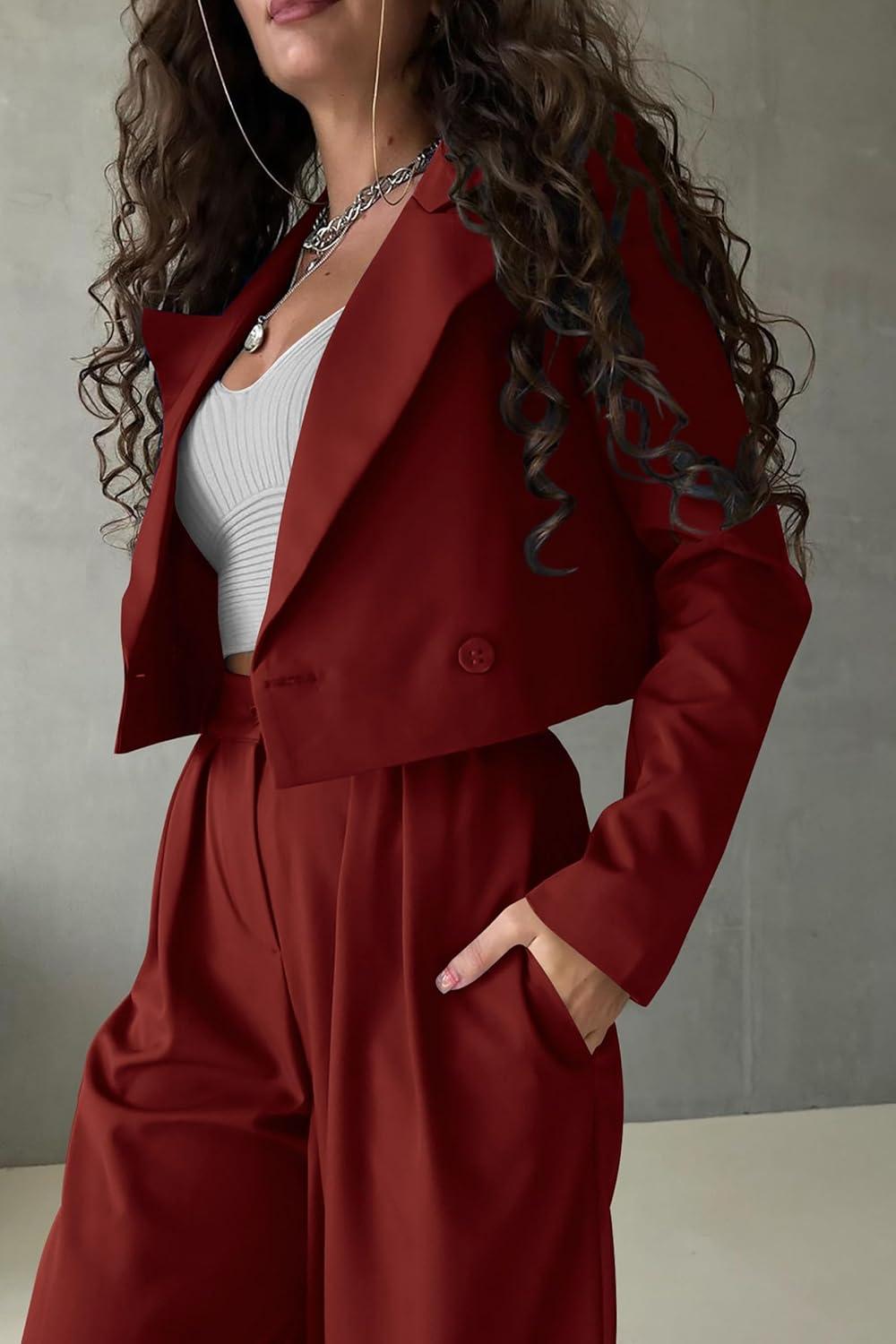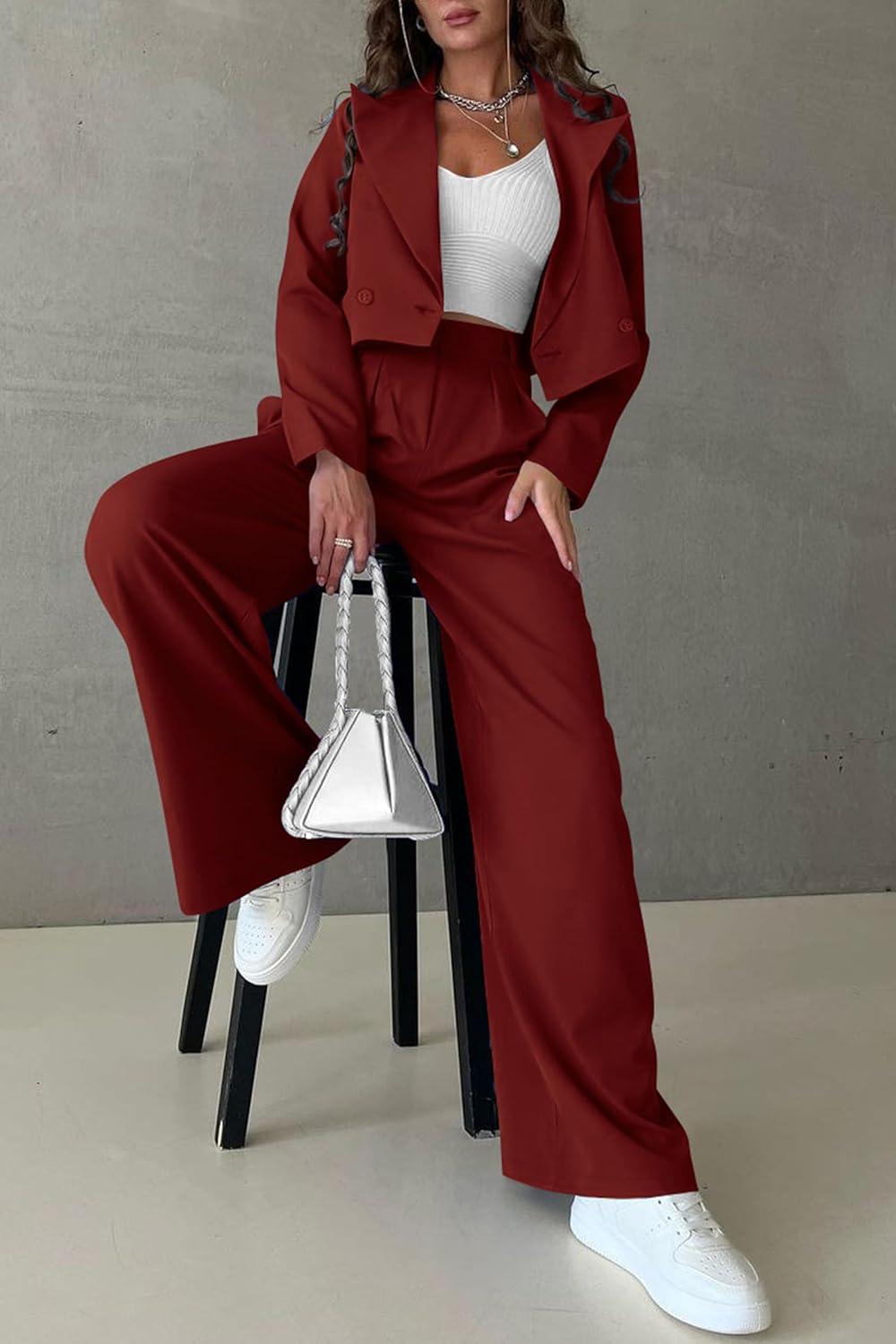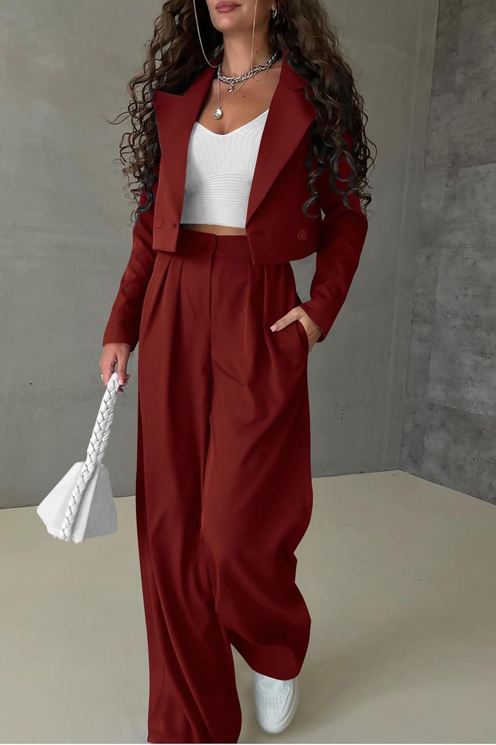 PRETTYGARDEN Women’s 2 Piece Casual Outfits Cropped Blazer Jackets High Waisted Wide Leg Work Pants Suit Set(Brown Red)