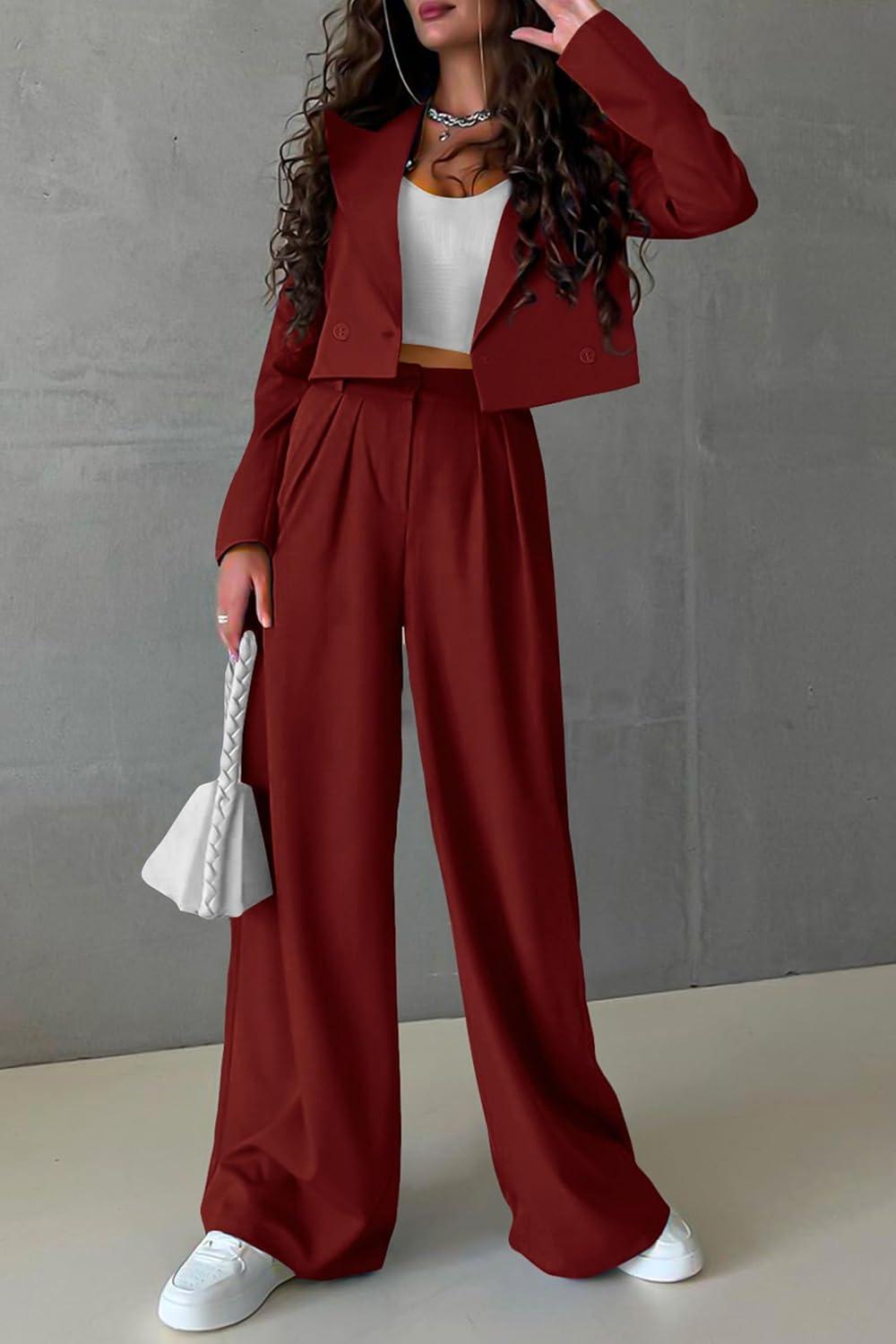 PRETTYGARDEN Women's 2 Piece Casual Outfits Cropped Blazer Jackets High Waisted Wide Leg Work Pants Suit Set(Brown Red)