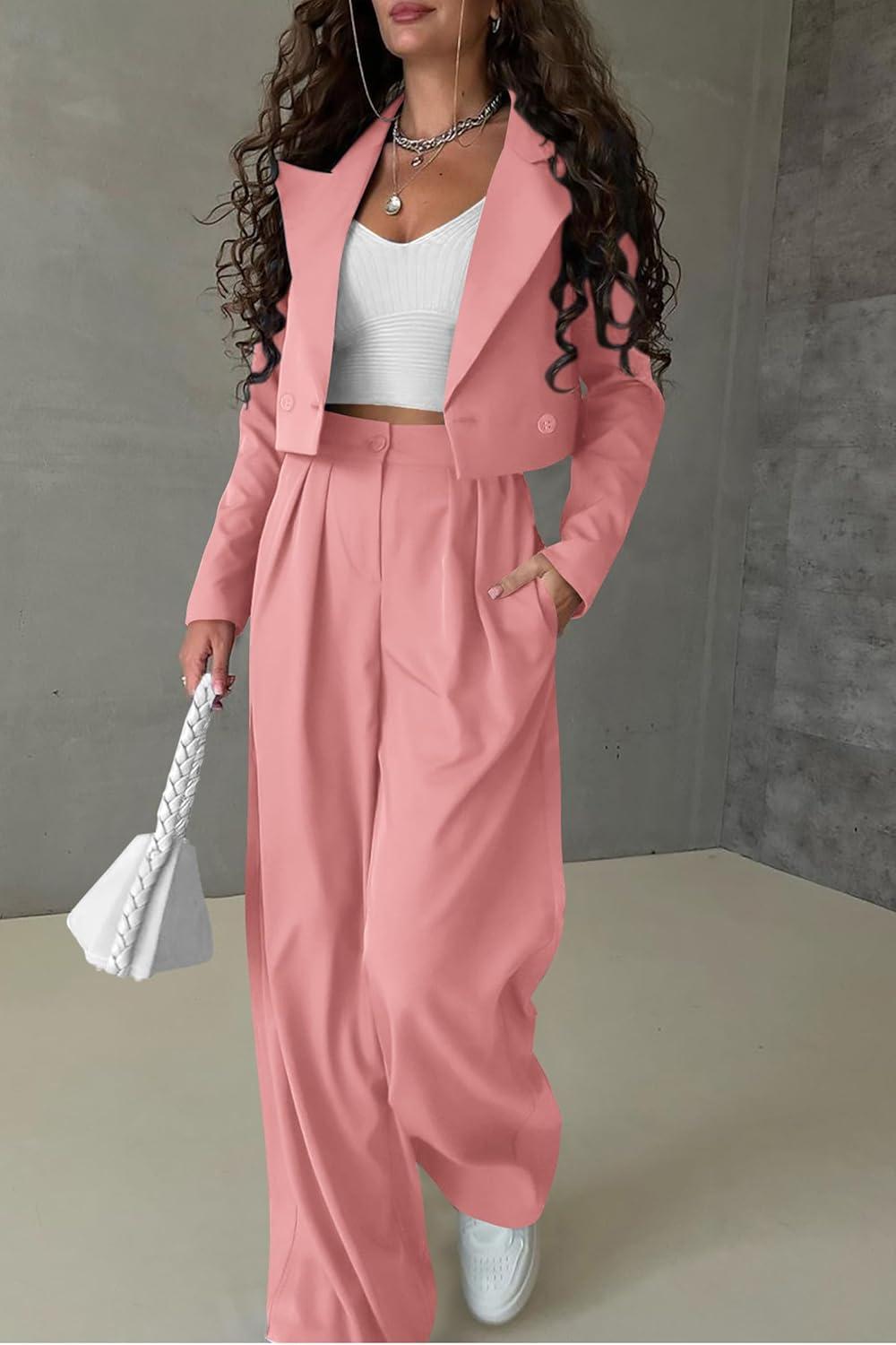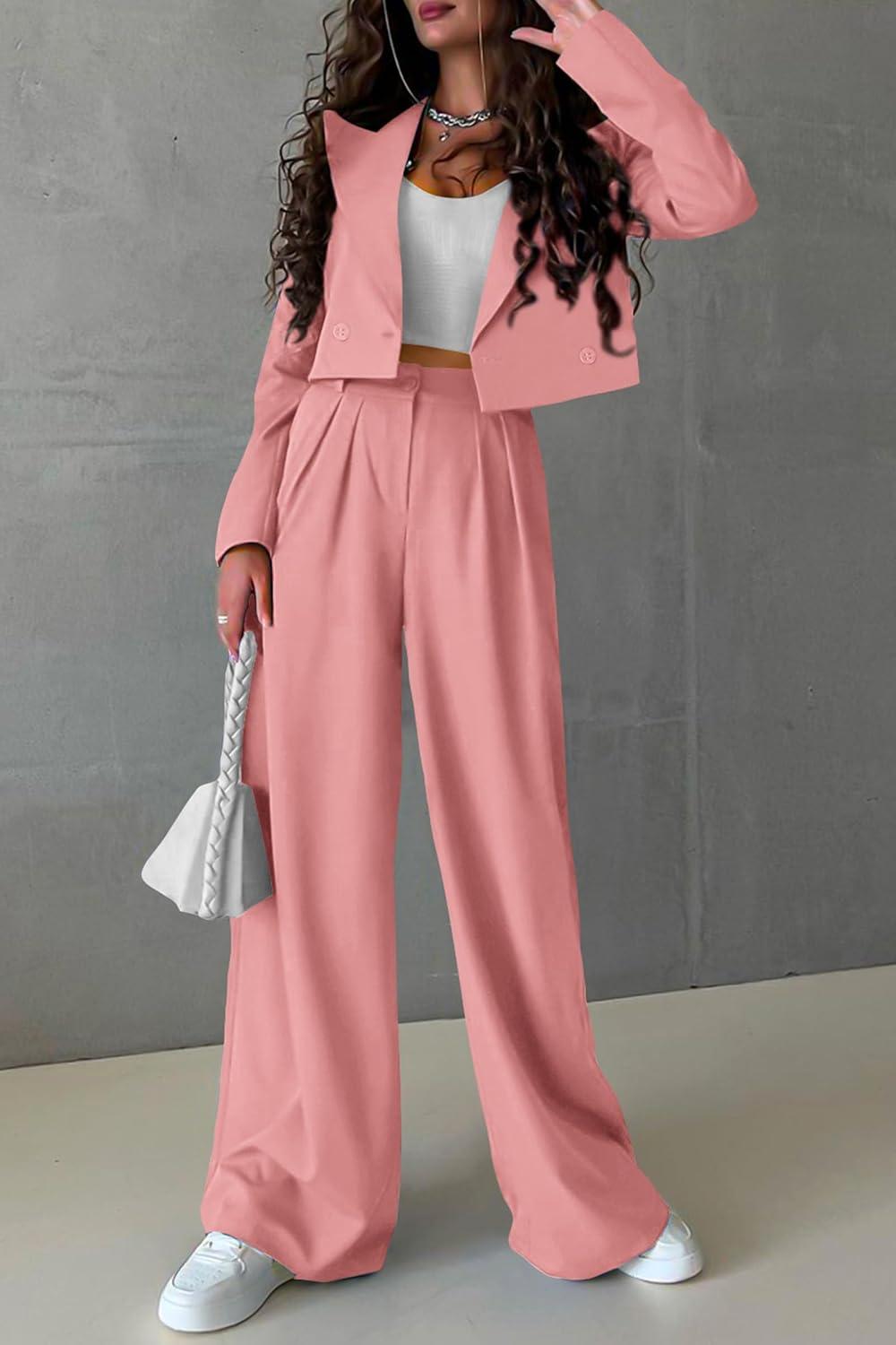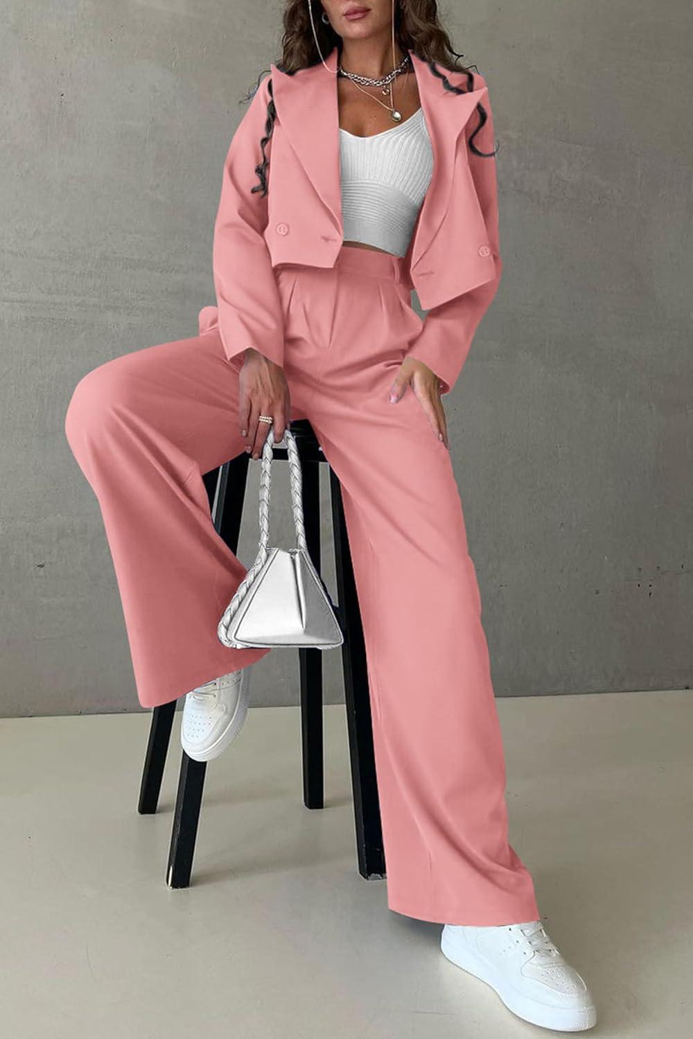 PRETTYGARDEN Women’s 2 Piece Casual Outfits Cropped Blazer Jackets High Waisted Wide Leg Work Pants Suit Set(Pink)
