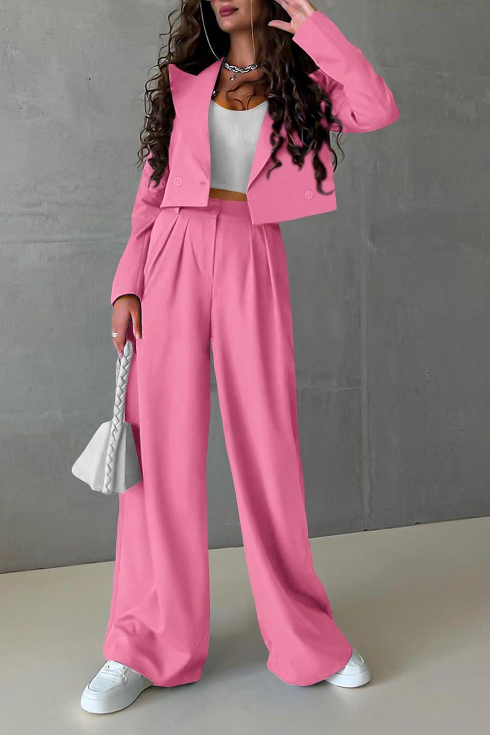 PRETTYGARDEN Women's 2 Piece Casual Outfits Cropped Blazer Jackets High Waisted Wide Leg Work Pants Suit Set(Pink)