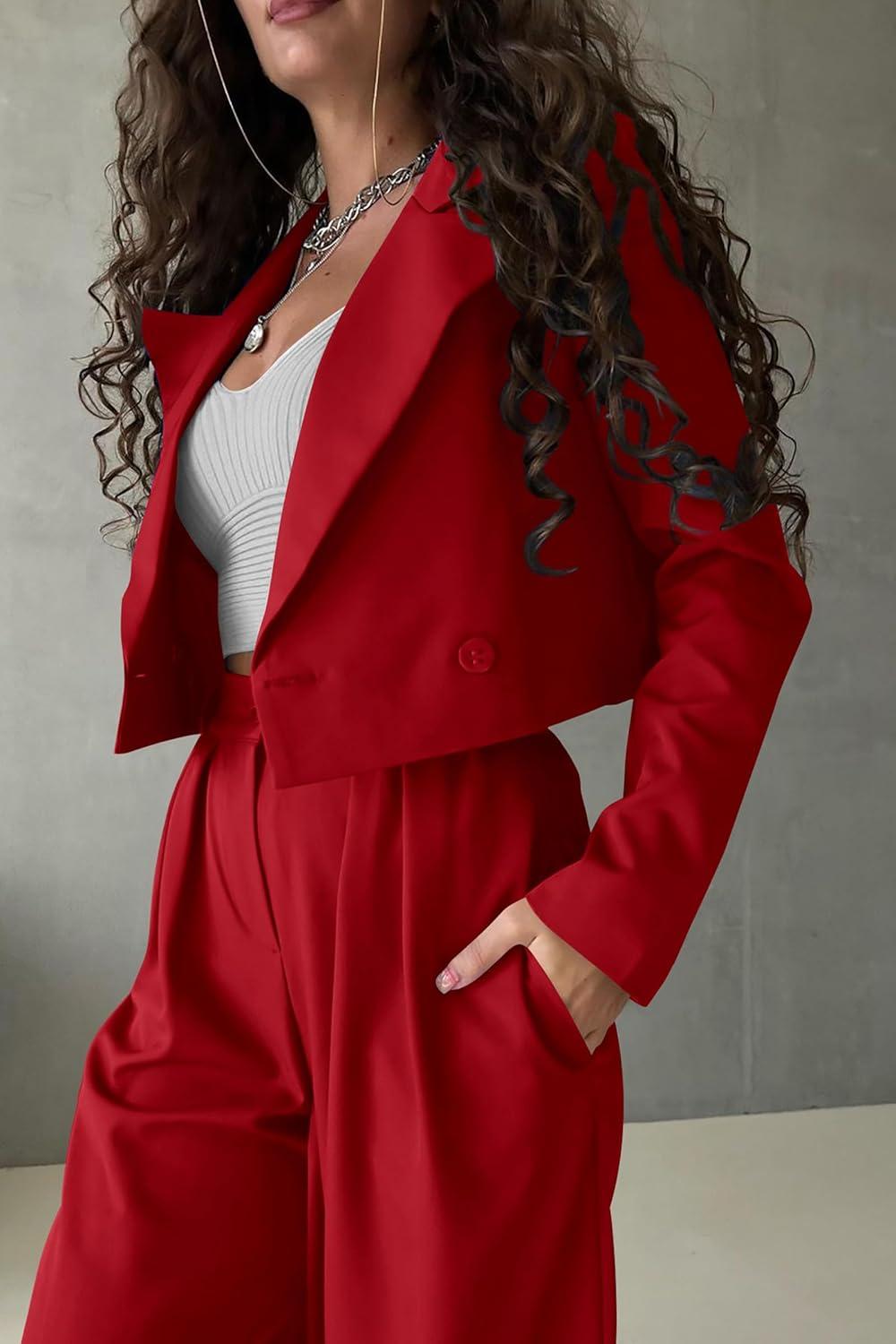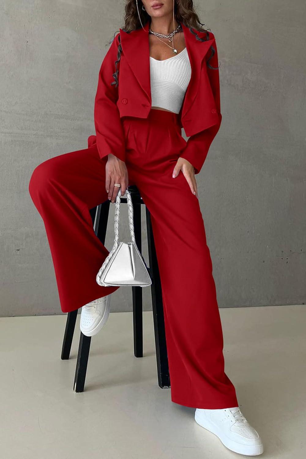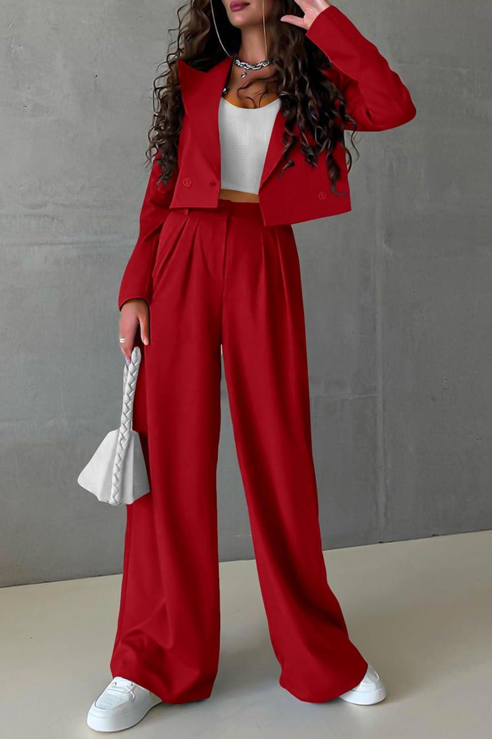 PRETTYGARDEN Women's 2 Piece Casual Outfits Cropped Blazer Jackets High Waisted Wide Leg Work Pants Suit Set(Red)
