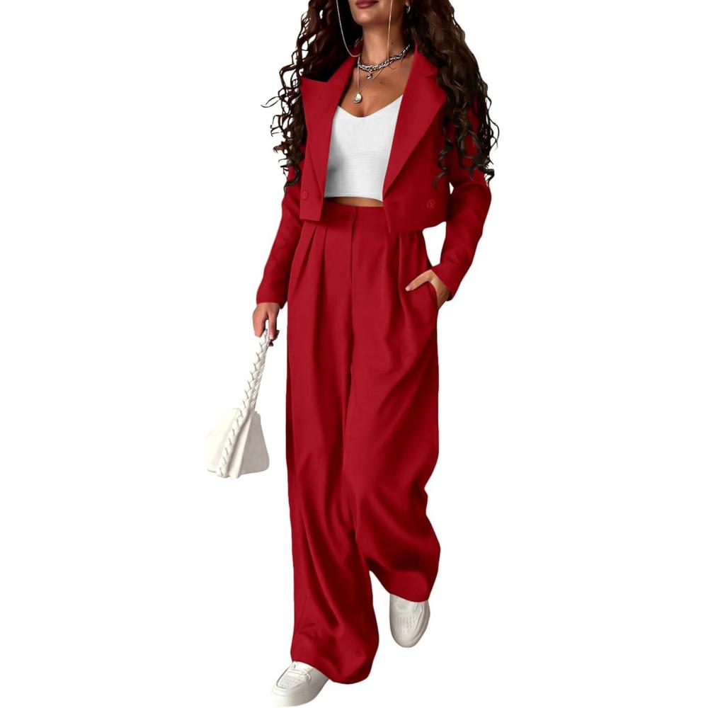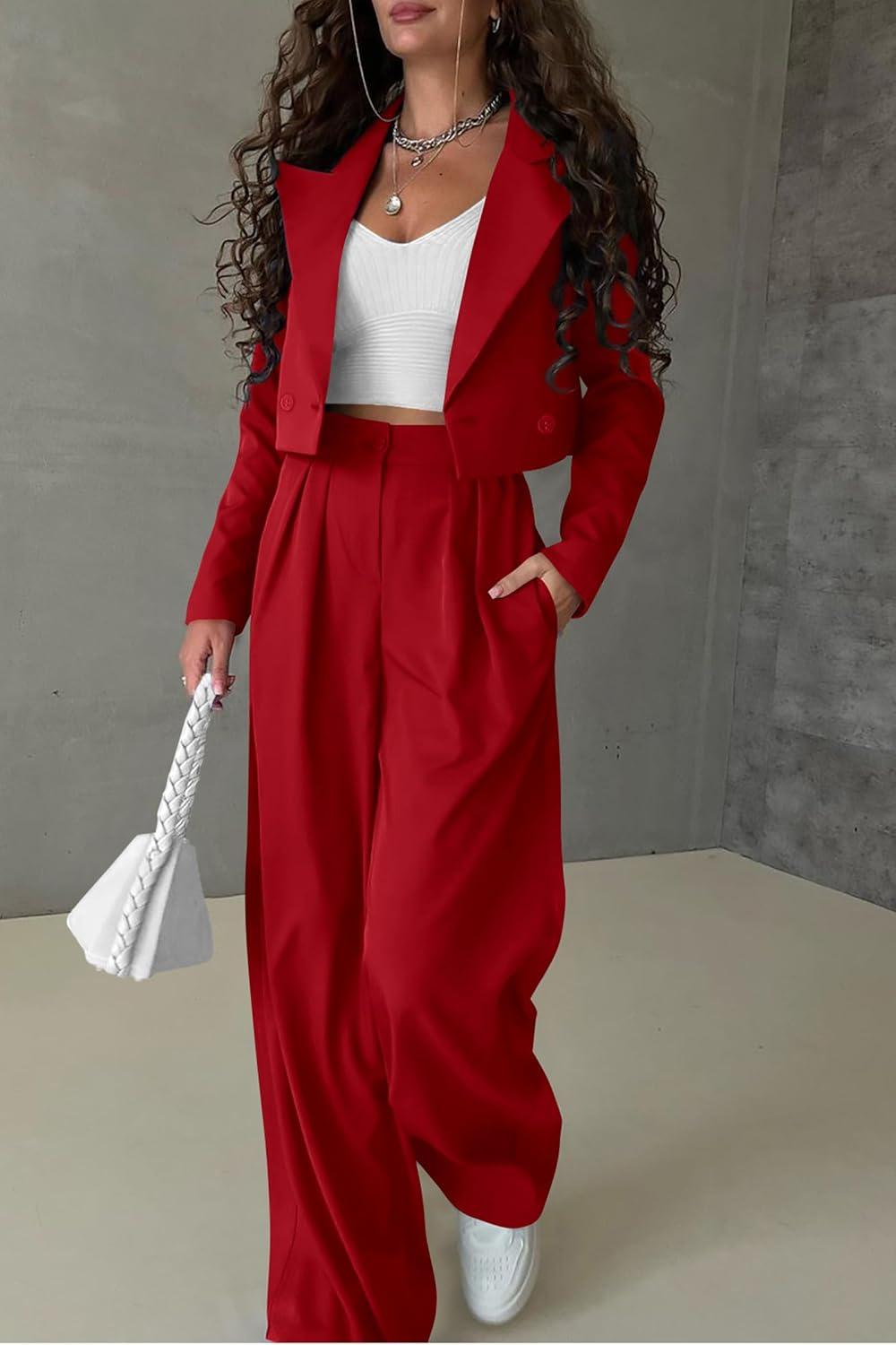 PRETTYGARDEN Women’s 2 Piece Casual Outfits Cropped Blazer Jackets High Waisted Wide Leg Work Pants Suit Set(Red)