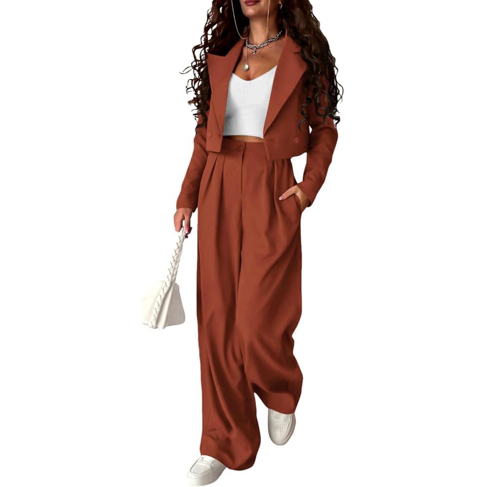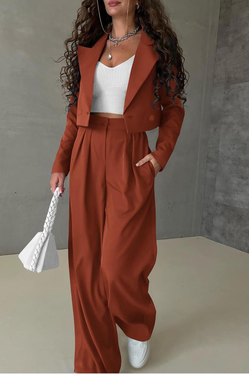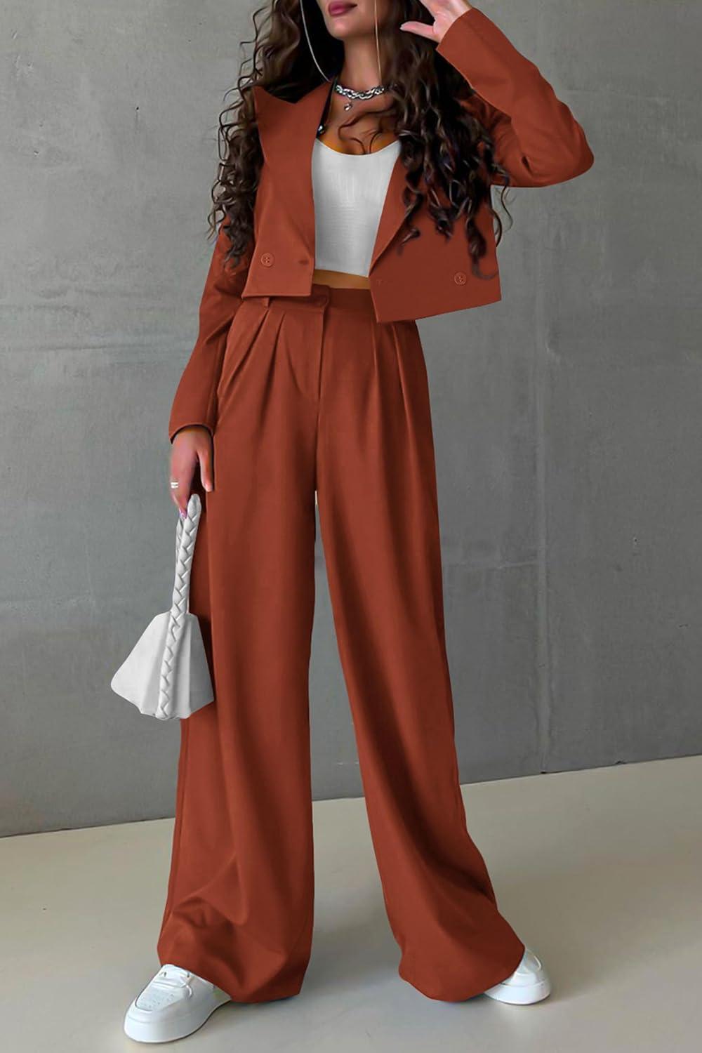 PRETTYGARDEN Women’s 2 Piece Casual Outfits Cropped Blazer Jackets High Waisted Wide Leg Work Pants Suit Set(Rust Red)