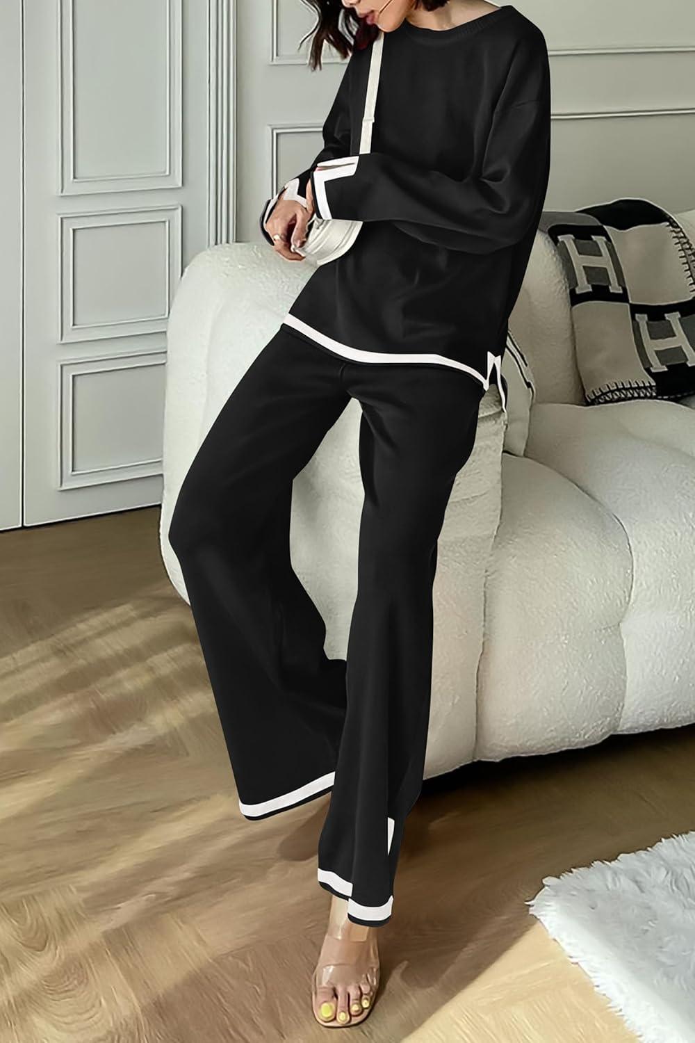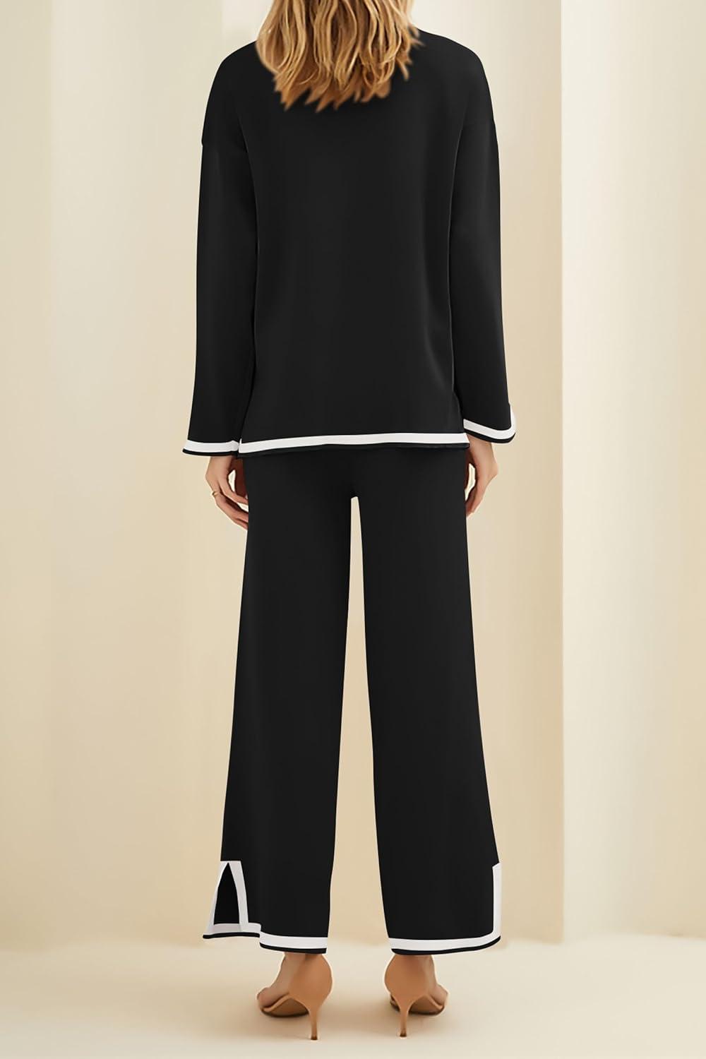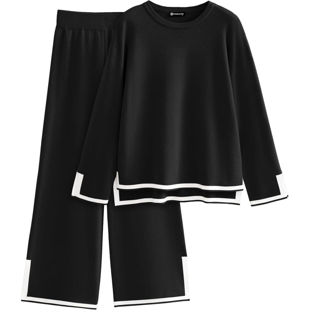 PRETTYGARDEN Women’s 2 Piece Fall Knit Sweater Set Long Sleeve Tops Wide Leg Pants Sweatsuit Tracksuit Outfit Winter Clothing(Black)