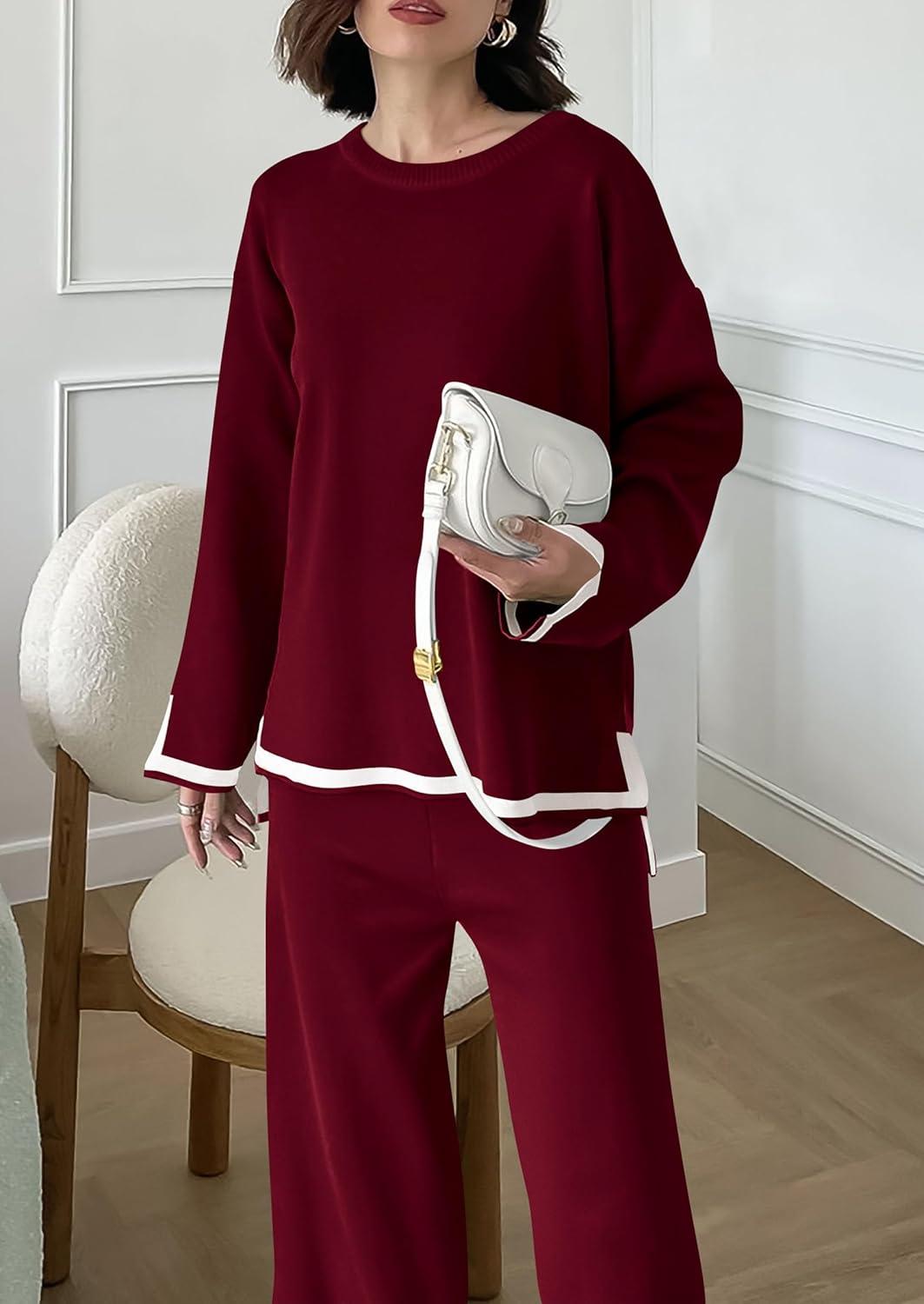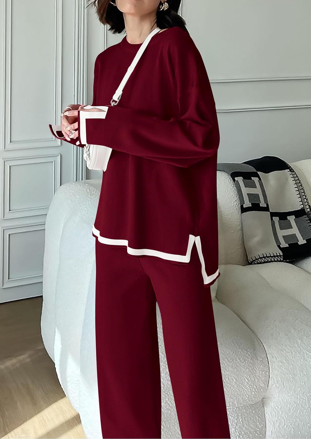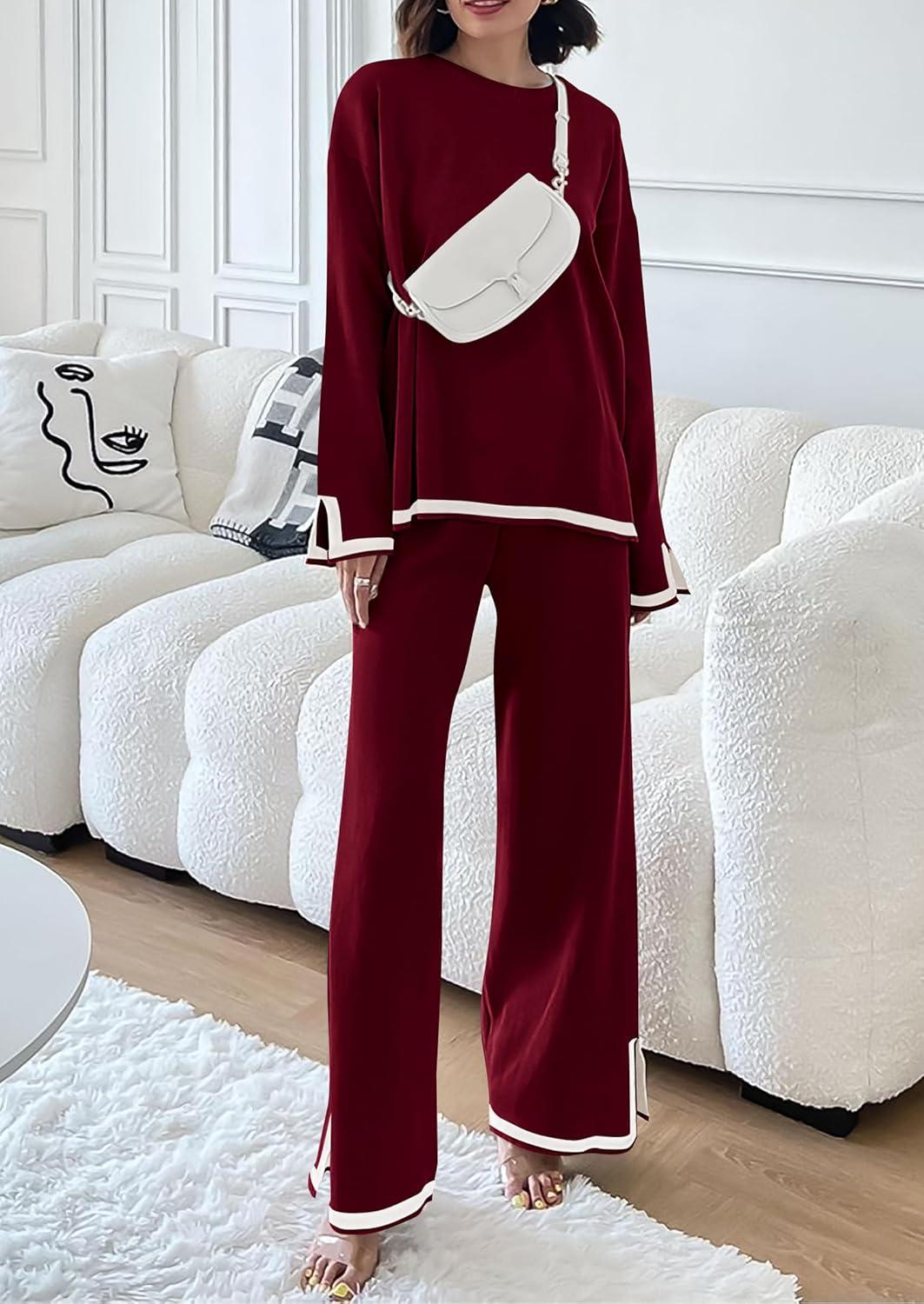 PRETTYGARDEN Women's 2 Piece Fall Knit Sweater Set Long Sleeve Tops Wide Leg Pants Sweatsuit Tracksuit Outfit Winter Clothing(Wine Red)