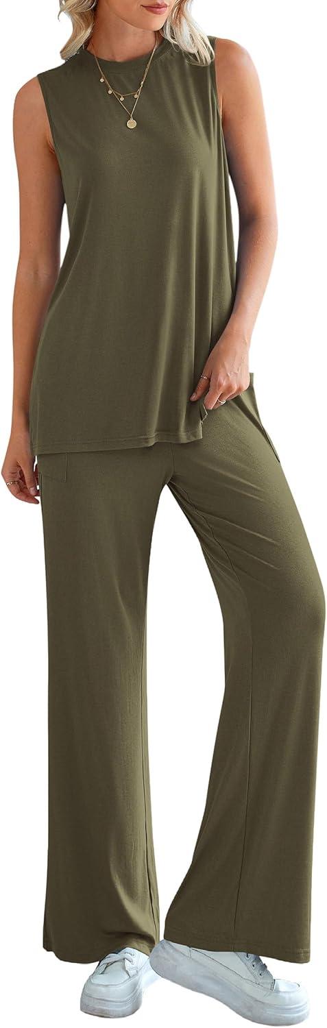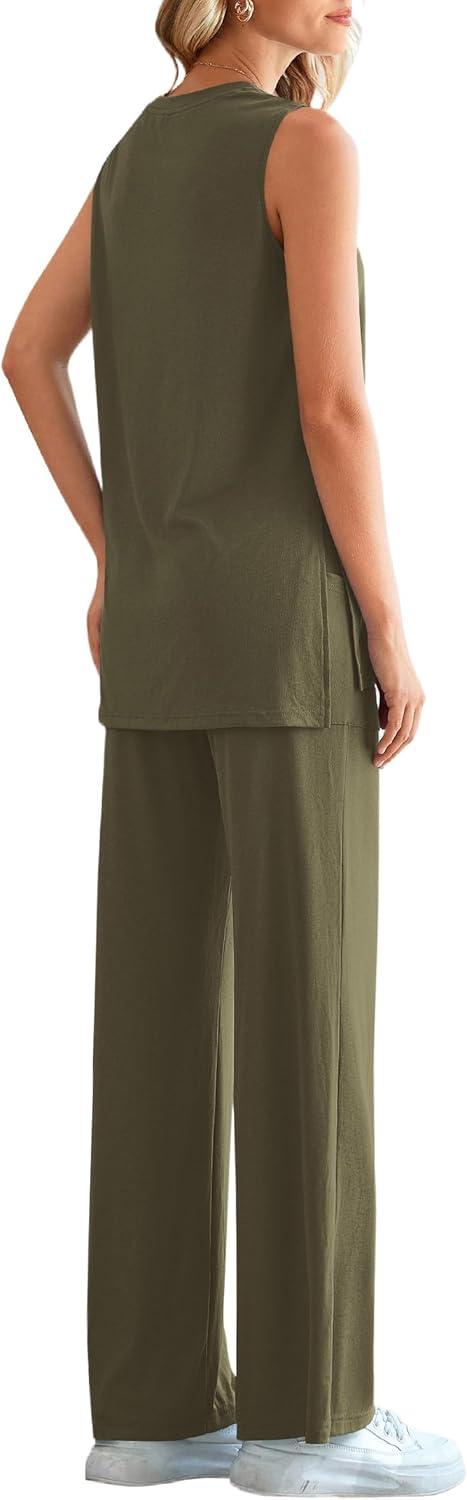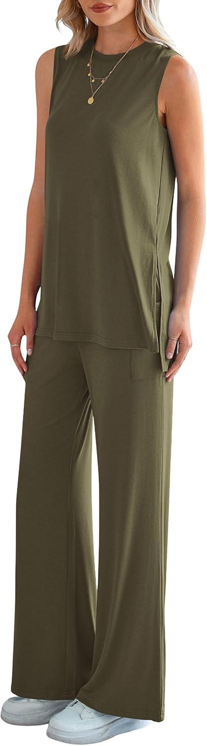 PRETTYGARDEN Women’s 2 Piece Lounge Set 2025 Summer Casual Loose Tank Top Wide Leg Pants Matching Travel Outfits Tracksuit(Army Green)