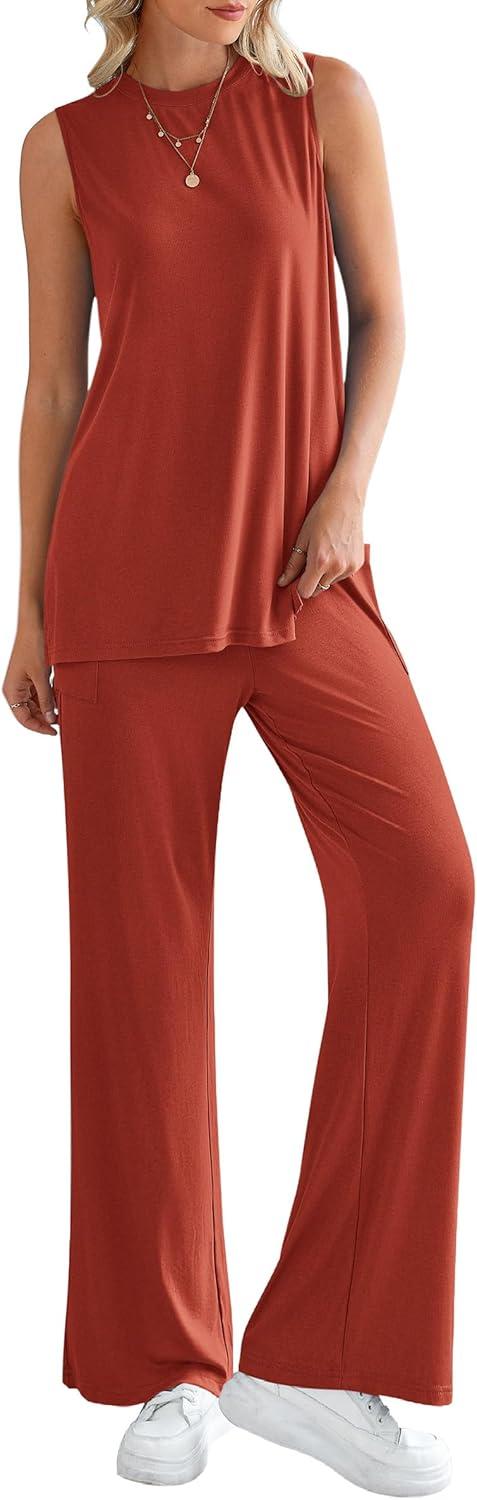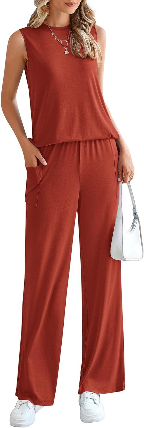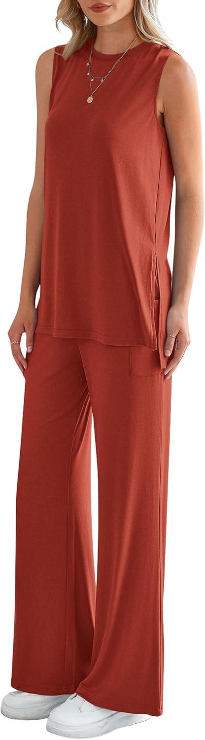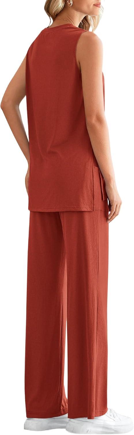 PRETTYGARDEN Women’s 2 Piece Lounge Set 2025 Summer Casual Loose Tank Top Wide Leg Pants Matching Travel Outfits Tracksuit(Brick Red)