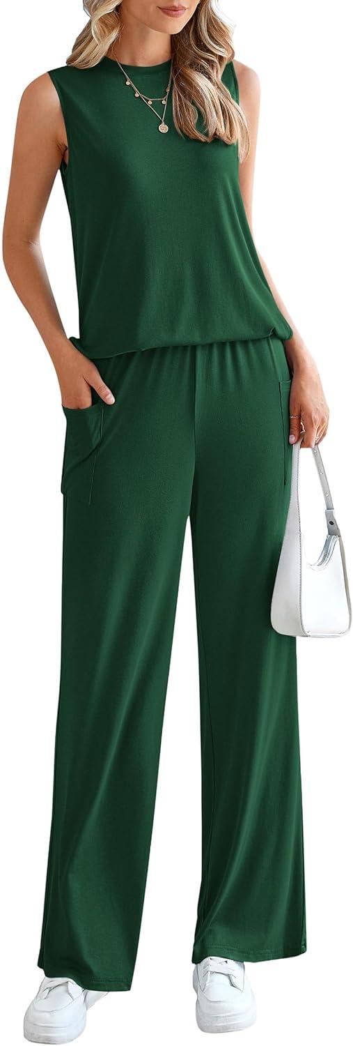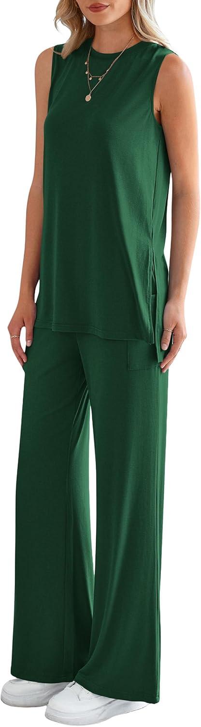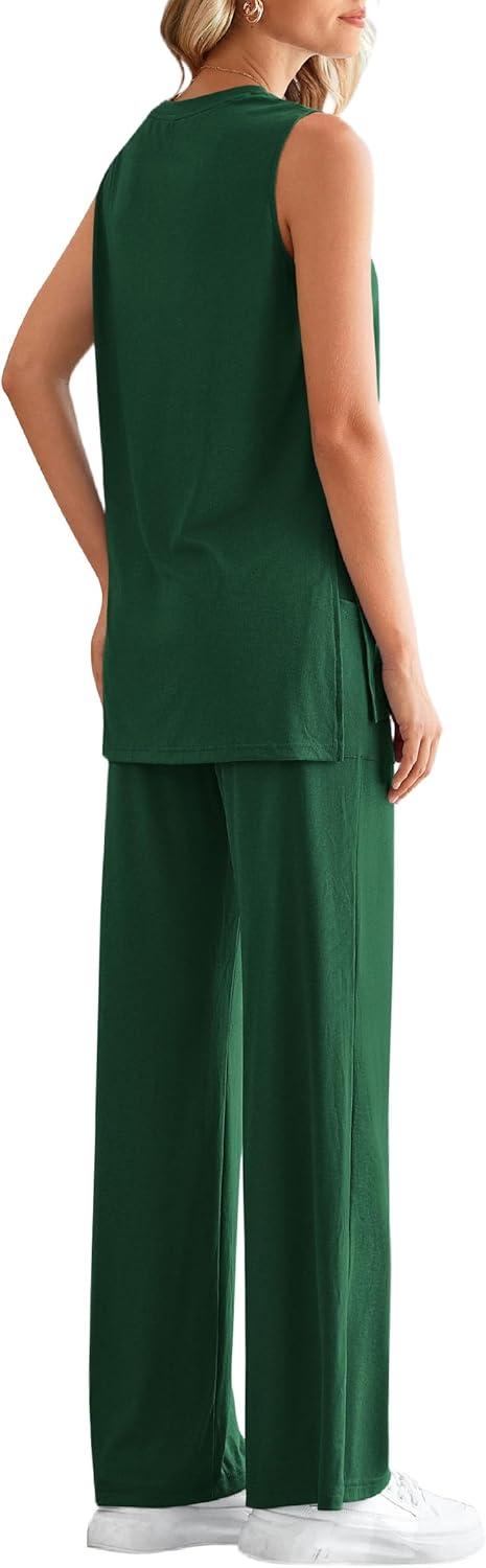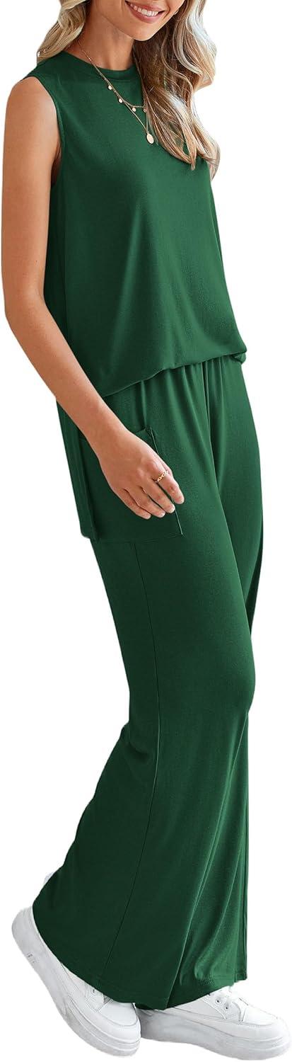 PRETTYGARDEN Women's 2 Piece Lounge Set 2025 Summer Casual Loose Tank Top Wide Leg Pants Matching Travel Outfits Tracksuit(Dark Green)