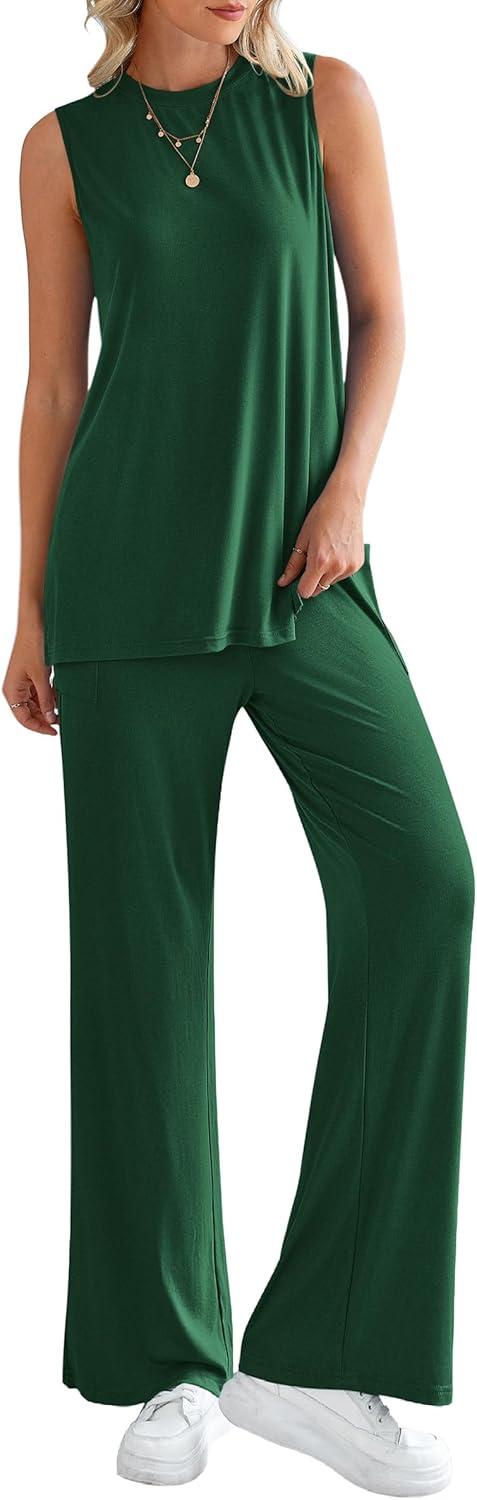 PRETTYGARDEN Women’s 2 Piece Lounge Set 2025 Summer Casual Loose Tank Top Wide Leg Pants Matching Travel Outfits Tracksuit(Dark Green)
