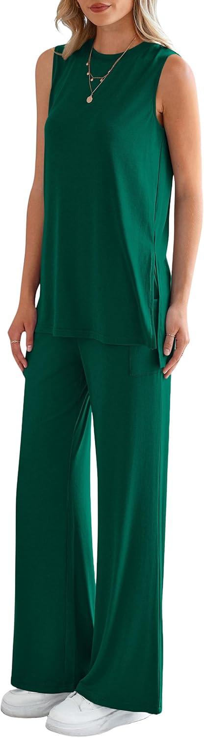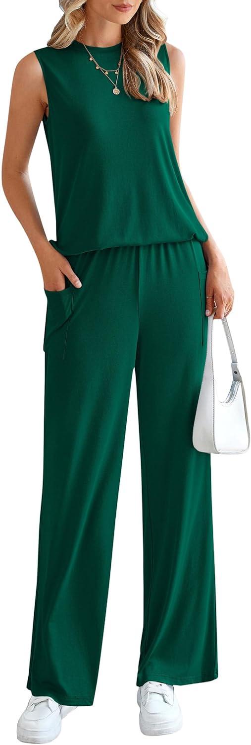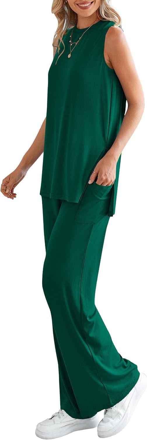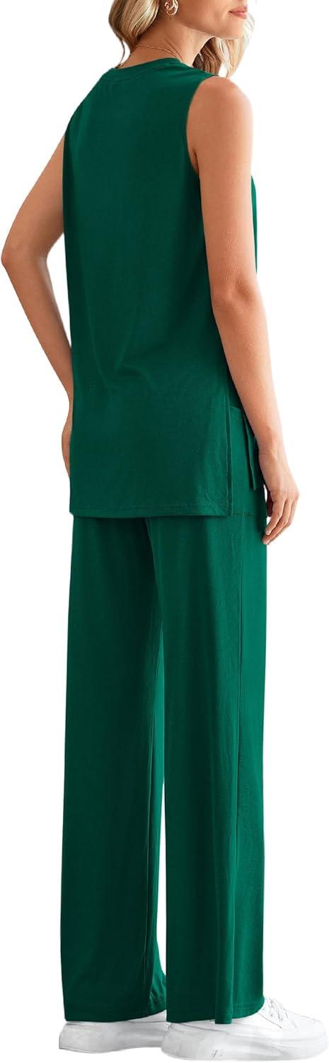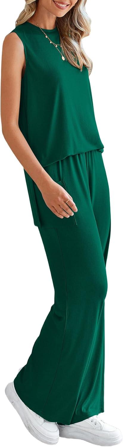 PRETTYGARDEN Women's 2 Piece Lounge Set 2025 Summer Casual Loose Tank Top Wide Leg Pants Matching Travel Outfits Tracksuit(Green)