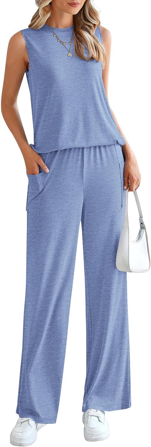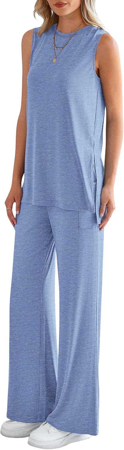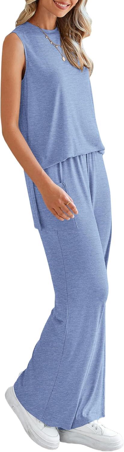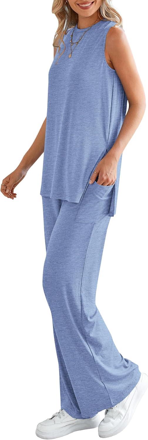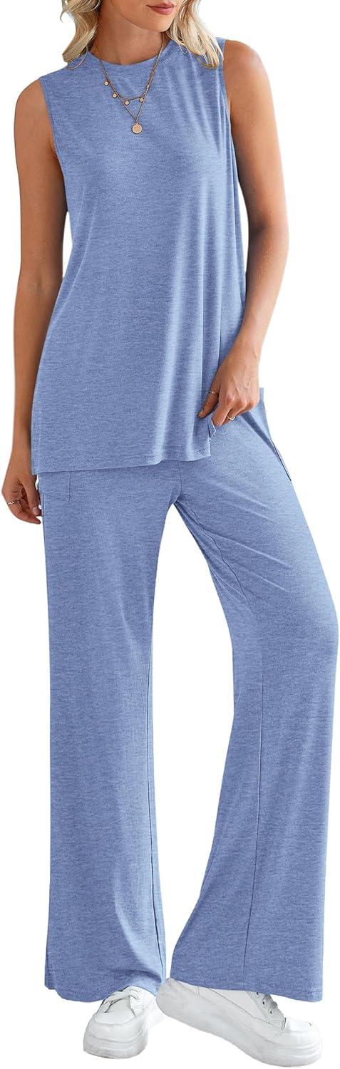 PRETTYGARDEN Women’s 2 Piece Lounge Set 2025 Summer Casual Loose Tank Top Wide Leg Pants Matching Travel Outfits Tracksuit(Grey Blue)