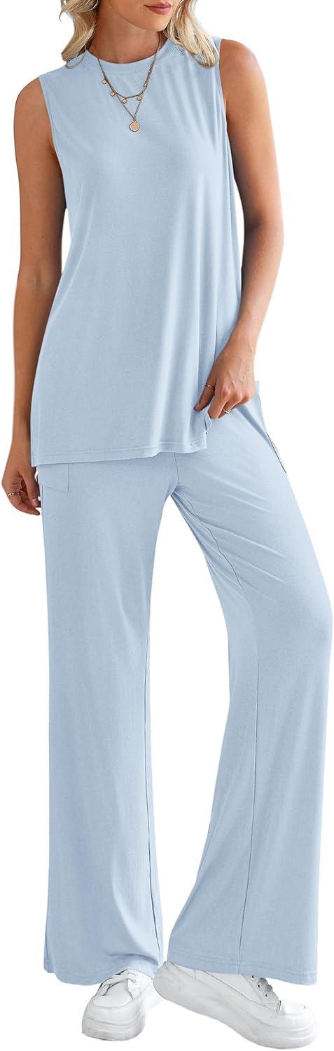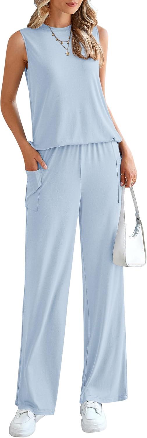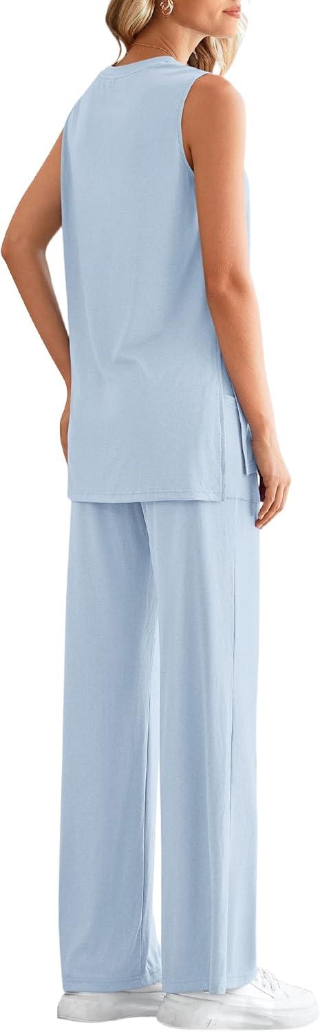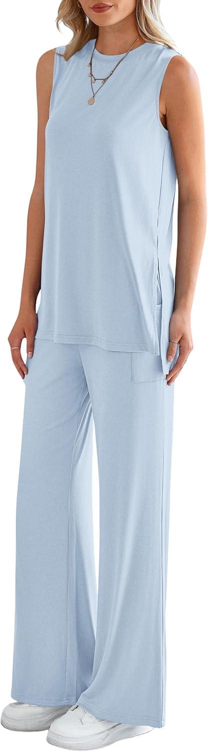 PRETTYGARDEN Women’s 2 Piece Lounge Set 2025 Summer Casual Loose Tank Top Wide Leg Pants Matching Travel Outfits Tracksuit(Light Blue)