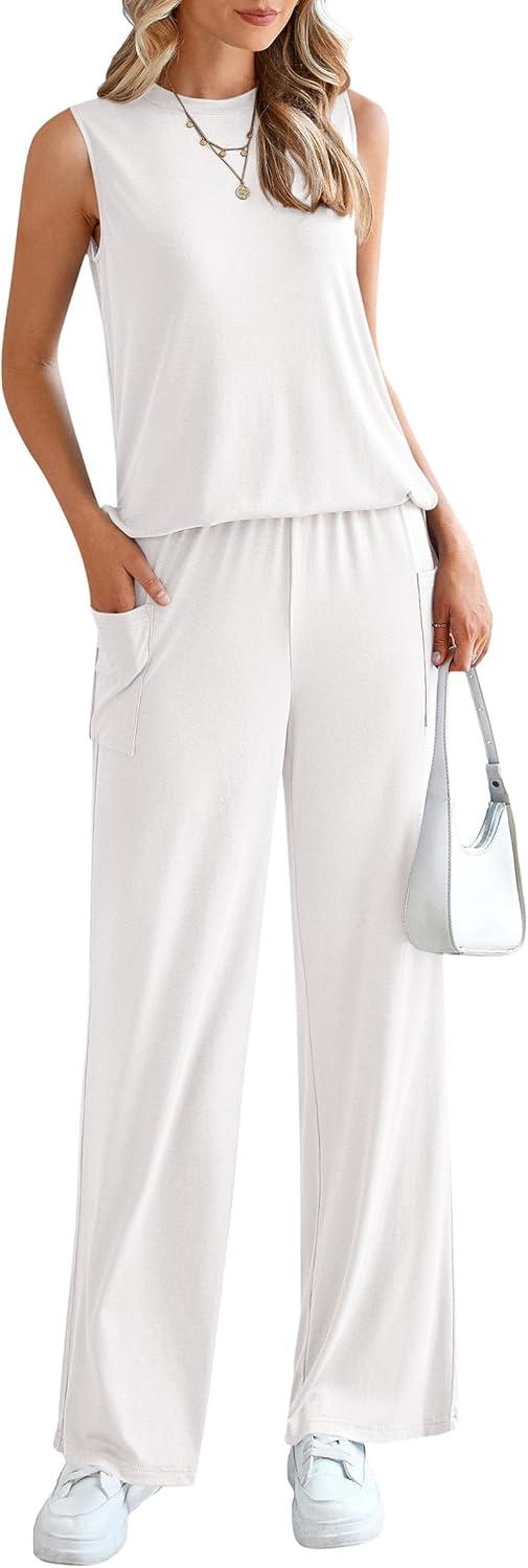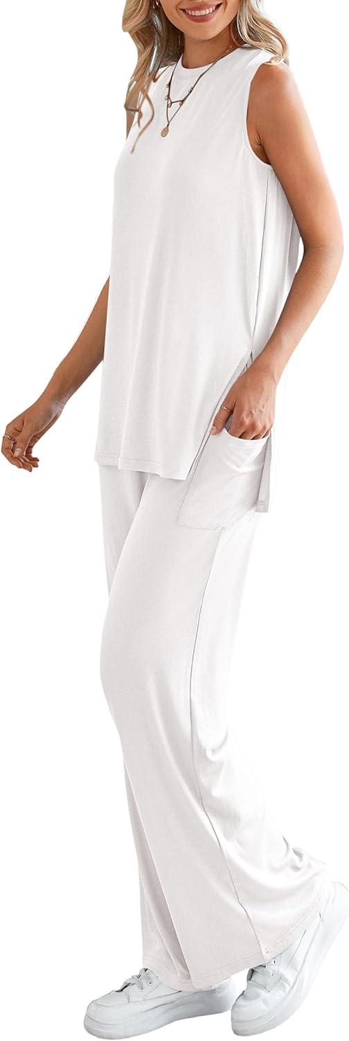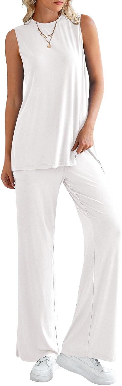 PRETTYGARDEN Women’s 2 Piece Lounge Set 2025 Summer Casual Loose Tank Top Wide Leg Pants Matching Travel Outfits Tracksuit(White)