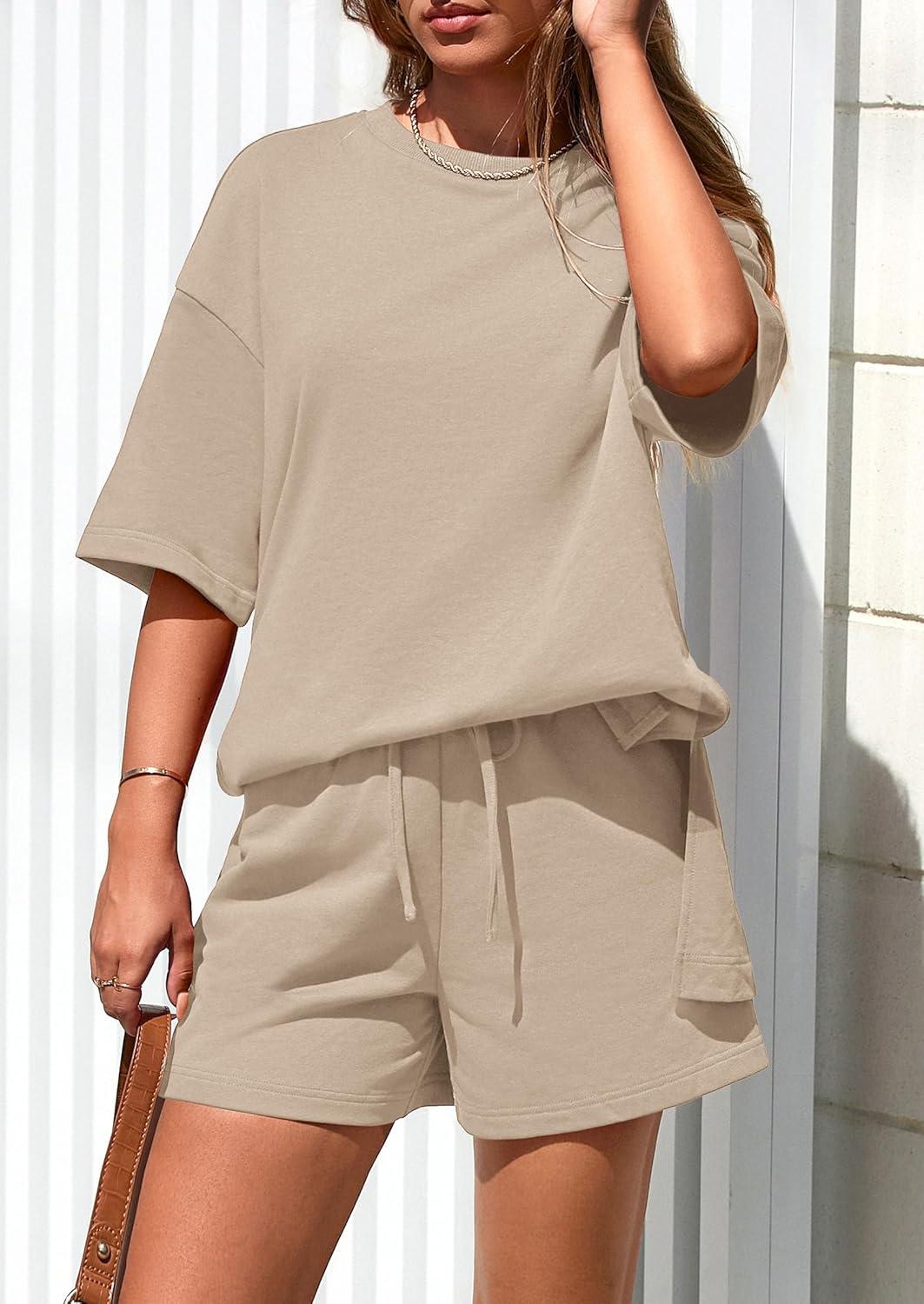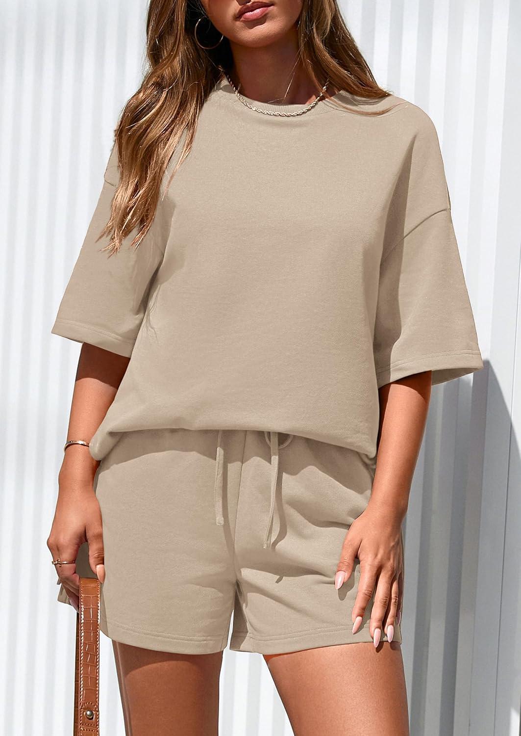 PRETTYGARDEN Women's 2 Piece Lounge Sets 2025 Summer Short Sleeve Tunic Tops Drawstring Shorts Matching Outfits Tracksuits(Beige)