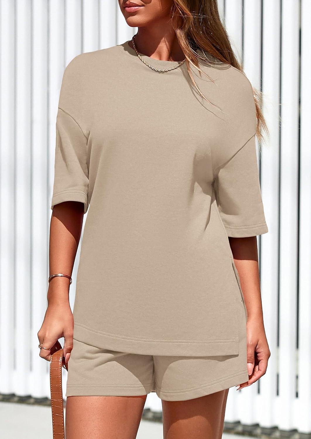 PRETTYGARDEN Women’s 2 Piece Lounge Sets 2025 Summer Short Sleeve Tunic Tops Drawstring Shorts Matching Outfits Tracksuits(Beige)
