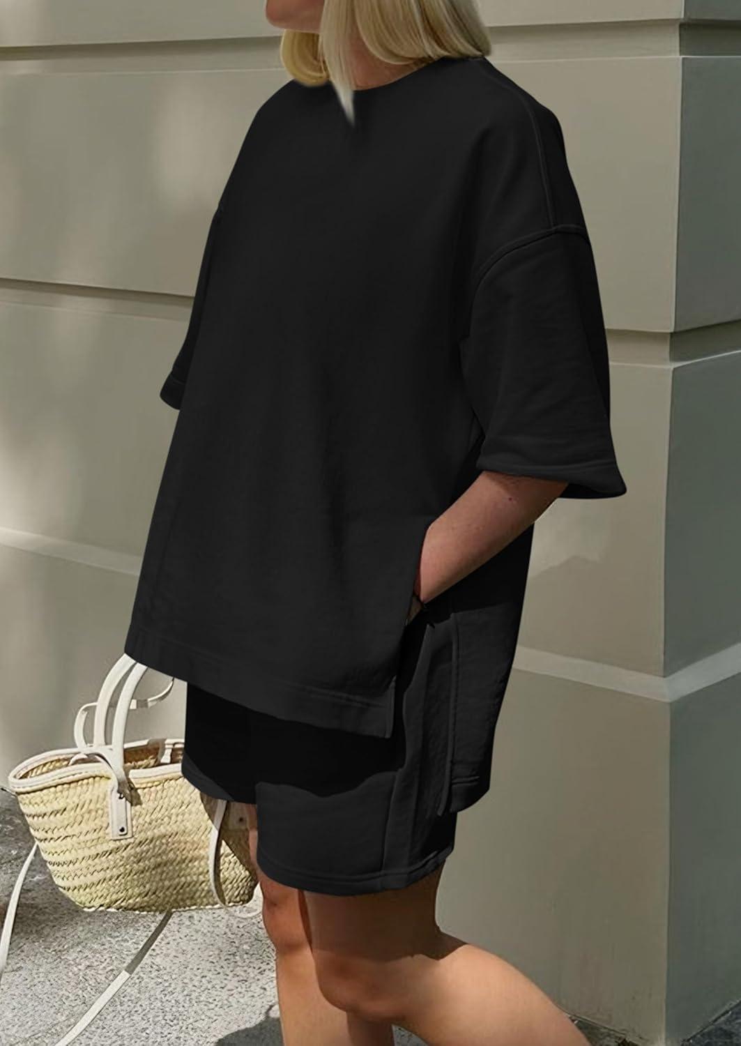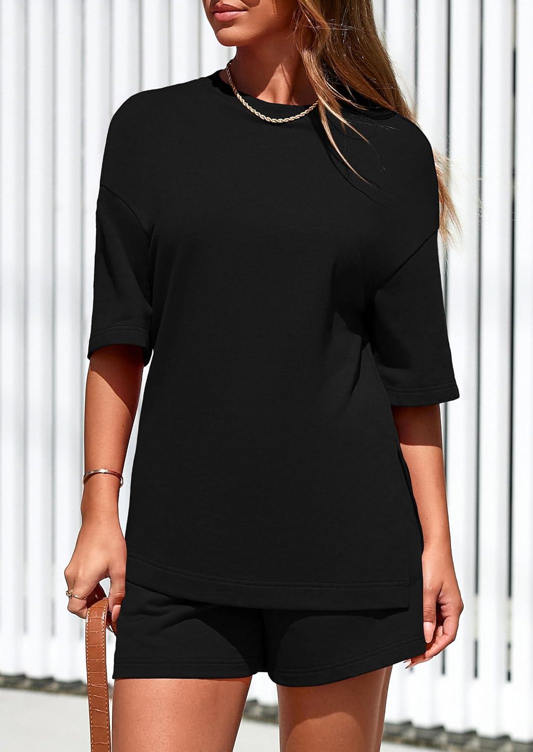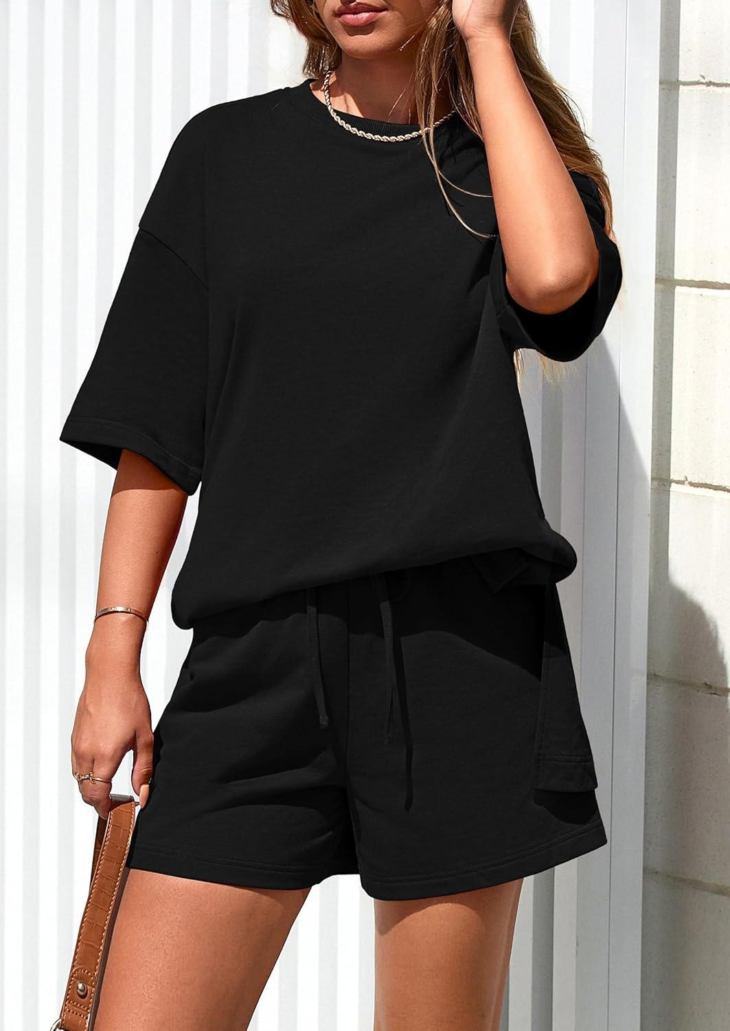 PRETTYGARDEN Women's 2 Piece Lounge Sets 2025 Summer Short Sleeve Tunic Tops Drawstring Shorts Matching Outfits Tracksuits(Black)