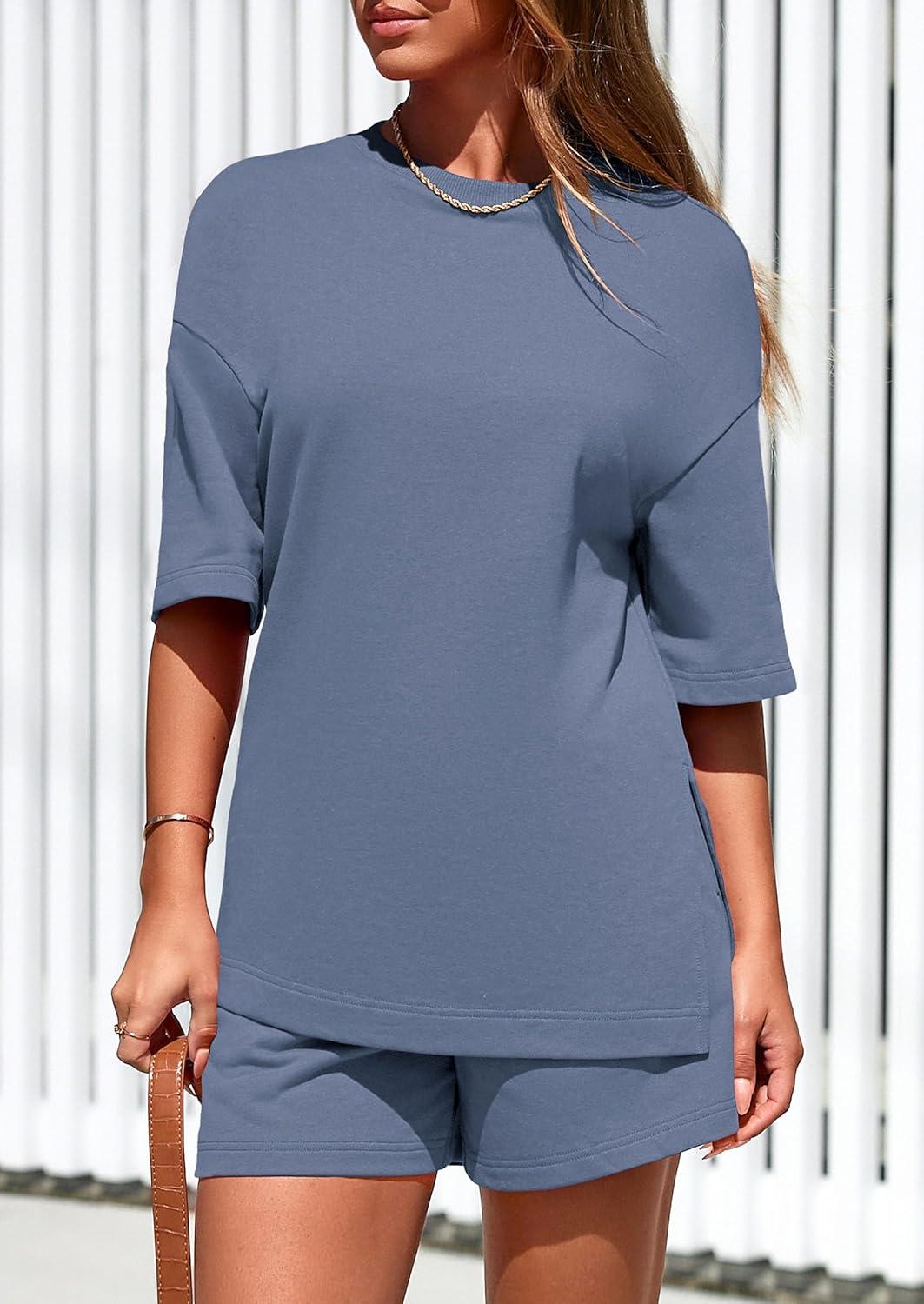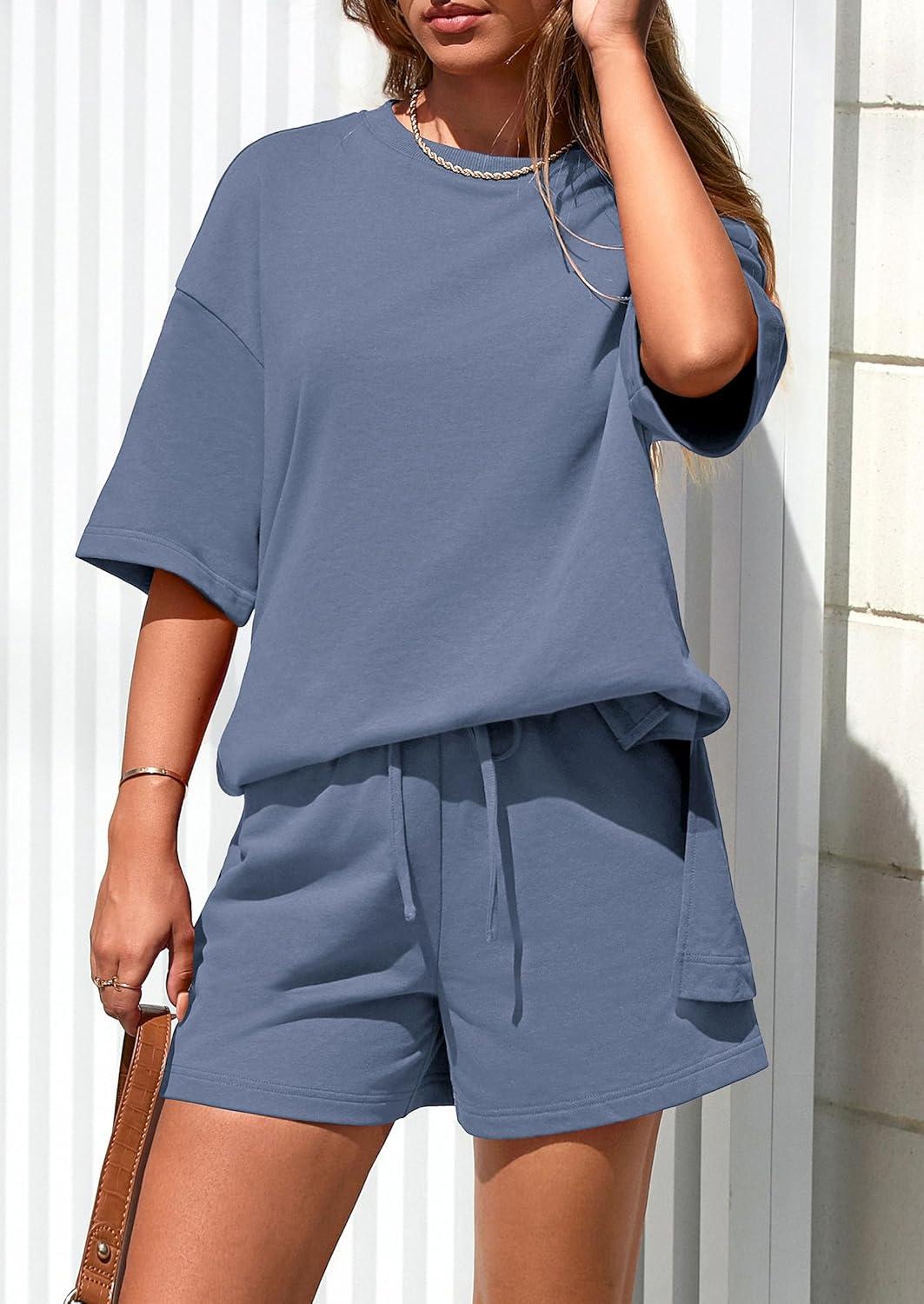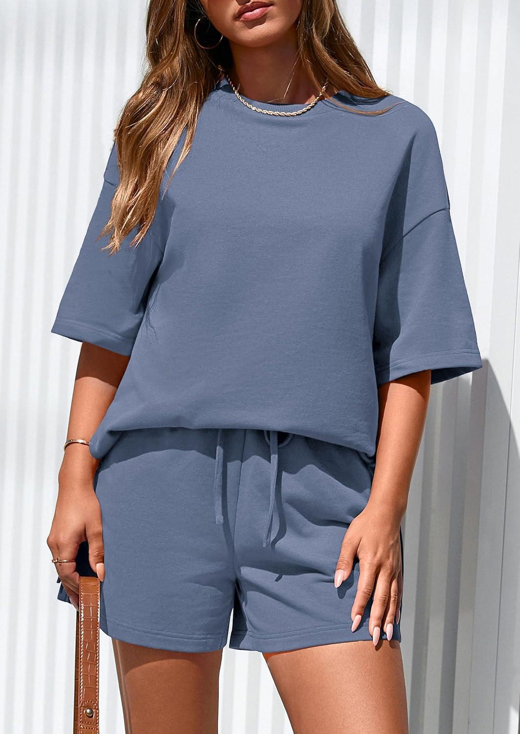 PRETTYGARDEN Women's 2 Piece Lounge Sets 2025 Summer Short Sleeve Tunic Tops Drawstring Shorts Matching Outfits Tracksuits(Grey Blue)