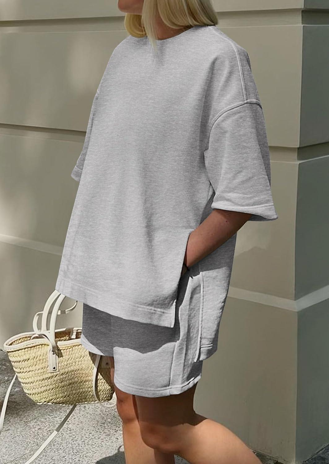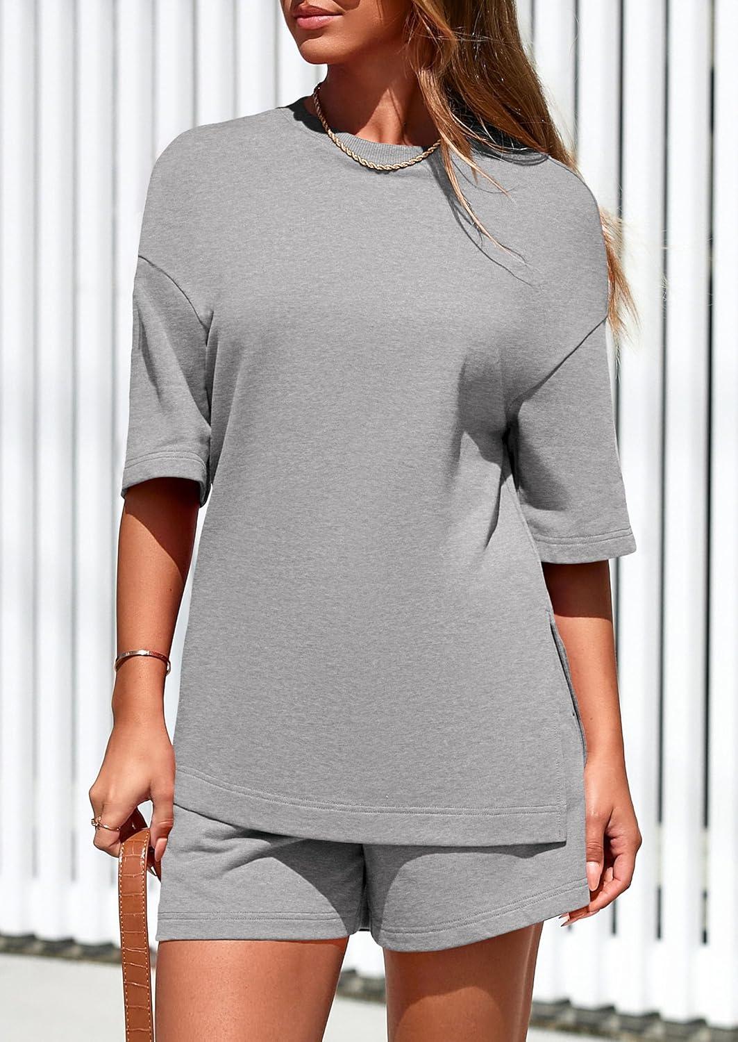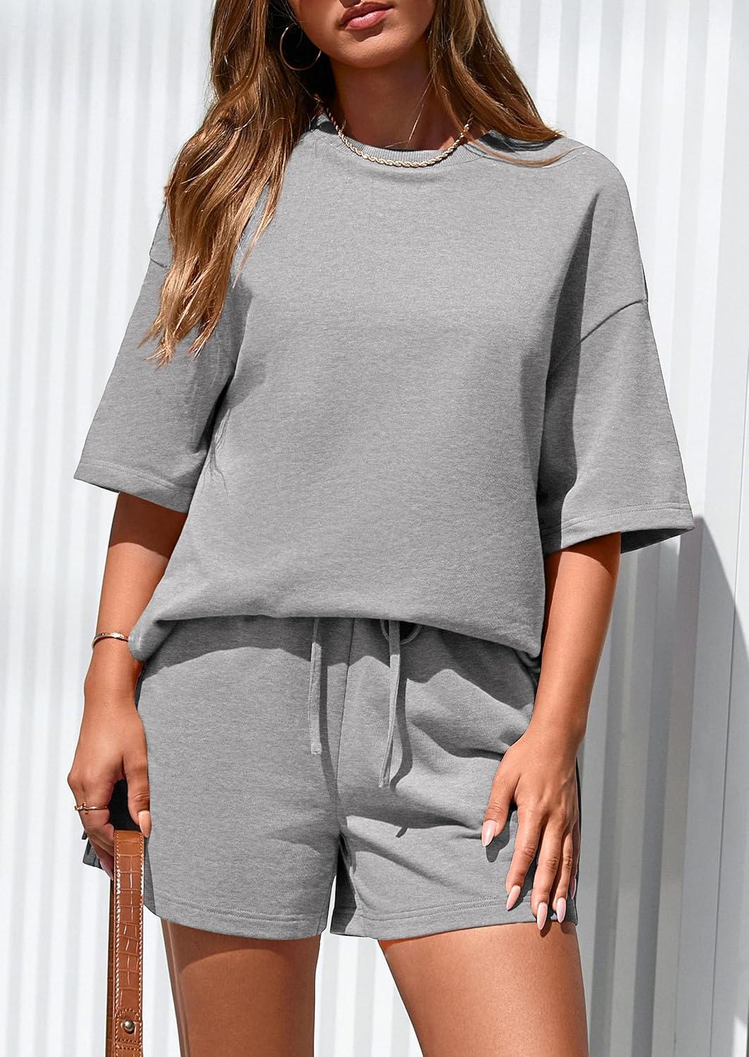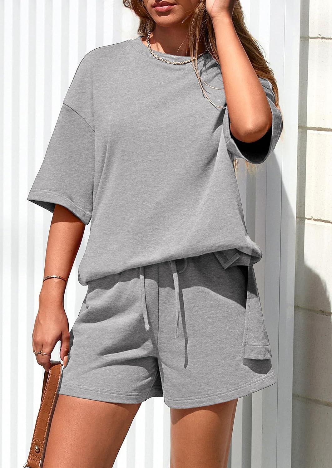 PRETTYGARDEN Women's 2 Piece Lounge Sets 2025 Summer Short Sleeve Tunic Tops Drawstring Shorts Matching Outfits Tracksuits(Grey)