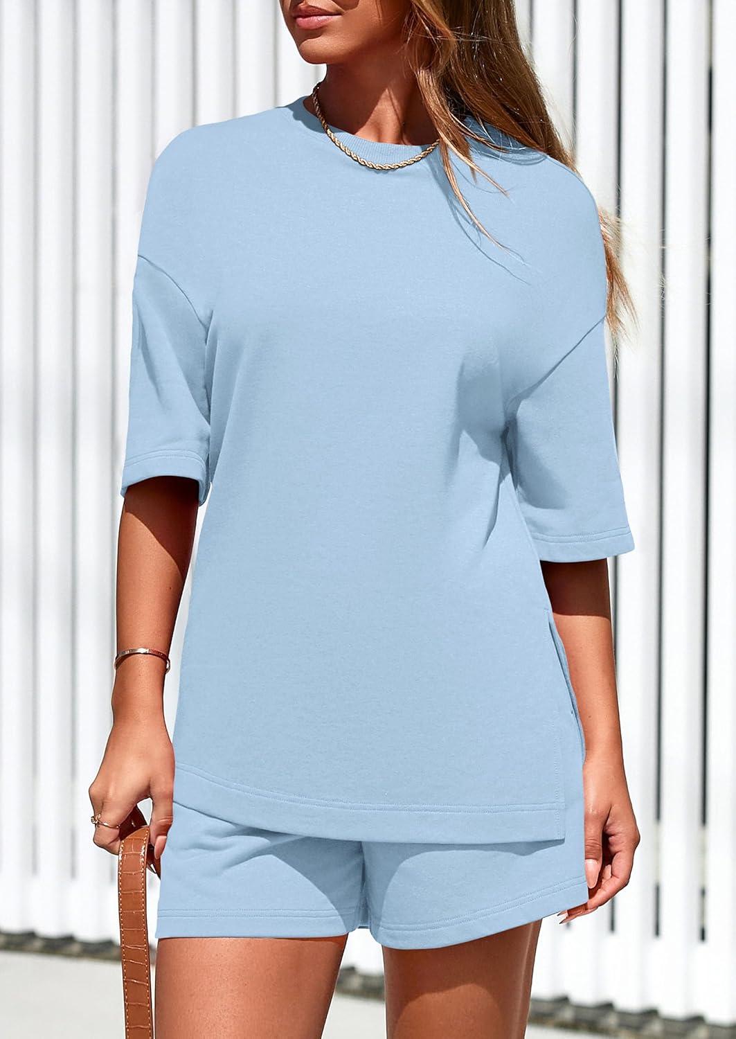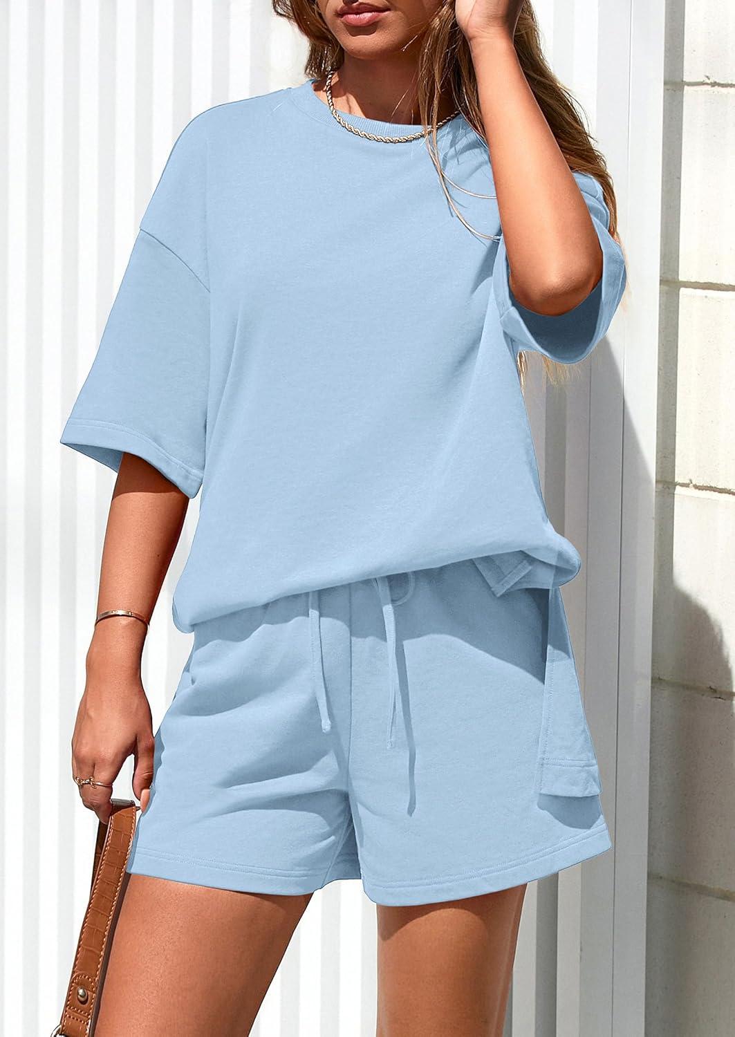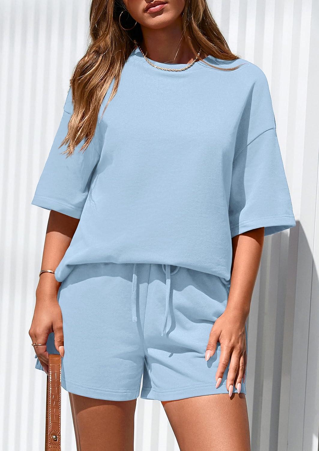 PRETTYGARDEN Women's 2 Piece Lounge Sets 2025 Summer Short Sleeve Tunic Tops Drawstring Shorts Matching Outfits Tracksuits(Light Blue)