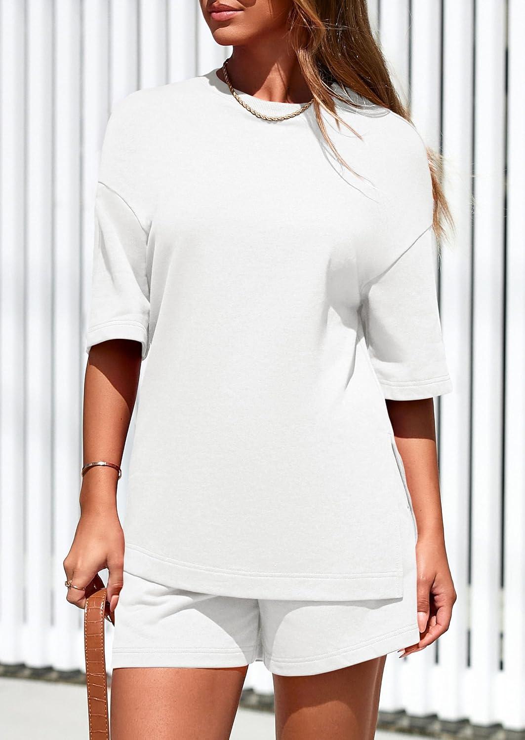 PRETTYGARDEN Women’s 2 Piece Lounge Sets 2025 Summer Short Sleeve Tunic Tops Drawstring Shorts Matching Outfits Tracksuits(White)