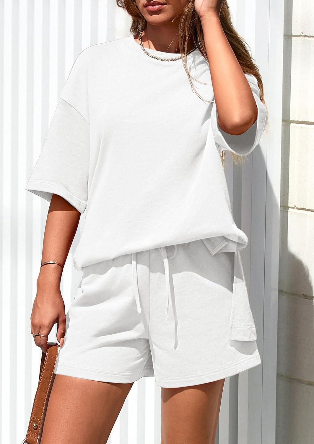 PRETTYGARDEN Women's 2 Piece Lounge Sets 2025 Summer Short Sleeve Tunic Tops Drawstring Shorts Matching Outfits Tracksuits(White)