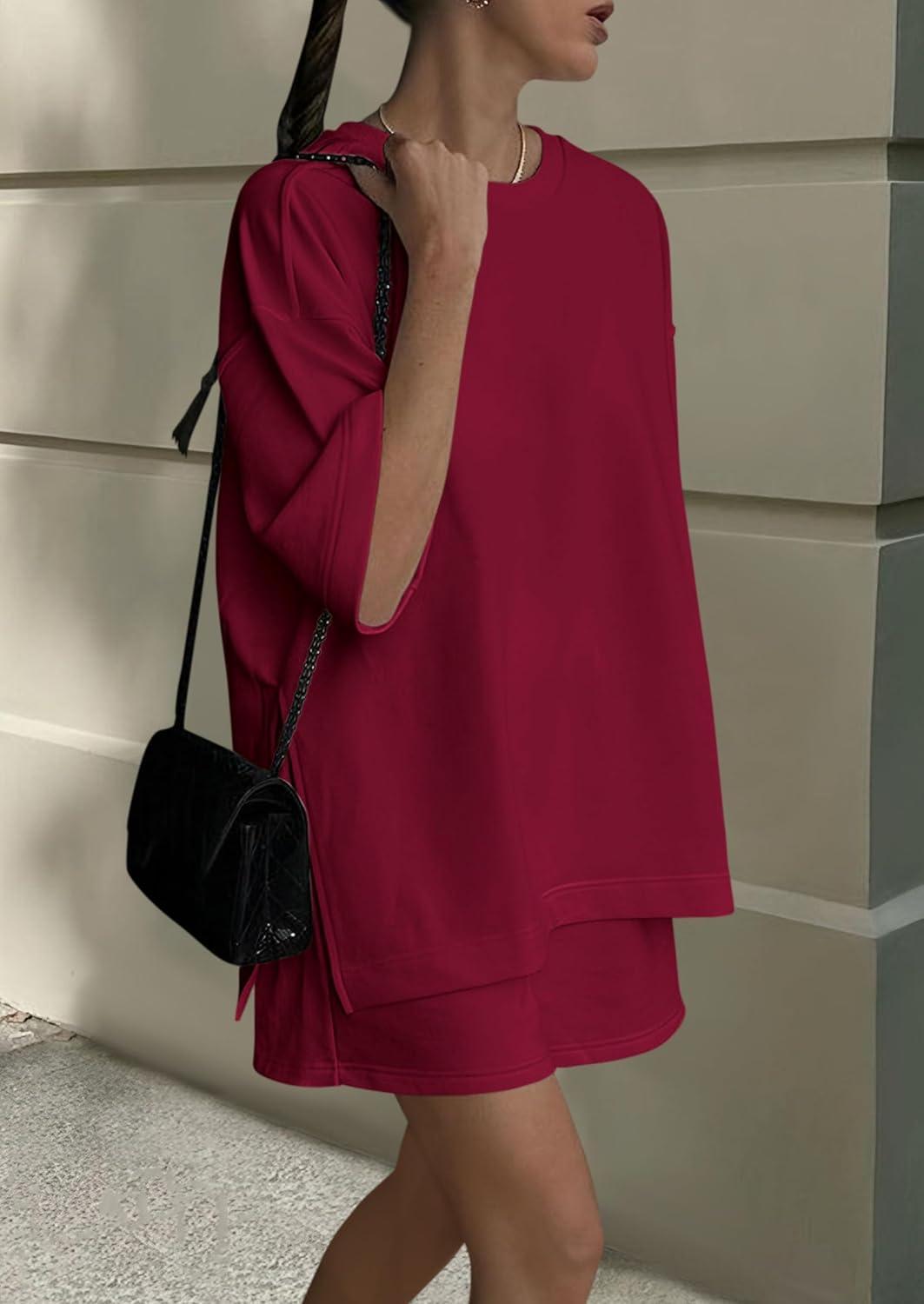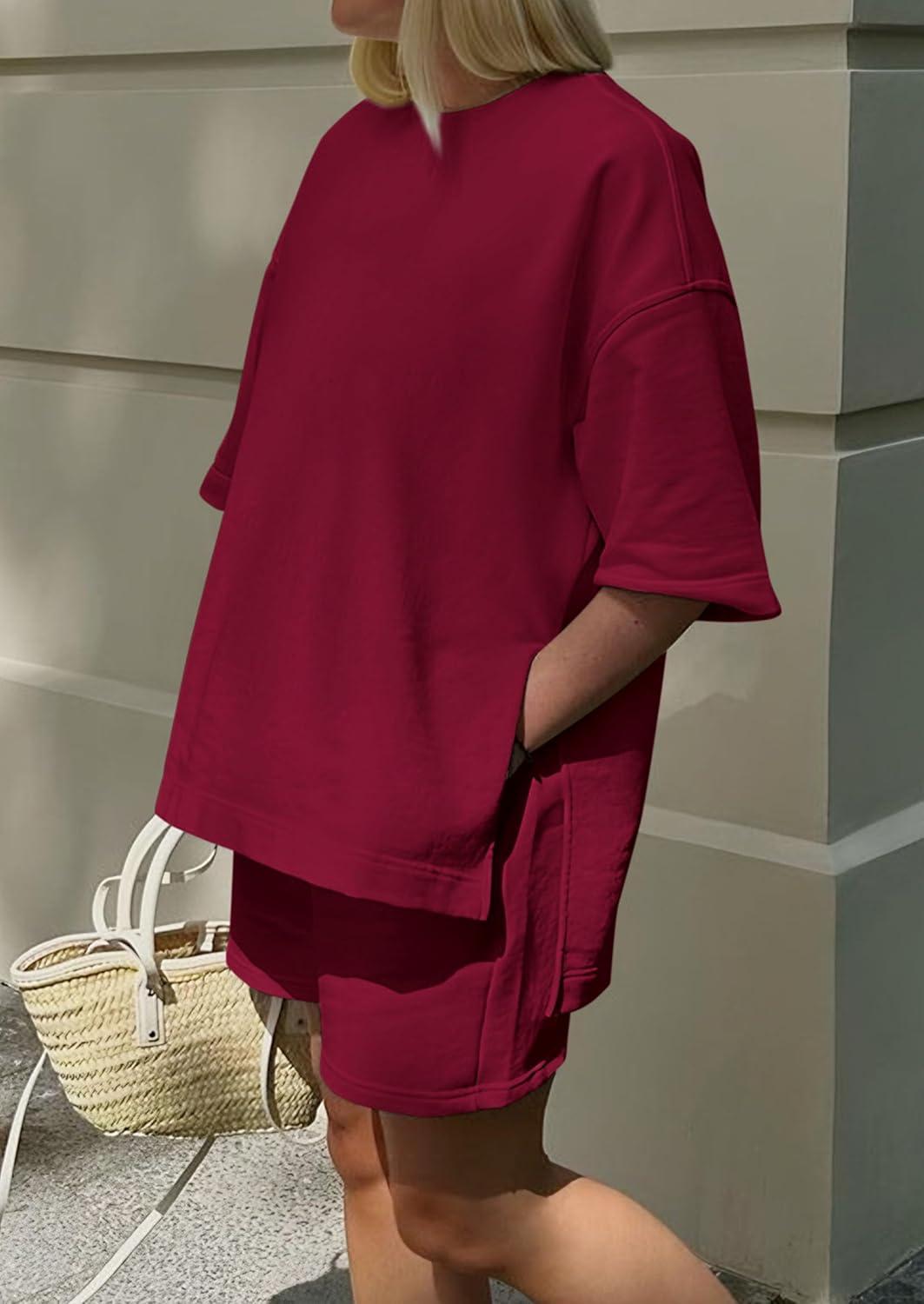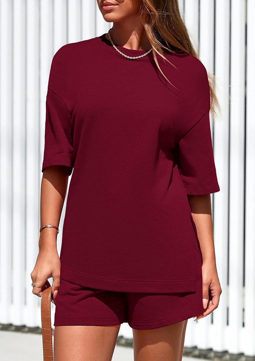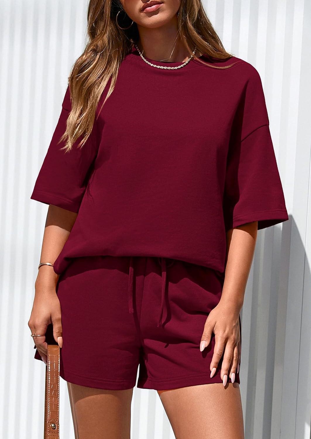 PRETTYGARDEN Women's 2 Piece Lounge Sets 2025 Summer Short Sleeve Tunic Tops Drawstring Shorts Matching Outfits Tracksuits(Wine Red)