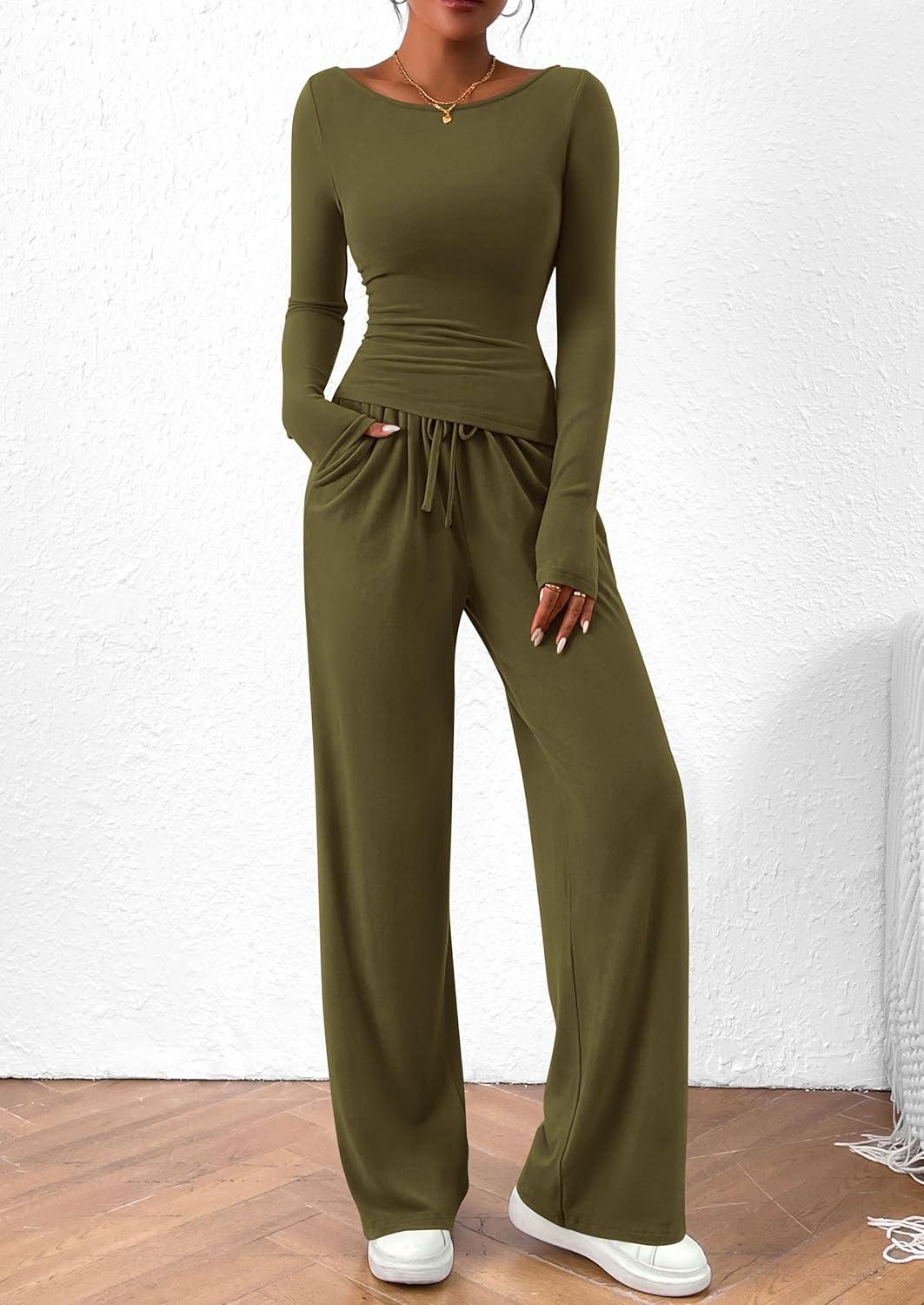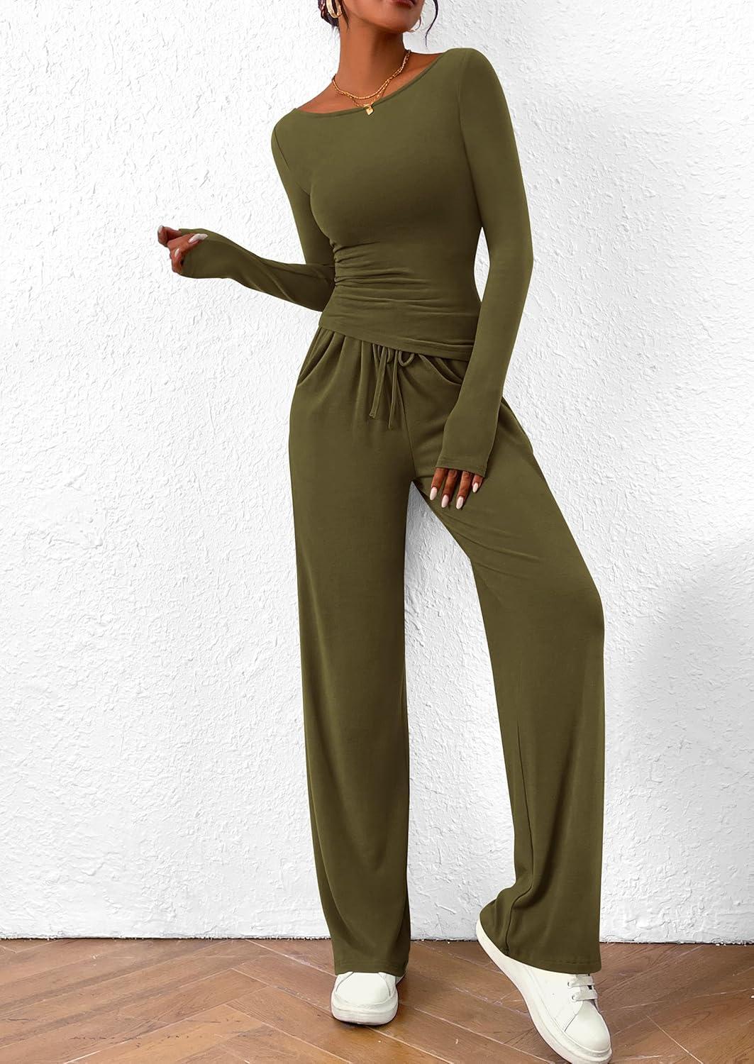 PRETTYGARDEN Women's 2 Piece Lounge Sets Asymmetrical Long Sleeve T Shirt Wide Leg Pants Casual Outfits Tracksuit(Army Green)