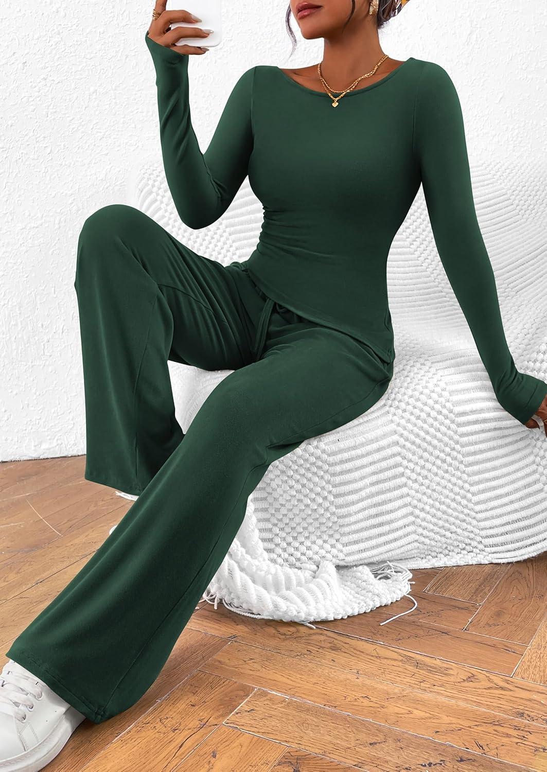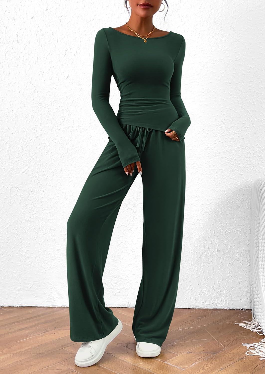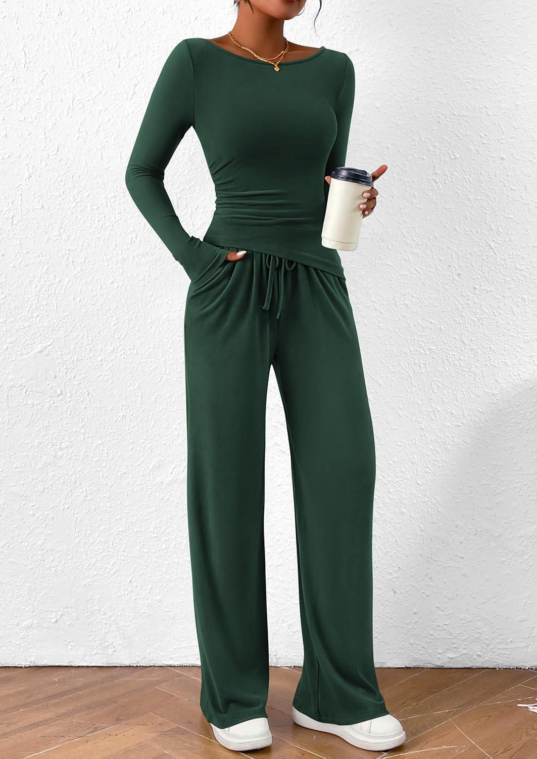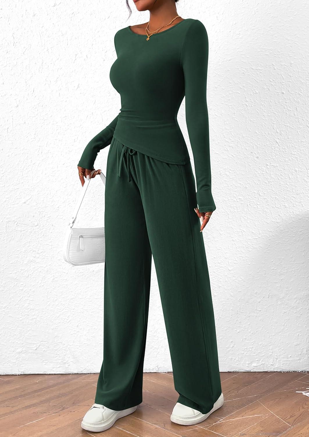 PRETTYGARDEN Women's 2 Piece Lounge Sets Asymmetrical Long Sleeve T Shirt Wide Leg Pants Casual Outfits Tracksuit(Dark Green)