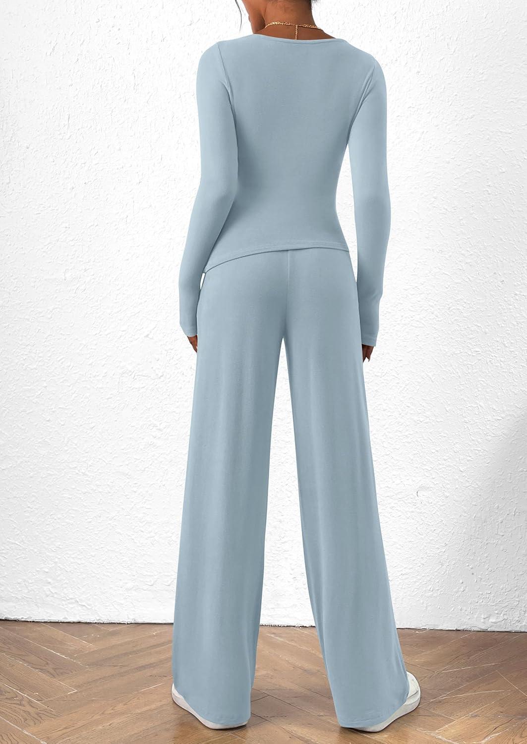 PRETTYGARDEN Women's 2 Piece Lounge Sets Asymmetrical Long Sleeve T Shirt Wide Leg Pants Casual Outfits Tracksuit(Light Blue)