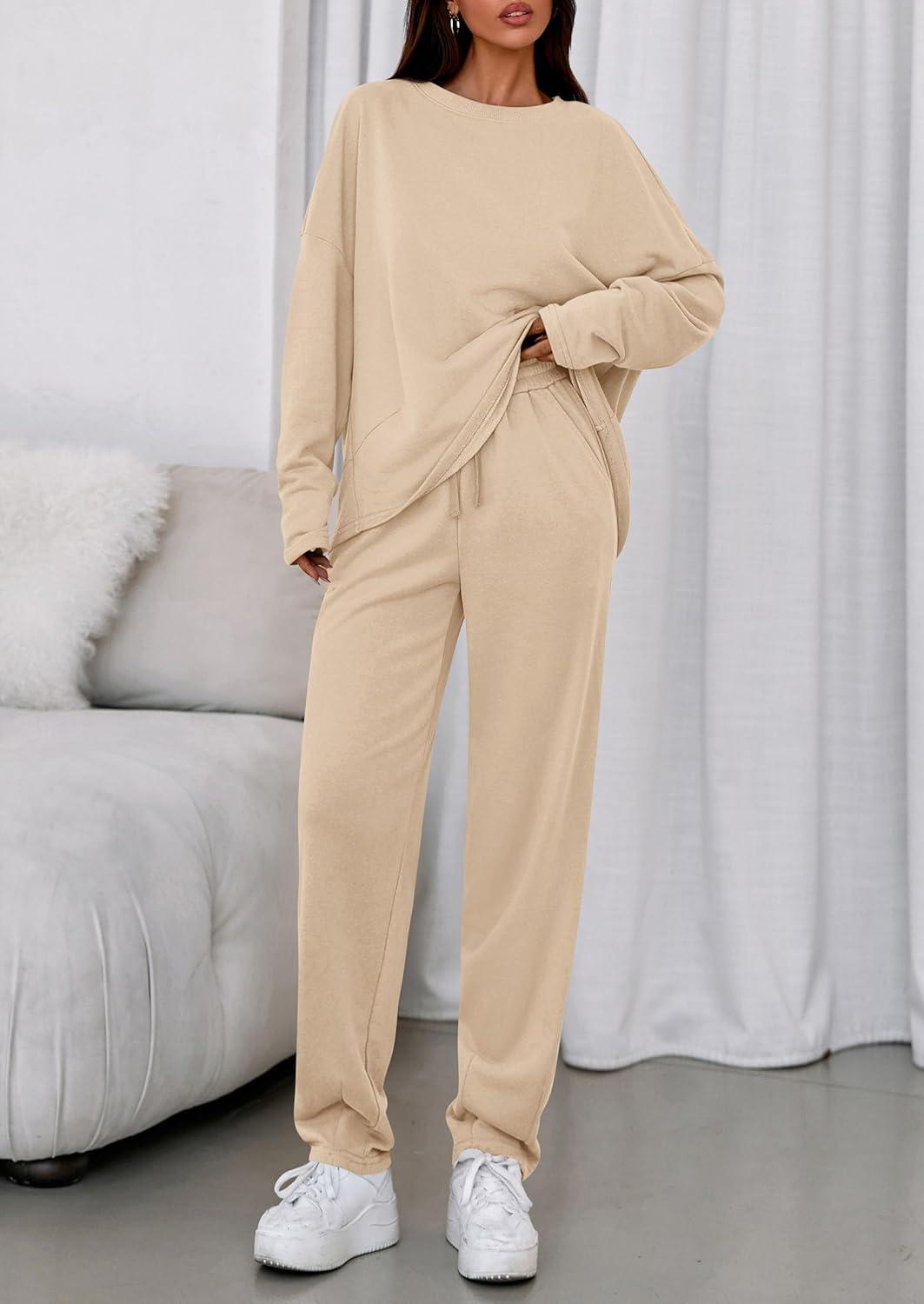 PRETTYGARDEN Womens 2 Piece Matching Lounge Sets 2025 Fall Long Sleeve Boatneck Sweatsuit Drawstring Sweatpants Pockets(Beige)