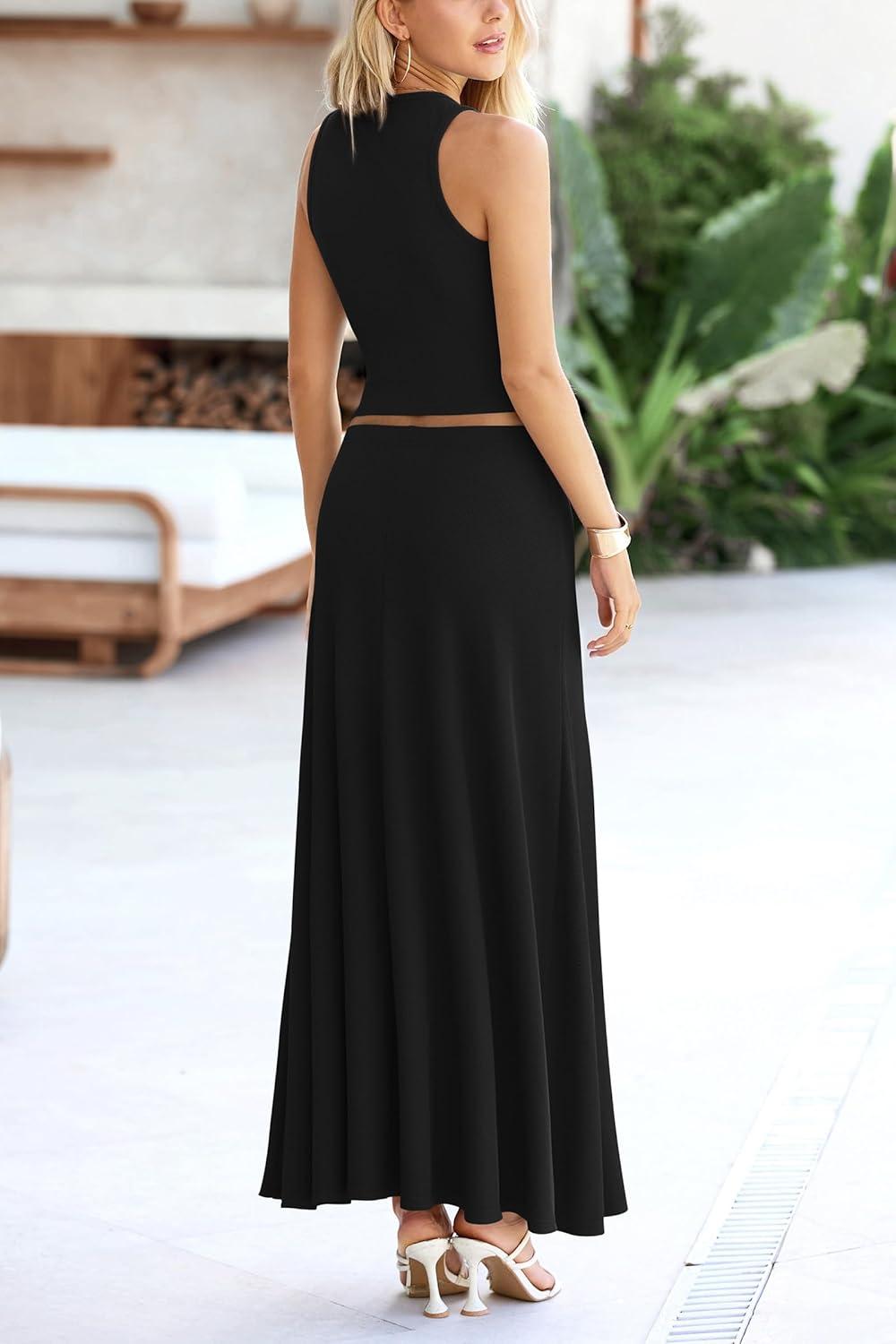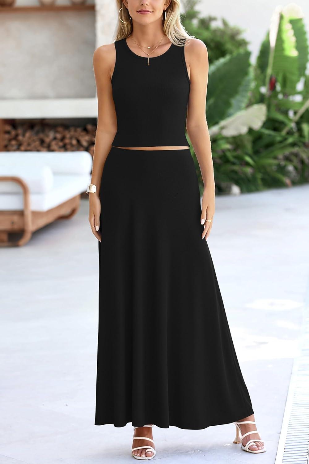 PRETTYGARDEN Women's 2 Piece Maxi Skirt Sets Casual Summer Knit Cropped Tank Top High Waisted Long Skirts Outfit(Black)