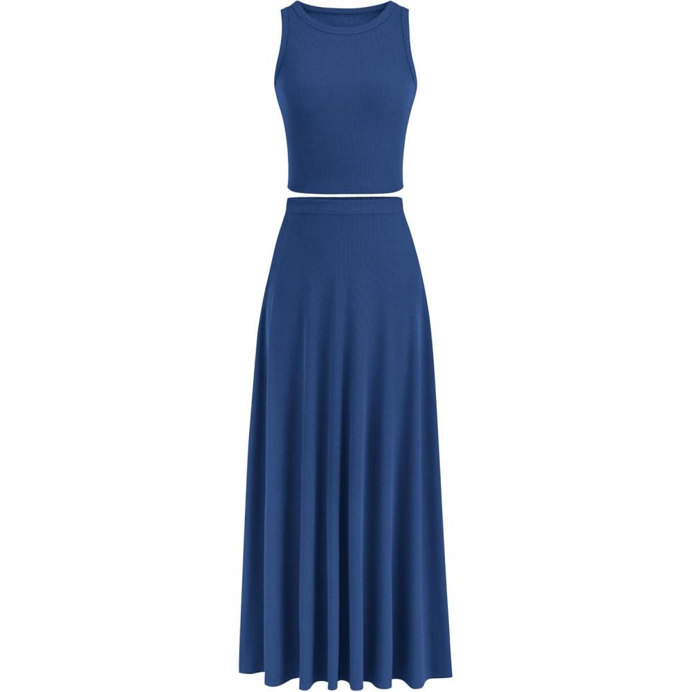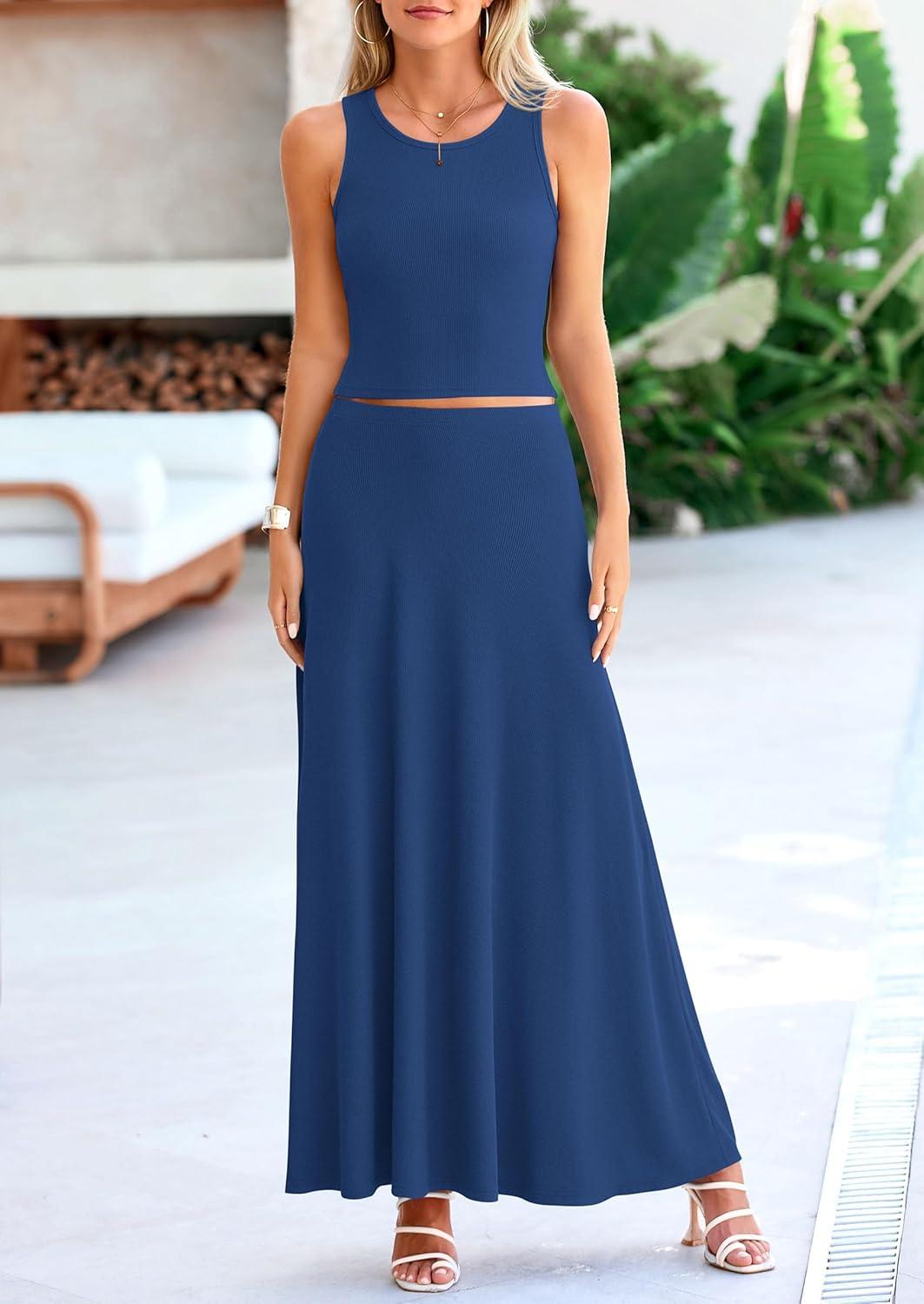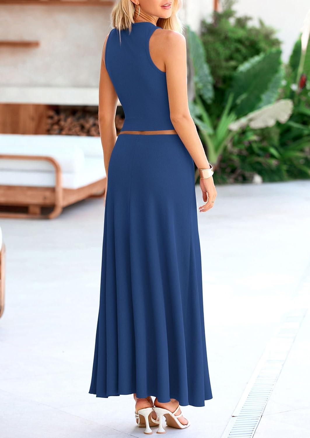 PRETTYGARDEN Women's 2 Piece Maxi Skirt Sets Casual Summer Knit Cropped Tank Top High Waisted Long Skirts Outfit(Dark Blue)
