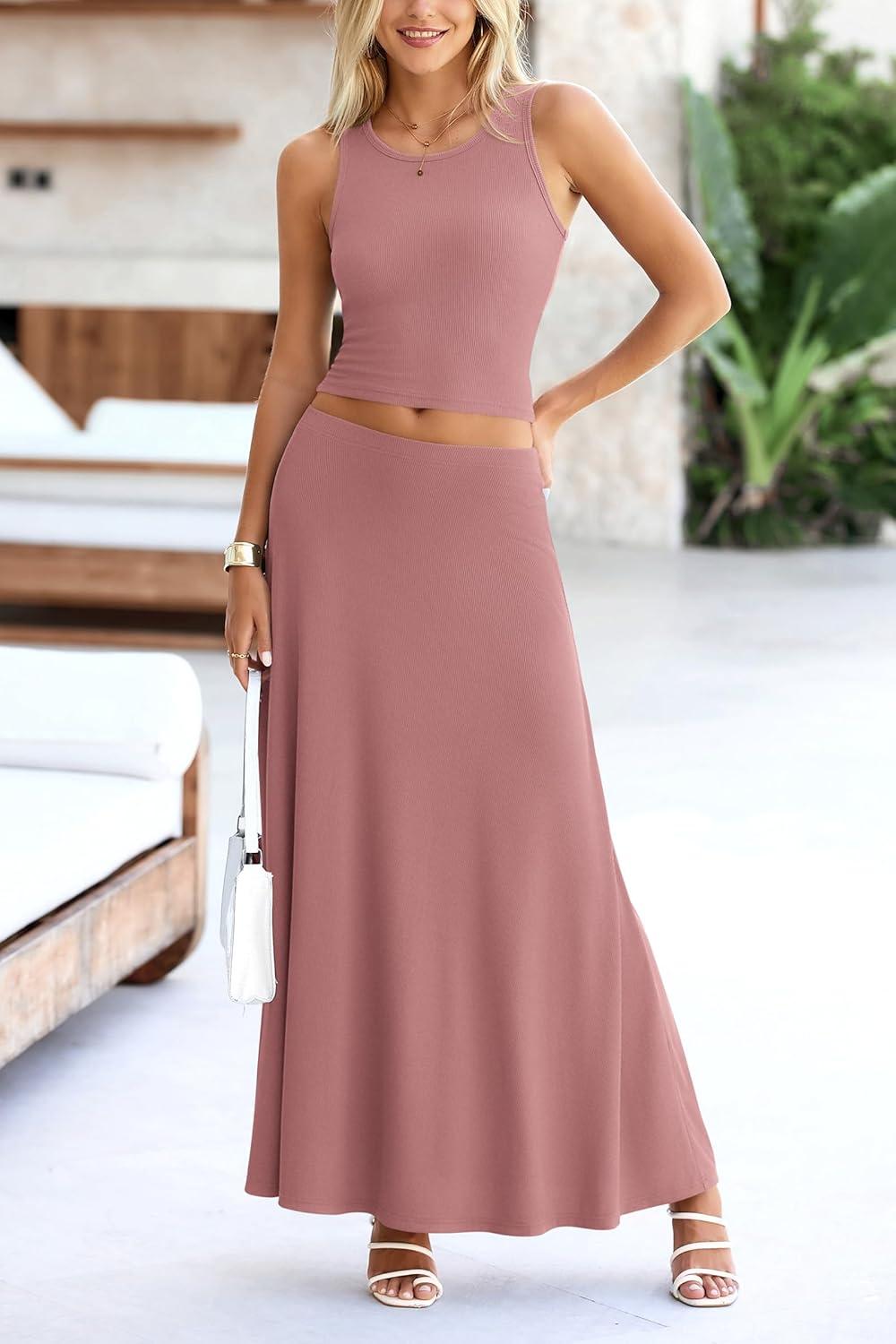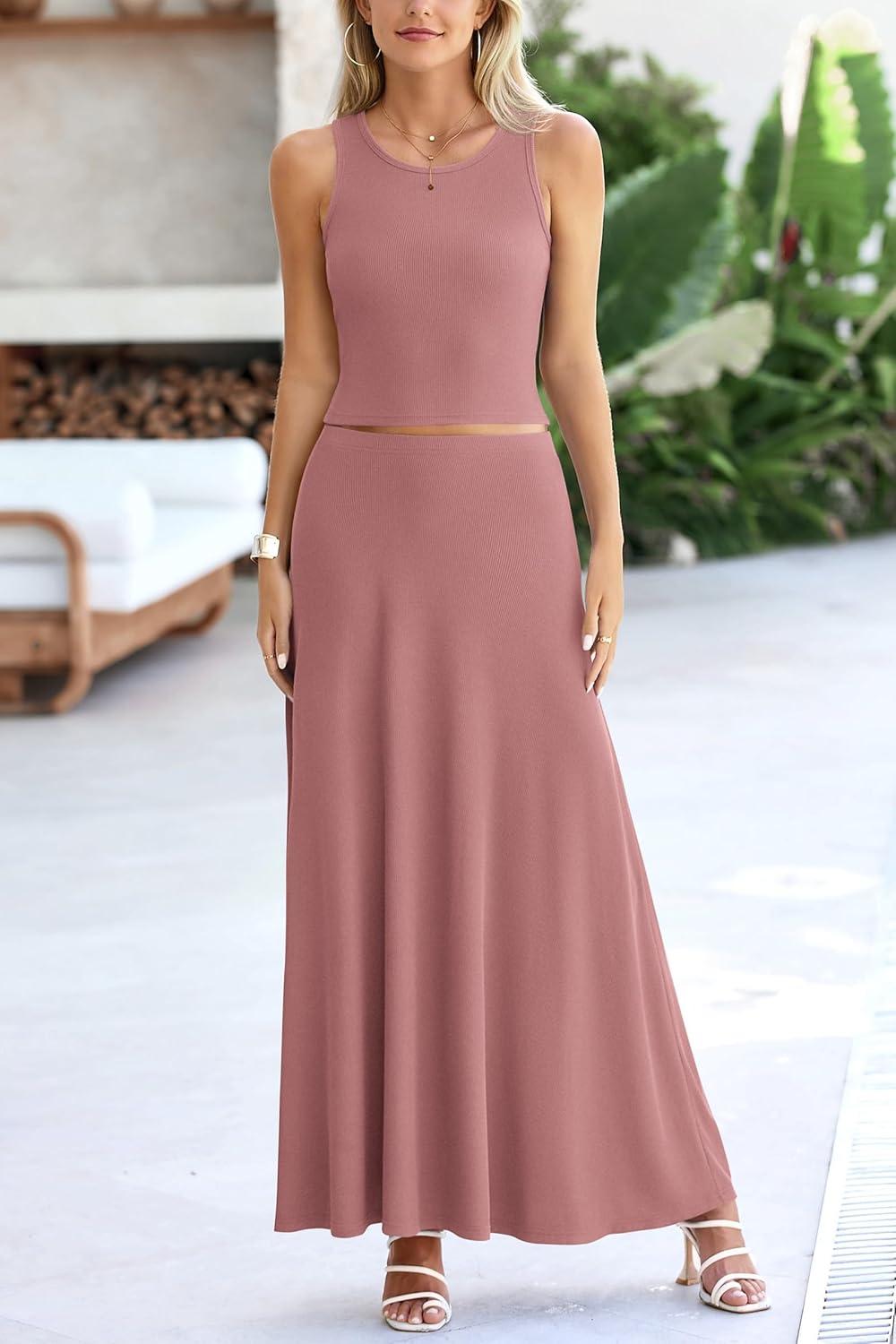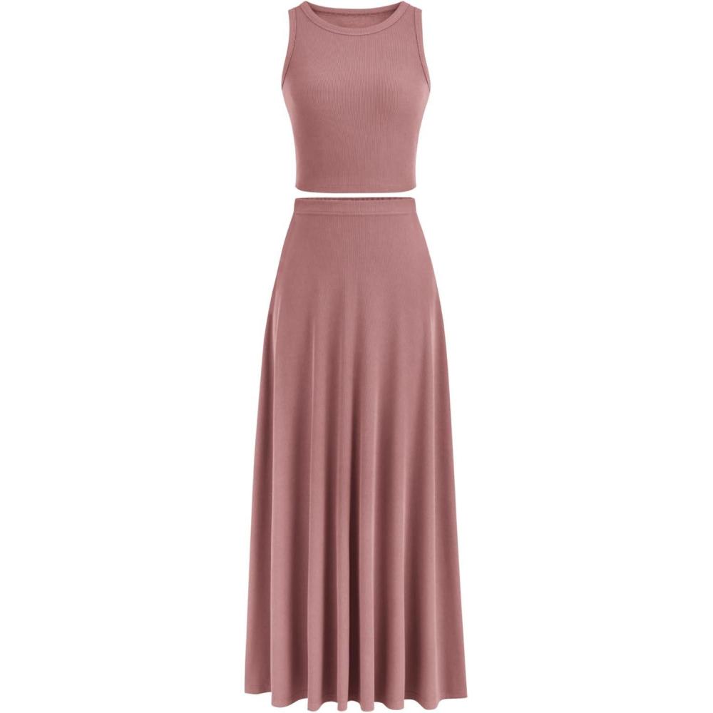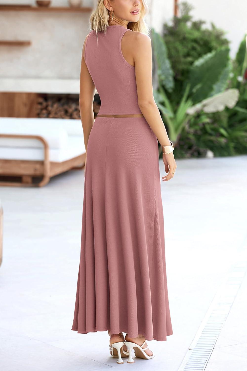 PRETTYGARDEN Women's 2 Piece Maxi Skirt Sets Casual Summer Knit Cropped Tank Top High Waisted Long Skirts Outfit(Dusty Pink)