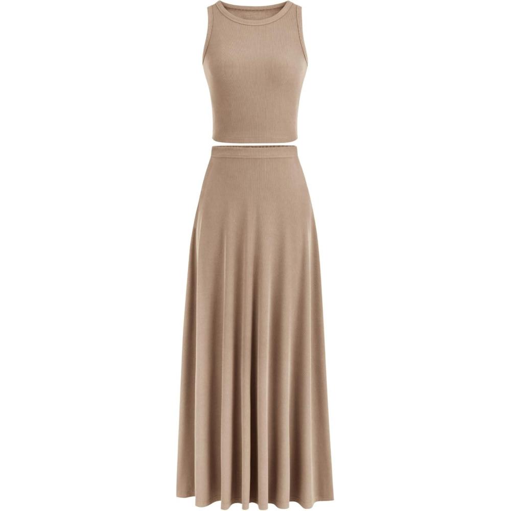 imagePRETTYGARDEN Womens 2 Piece Maxi Skirt Sets Casual Summer Knit Cropped Tank Top High Waisted Long Skirts OutfitKhaki