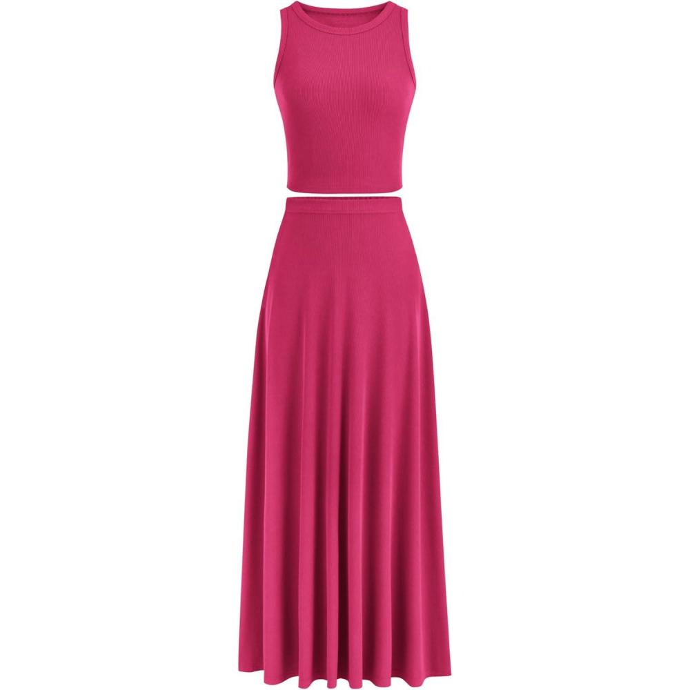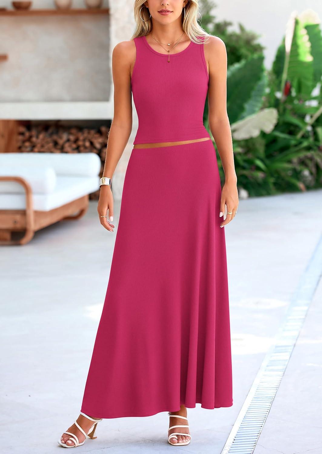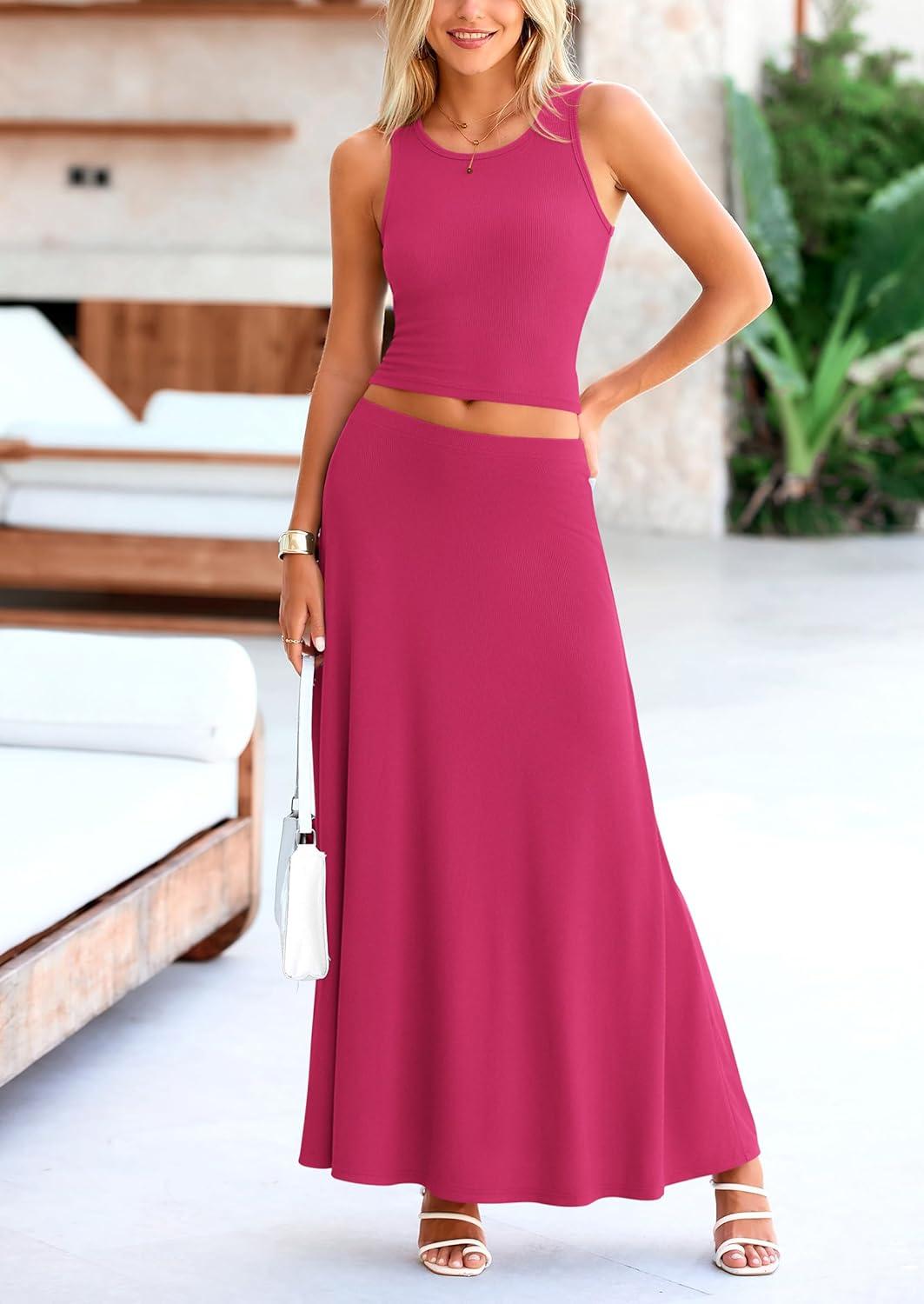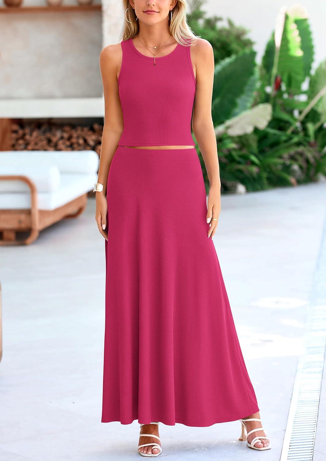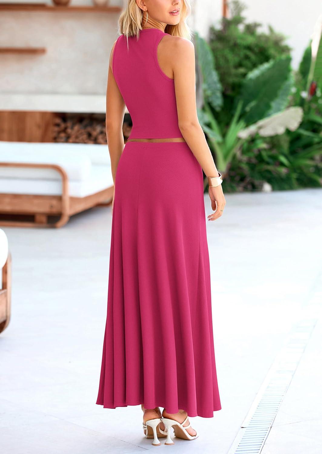 PRETTYGARDEN Women's 2 Piece Maxi Skirt Sets Casual Summer Knit Cropped Tank Top High Waisted Long Skirts Outfit(Rose Red)