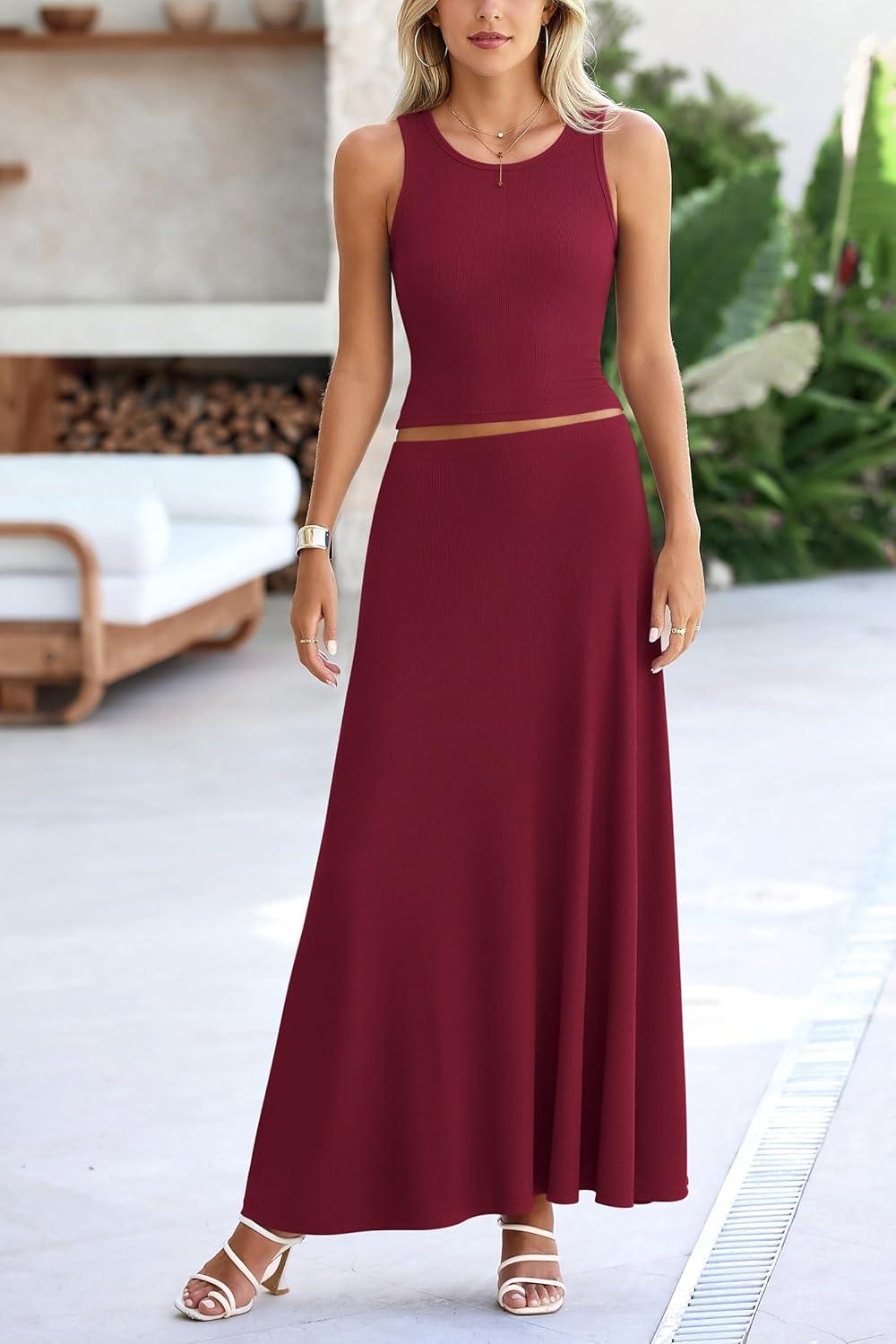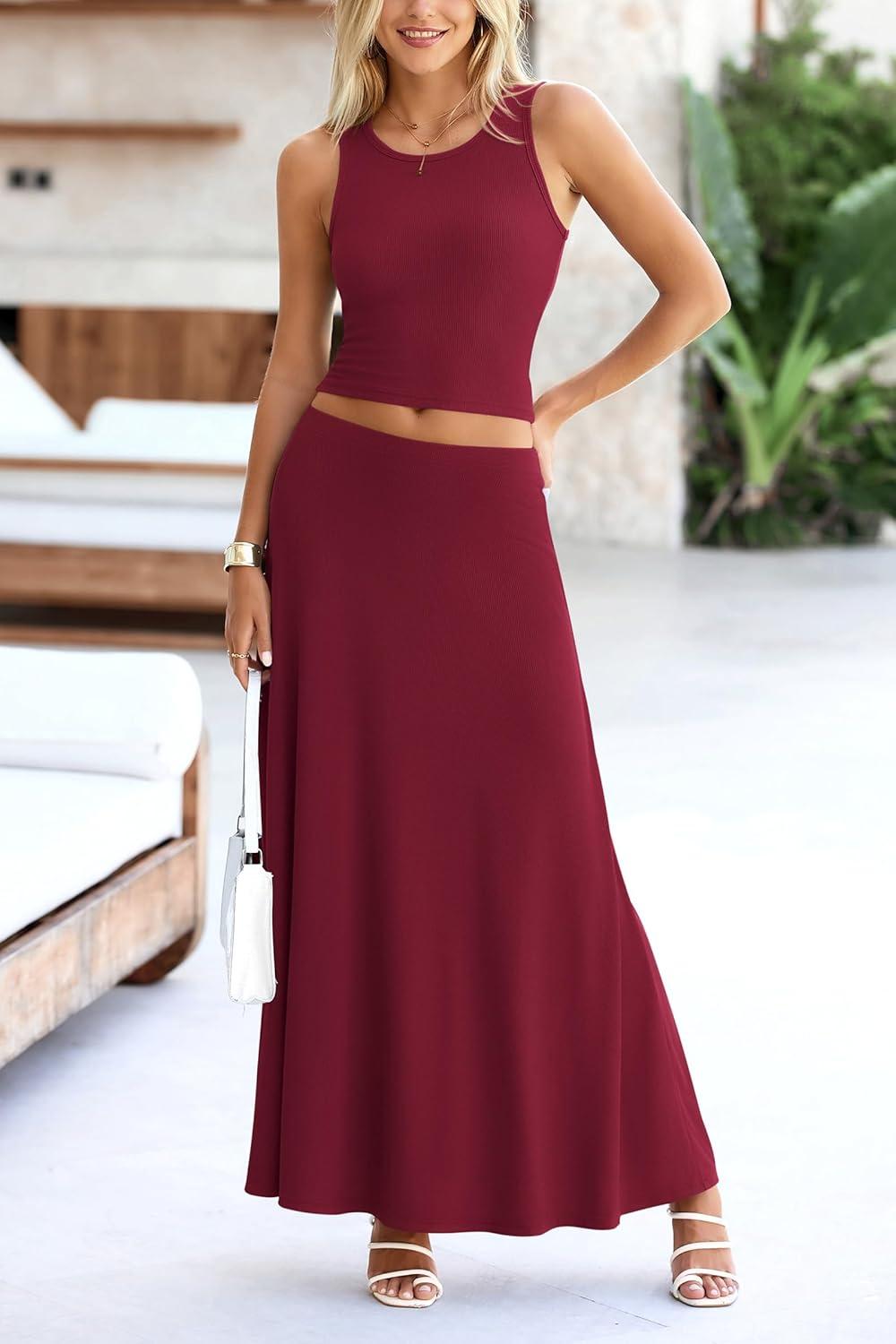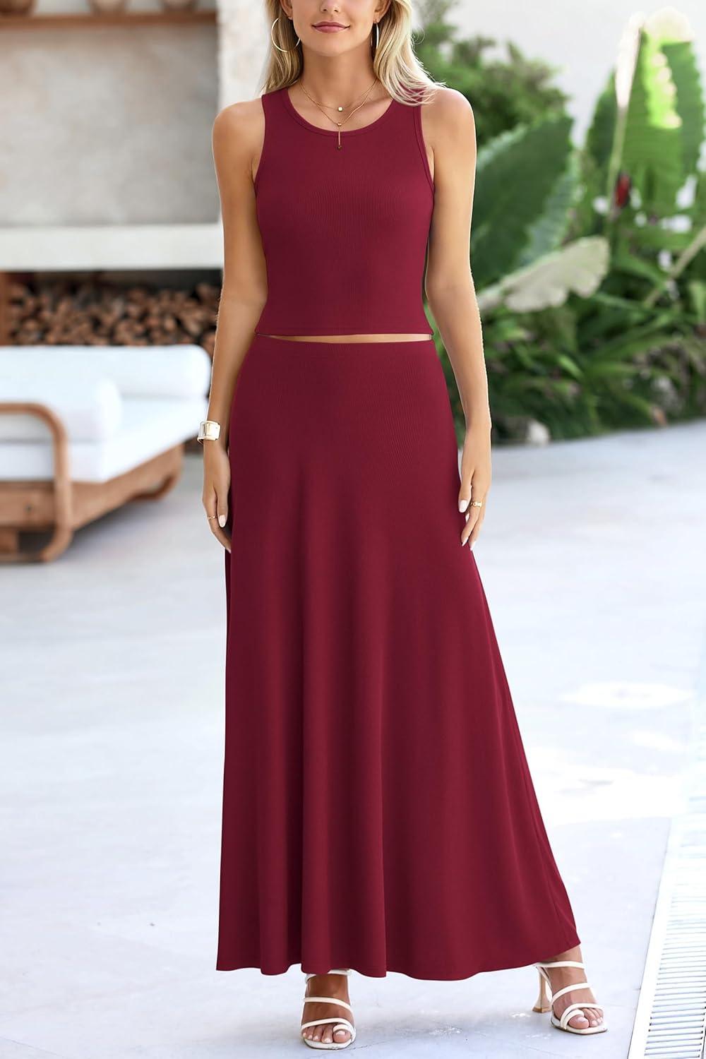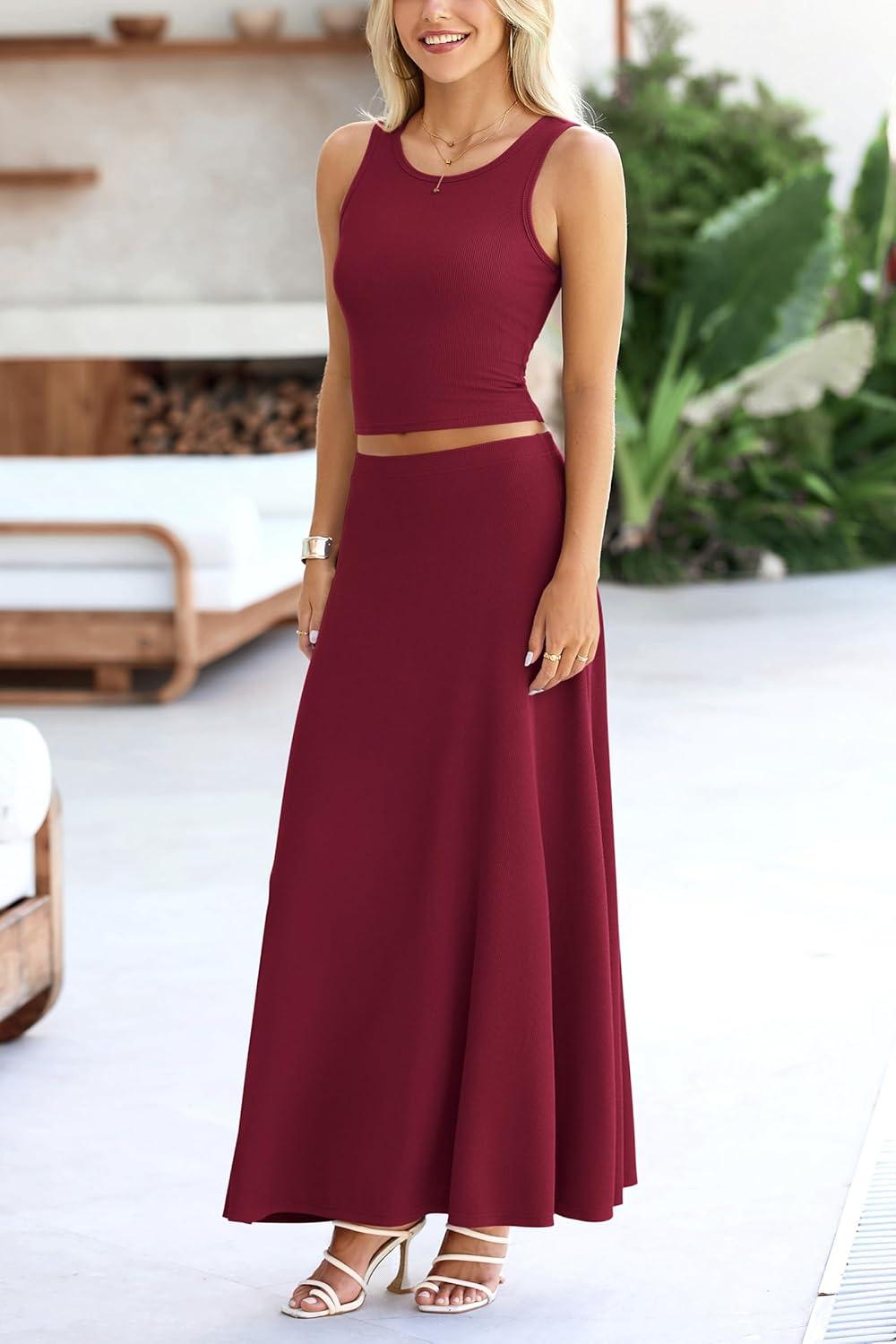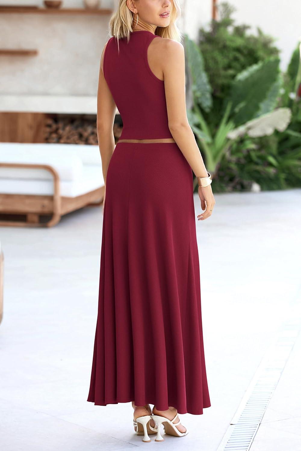 PRETTYGARDEN Women's 2 Piece Maxi Skirt Sets Casual Summer Knit Cropped Tank Top High Waisted Long Skirts Outfit(Wine Red)