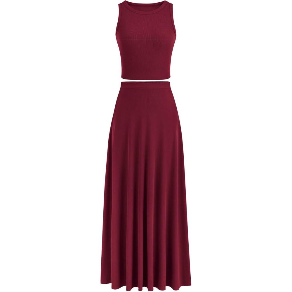 imagePRETTYGARDEN Womens 2 Piece Maxi Skirt Sets Casual Summer Knit Cropped Tank Top High Waisted Long Skirts OutfitWine Red