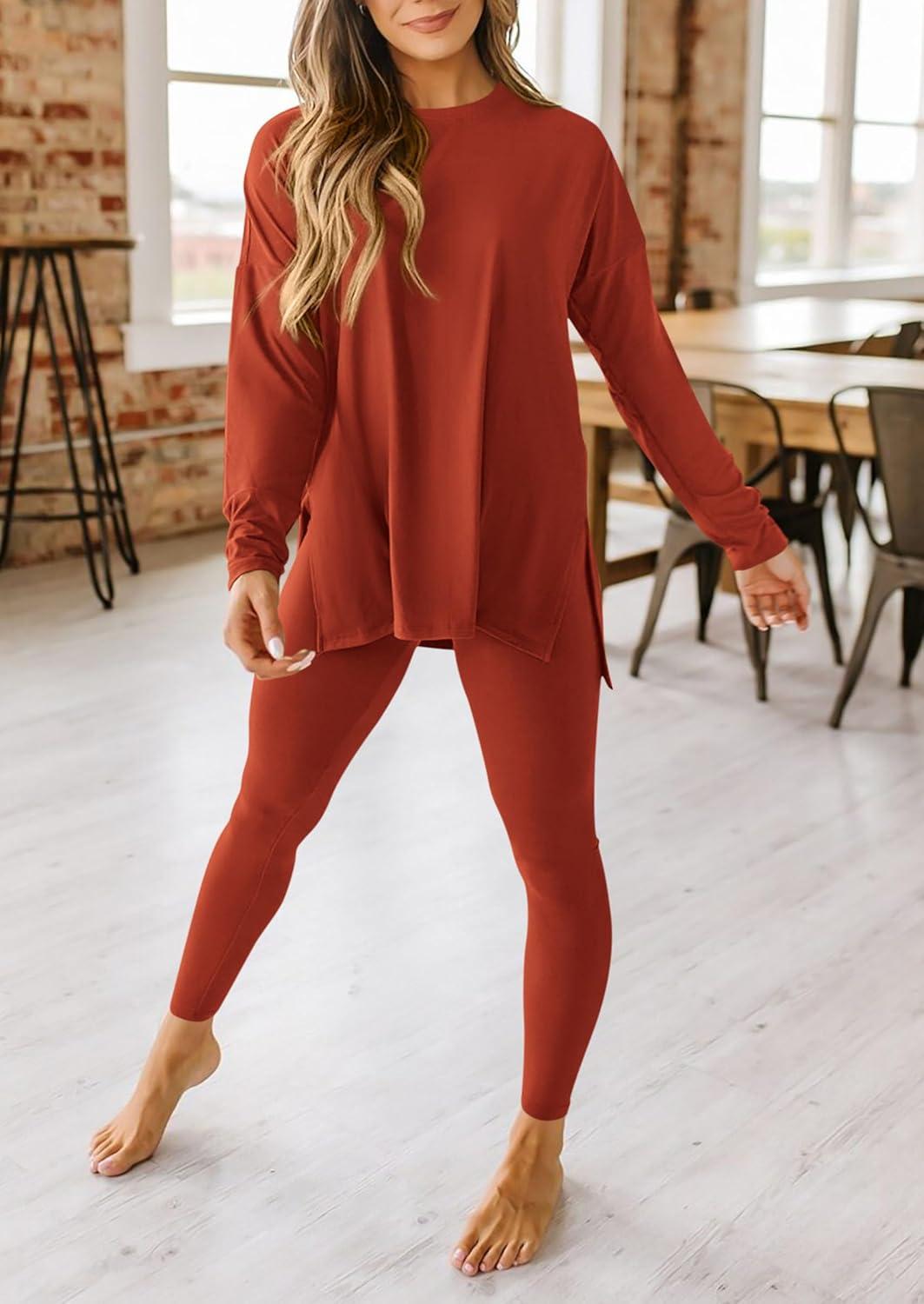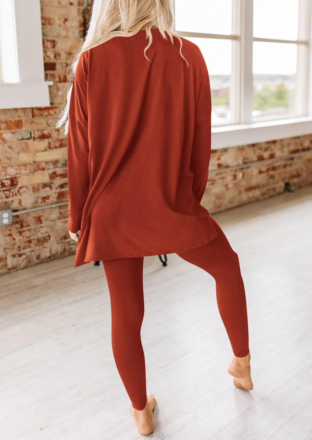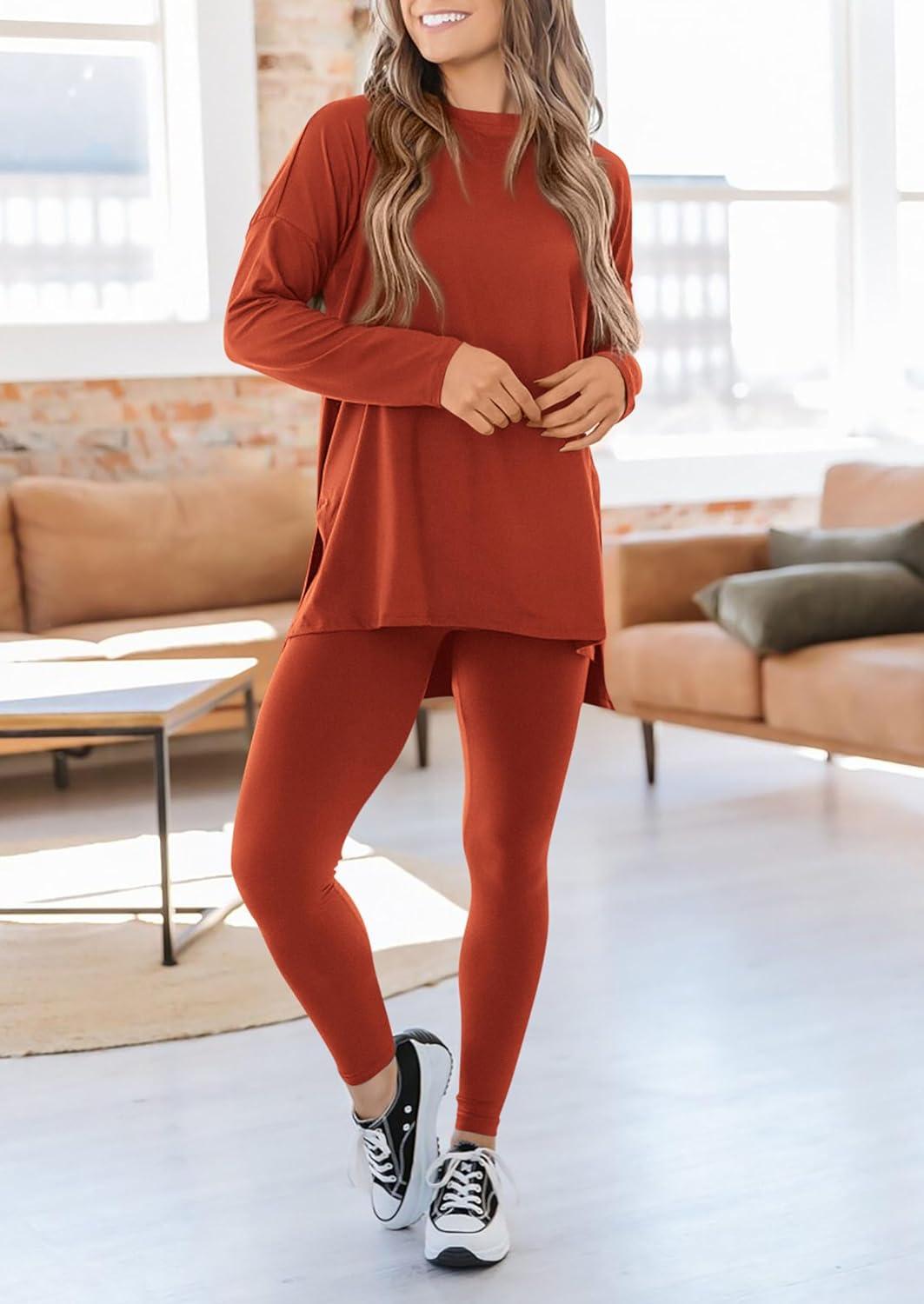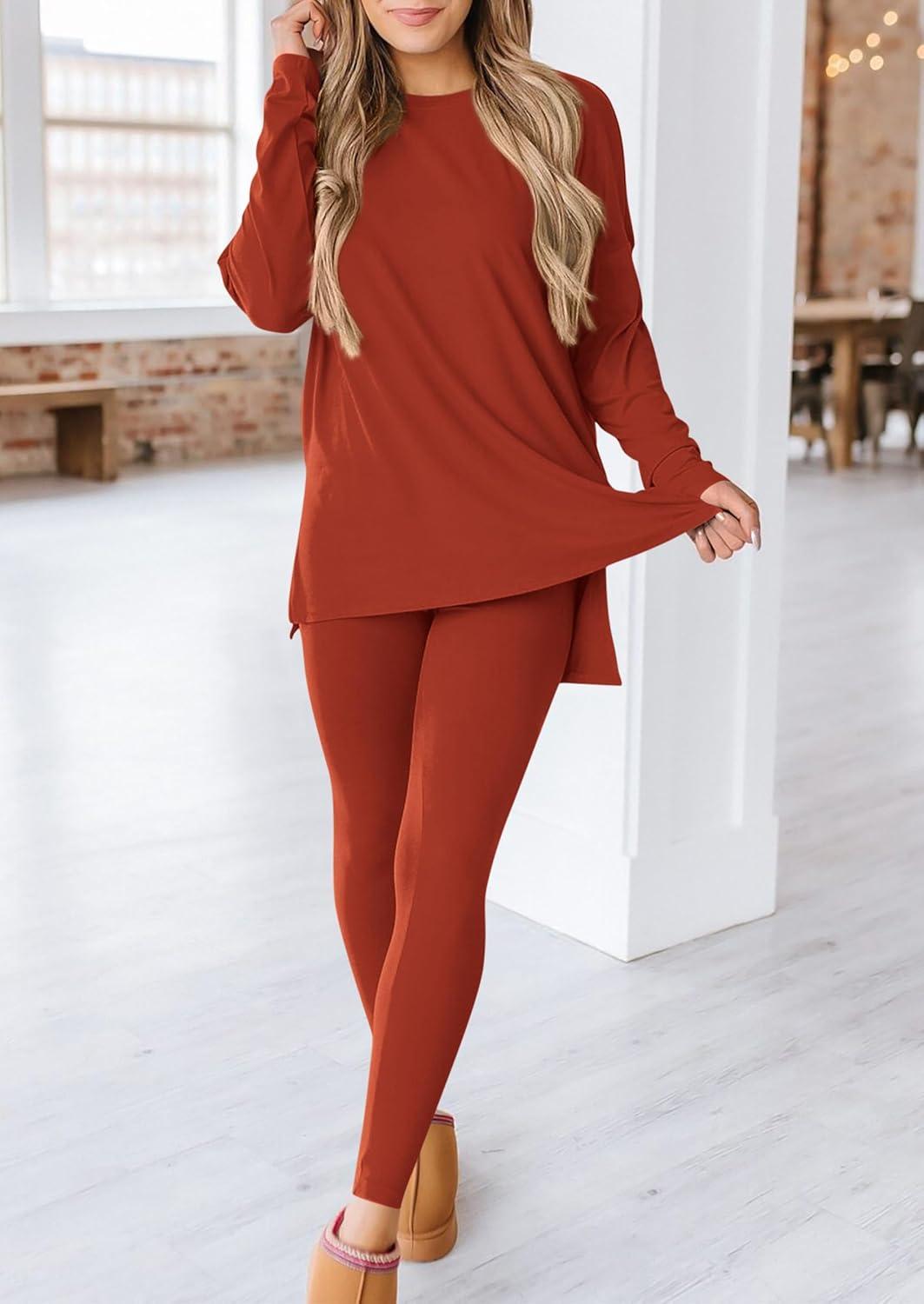 PRETTYGARDEN Women's 2 Piece Outfits 2025 Fall Casual Long Sleeve Tunic Tops Legging Pants Matching Lounge Sets Sweatsuits(Brick Red)