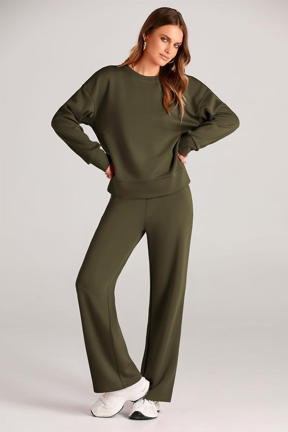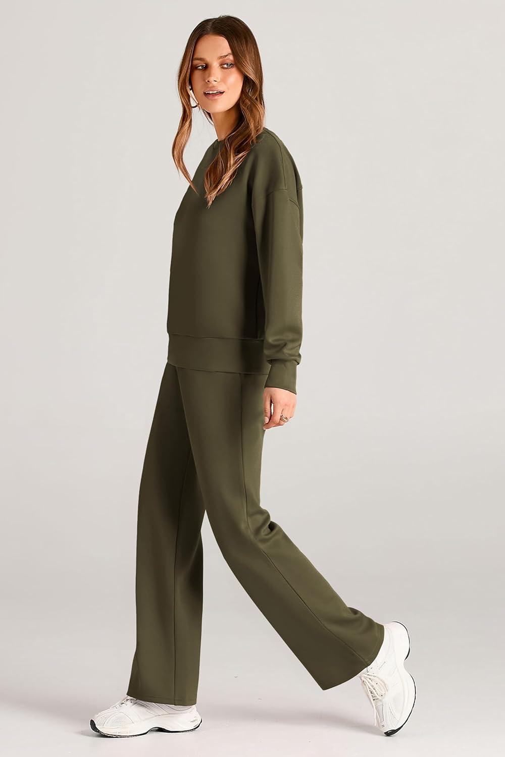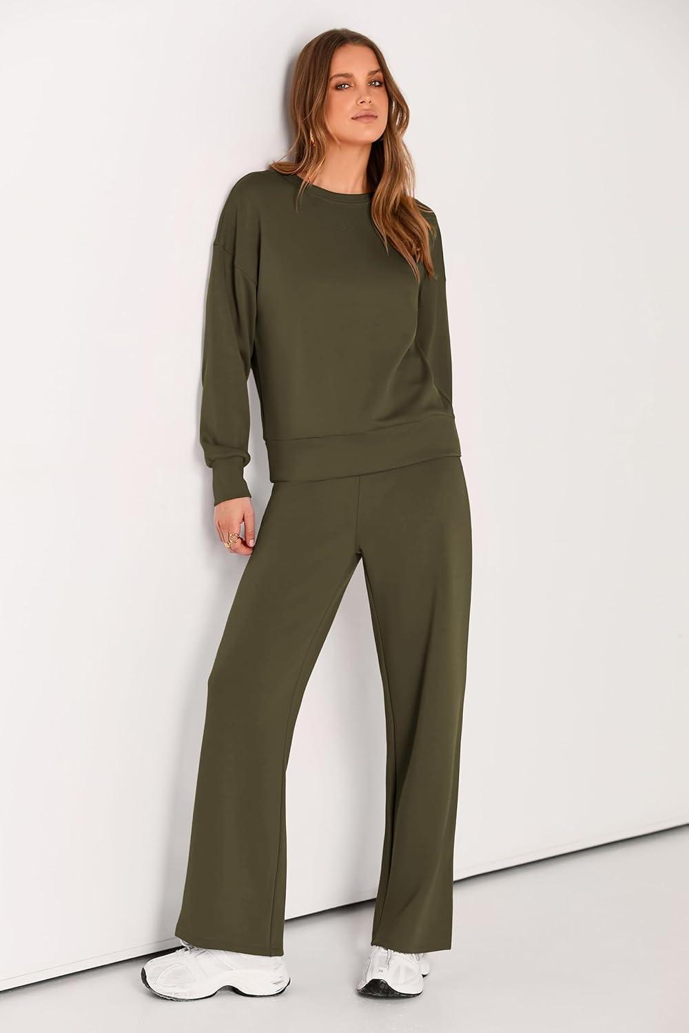 PRETTYGARDEN Womens 2 Piece Outfits 2025 Fall Long Sleeve Sweatshirt Wide Leg Pants Lounge Sets Winter Sweatsuits Tracksuit(Army Green)
