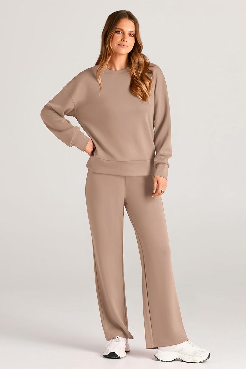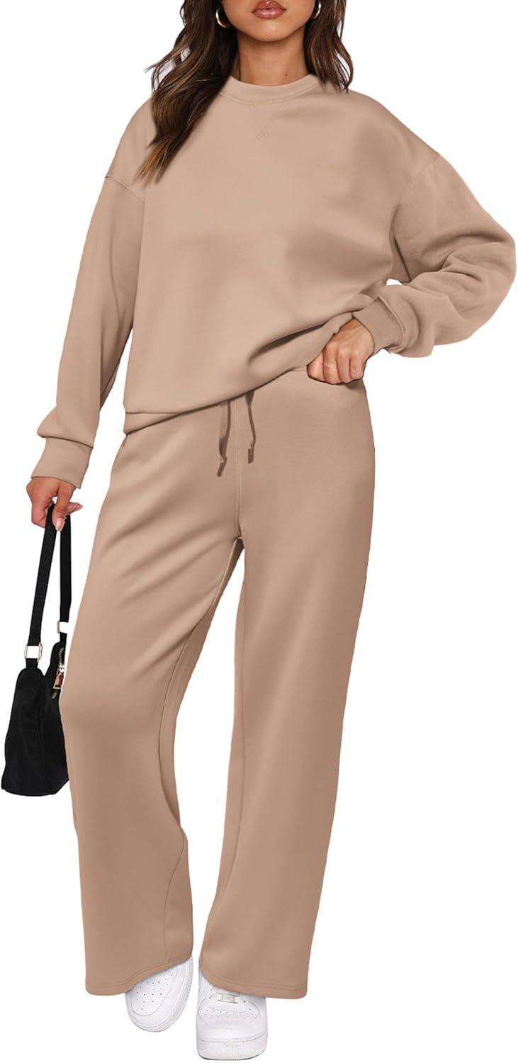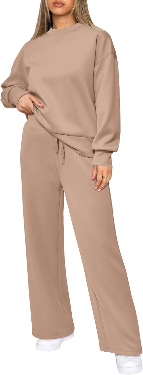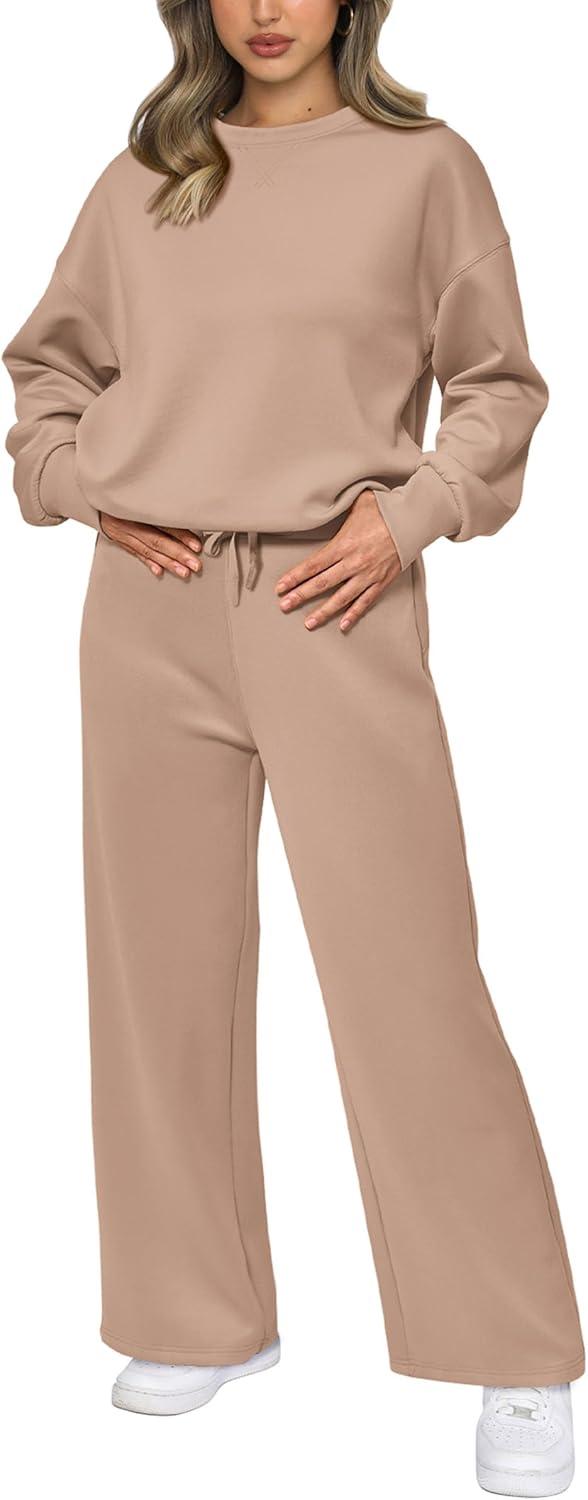 PRETTYGARDEN Womens 2 Piece Outfits 2025 Fall Long Sleeve Sweatshirt Wide Leg Pants Lounge Sets Winter Sweatsuits Tracksuit(Khaki)