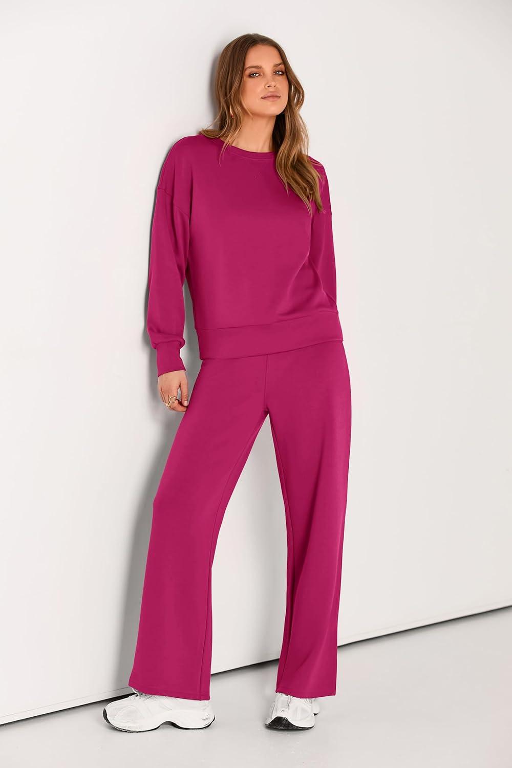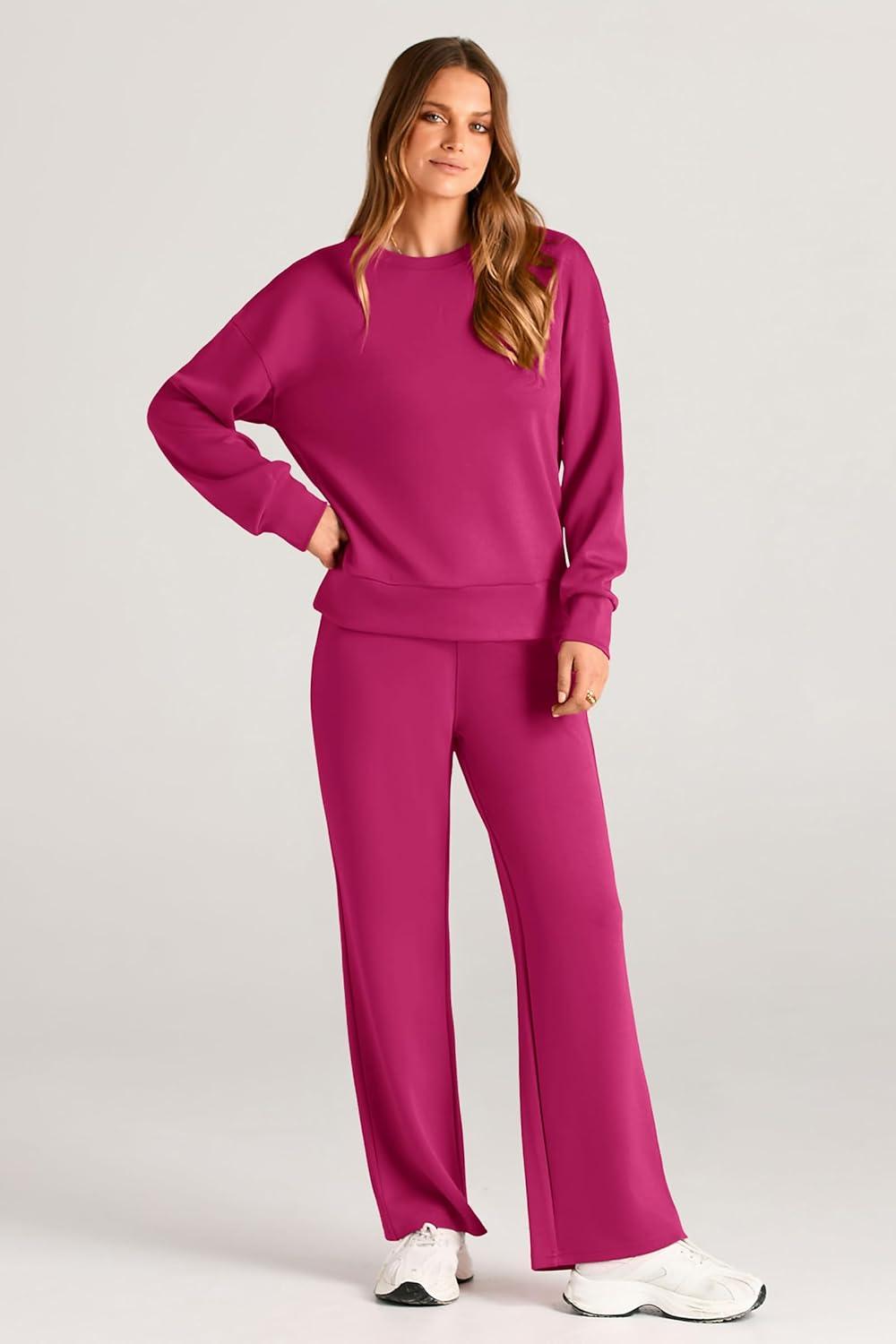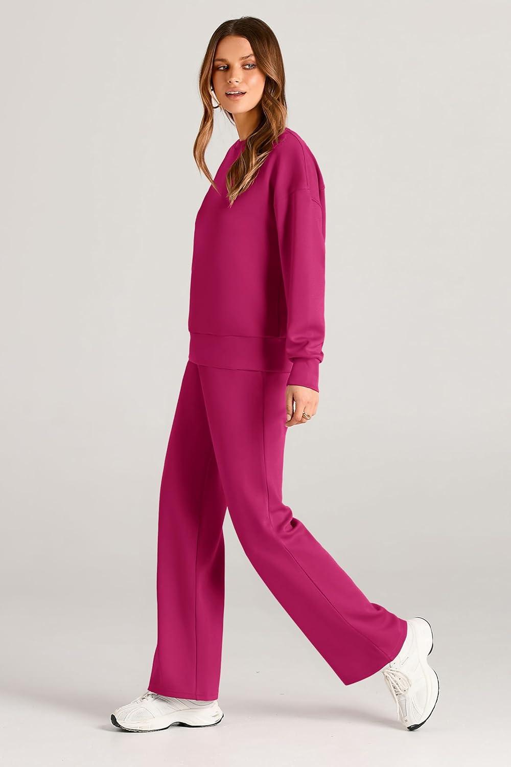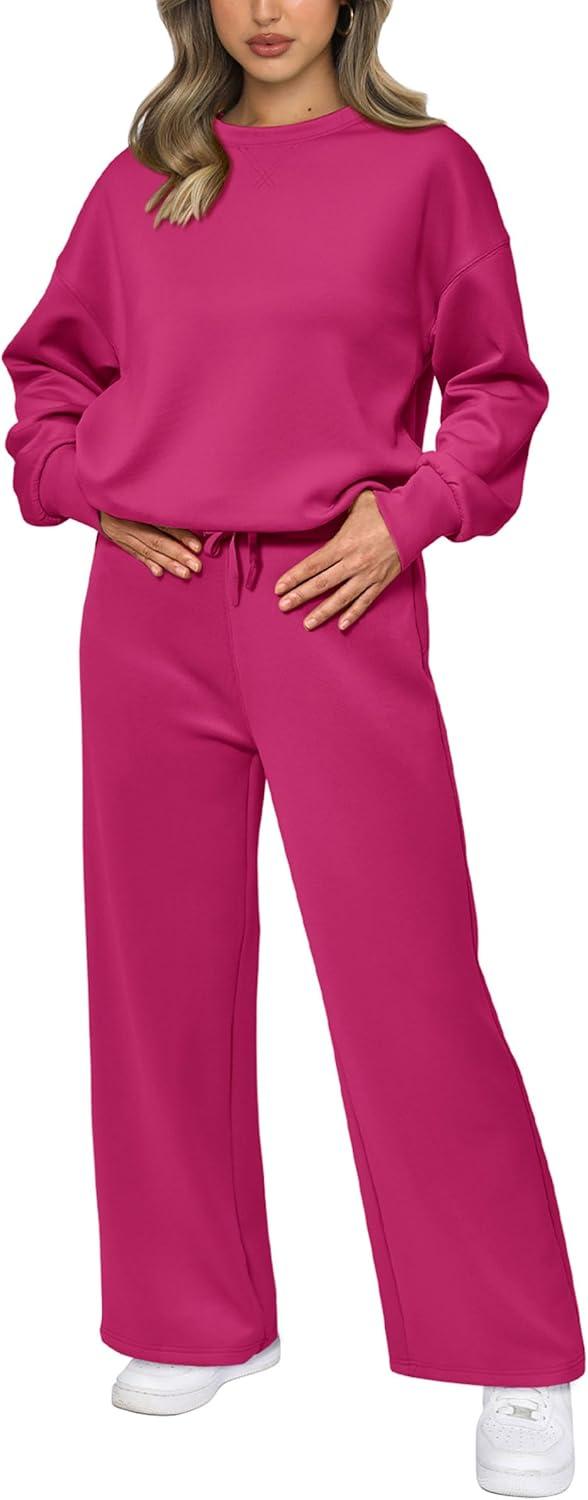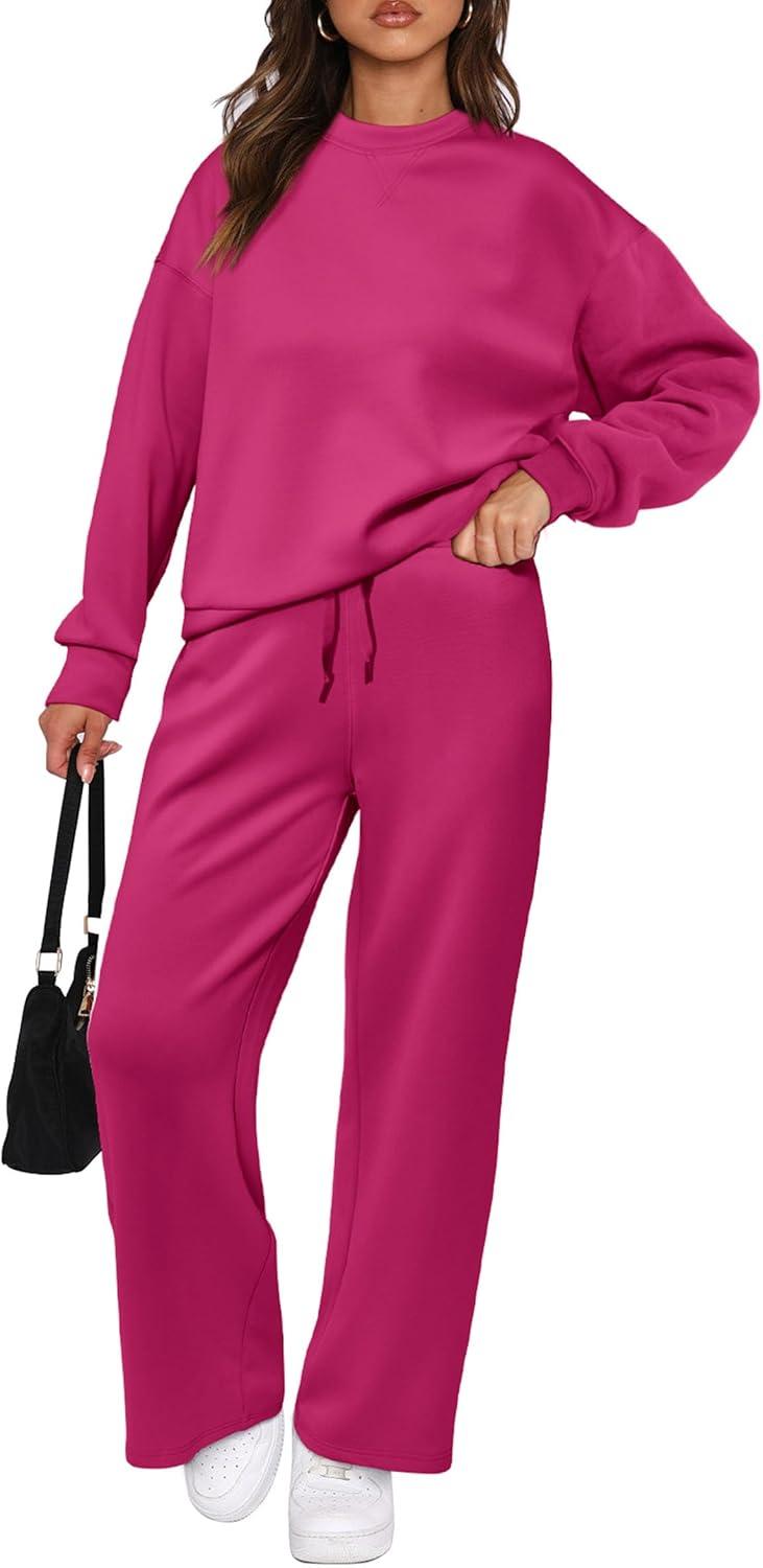 PRETTYGARDEN Womens 2 Piece Outfits 2025 Fall Long Sleeve Sweatshirt Wide Leg Pants Lounge Sets Winter Sweatsuits Tracksuit(Rose Red)