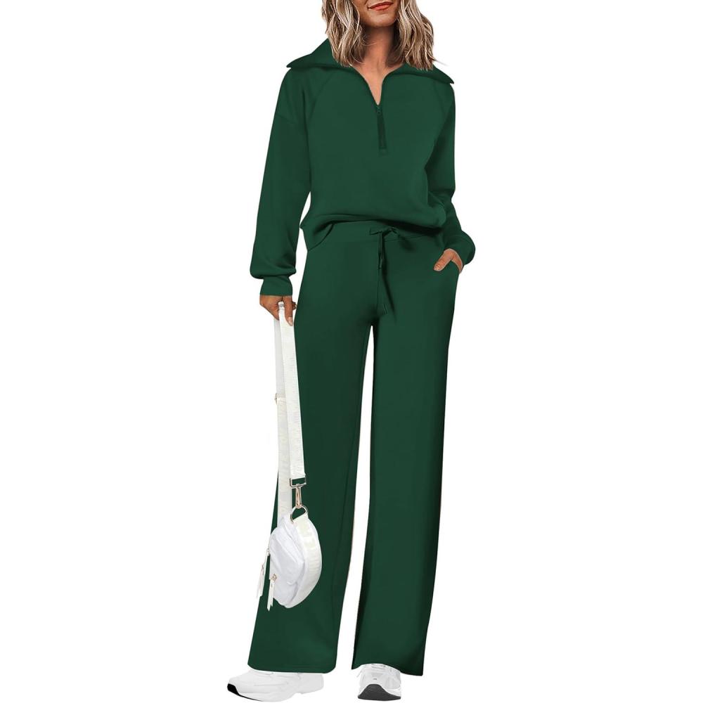 PRETTYGARDEN Women’s 2 Piece Outfits Casual Lapel Half Zip Sweatshirts And Wide Leg Pants Tracksuit Sets(Dark Green)
