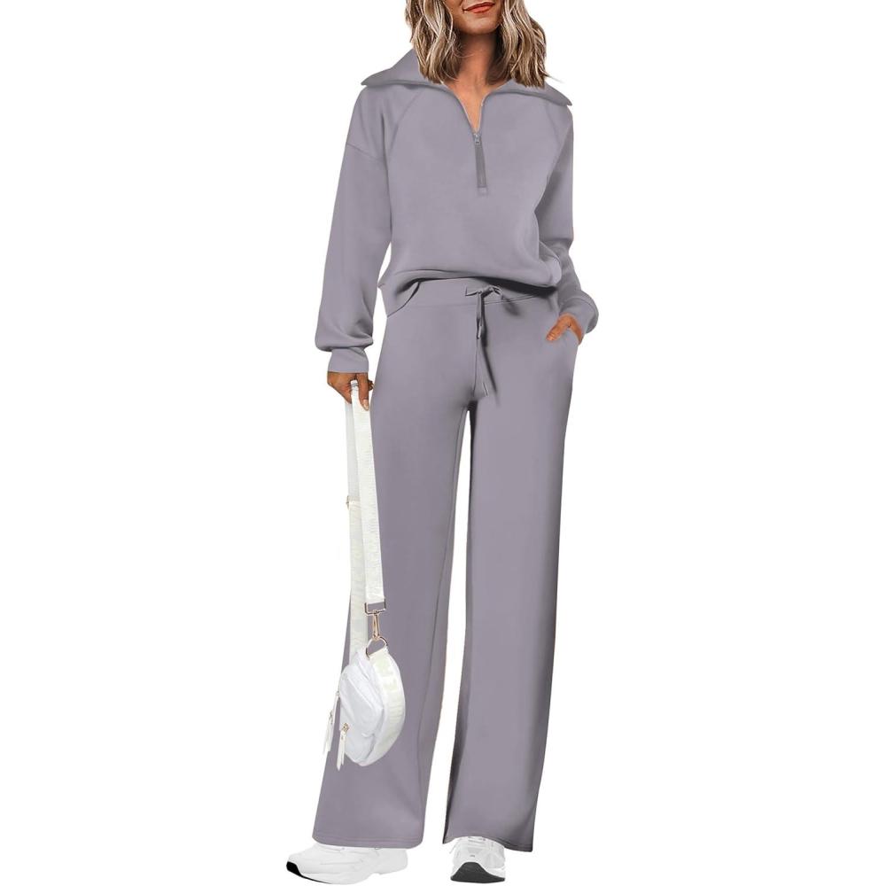PRETTYGARDEN Women’s 2 Piece Outfits Casual Lapel Half Zip Sweatshirts And Wide Leg Pants Tracksuit Sets(Grey)