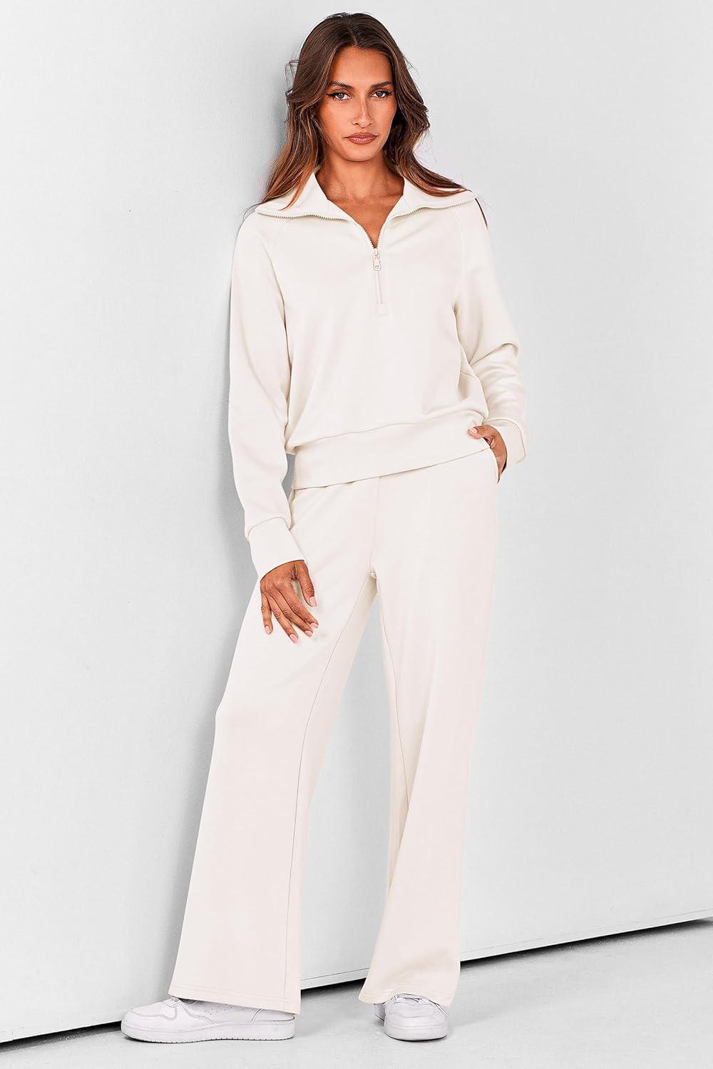PRETTYGARDEN Women’s 2 Piece Outfits Casual Lapel Half Zip Sweatshirts And Wide Leg Pants Tracksuit Sets(White)