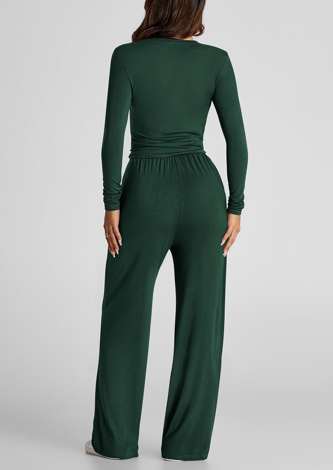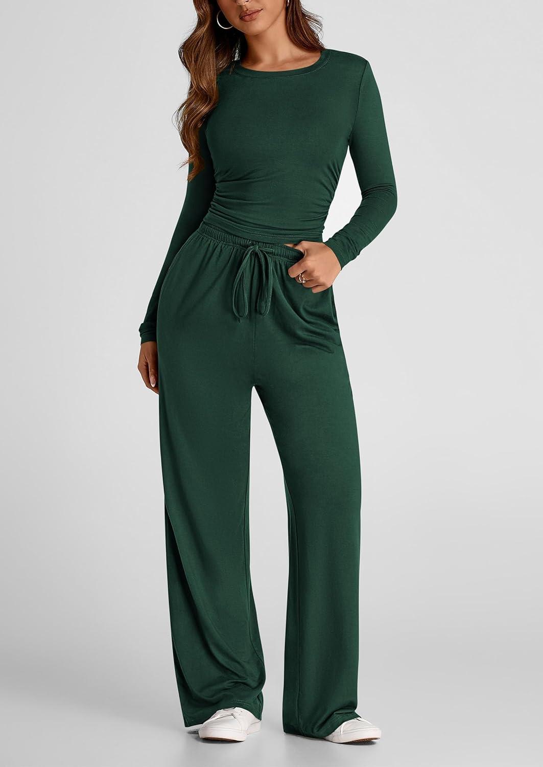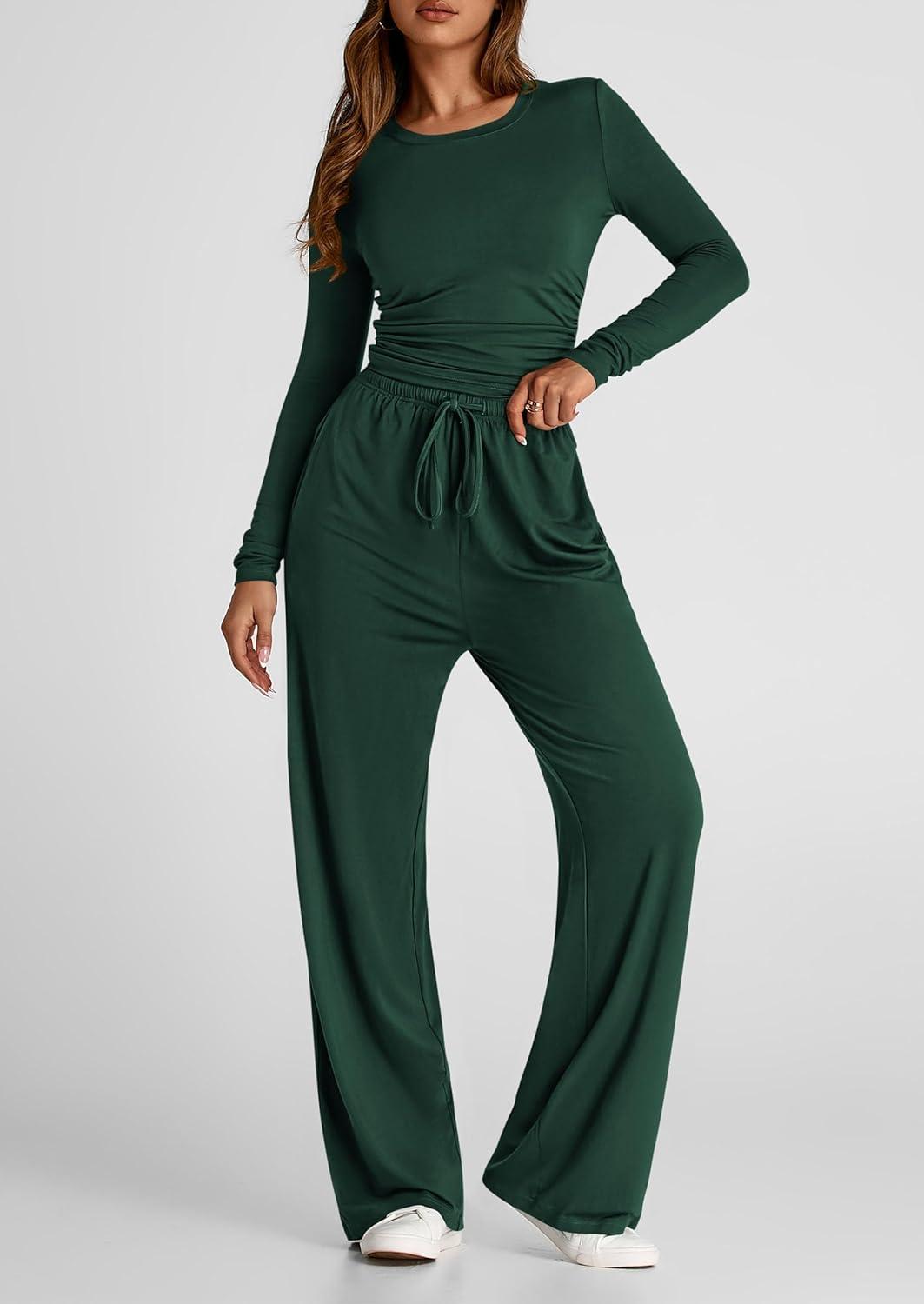 PRETTYGARDEN Women’s 2 Piece Outfits Fall Tracksuits Long Sleeve Crop Tops Wide Leg Pants Spring Matching Lounge Travel Sets(Dark Green)
